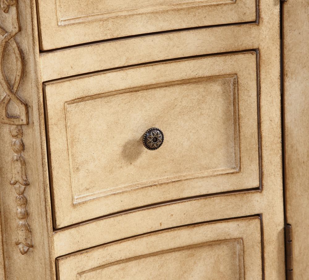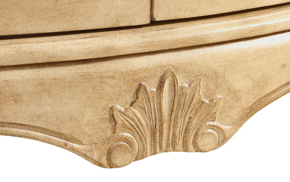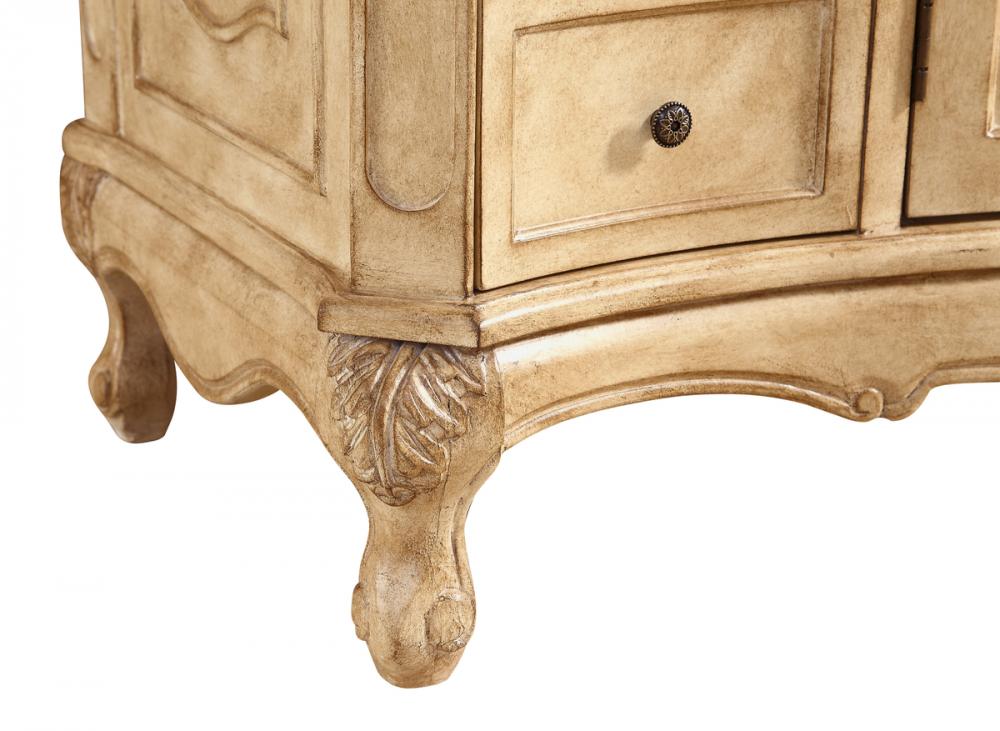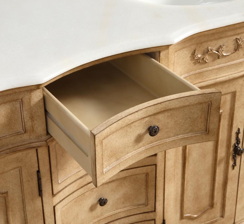 This superb balance of timeless tradition and opulent beauty in a marble-topped vanity will certainly enhance the aesthetics of any home or office bathroom! Featuring an authentic natural white marble countertop—occasionally with light brown veining, complimenting the hand painted antique beige cabinet—oval white porcelain under mount sink, 2 doors and 8 drawers, as well as antique bronze finish door knobs, a superbly carved floral design, stands on stylishly carved solid wood French scroll feet. A truly rich statement of luxury! Measurements: W48” x D21” x H35”, fully assembled.