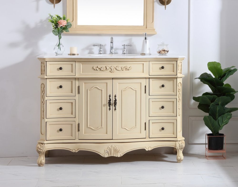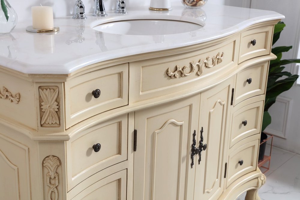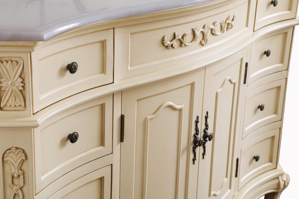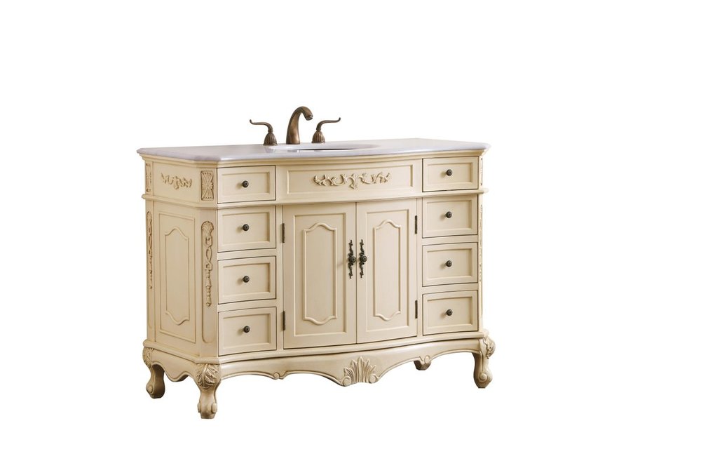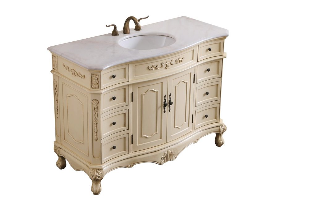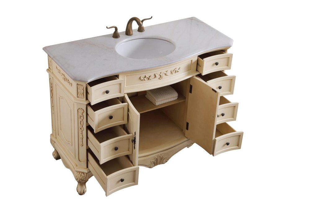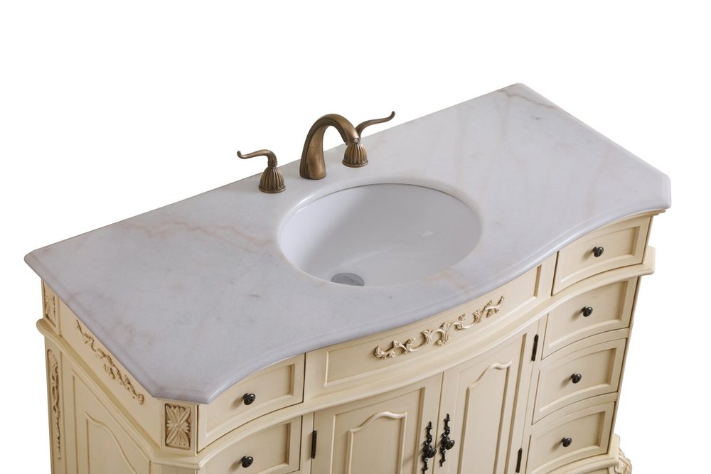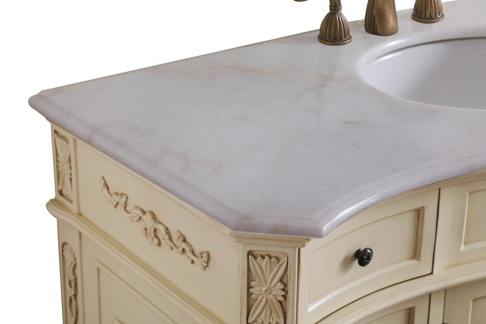 This superb balance of timeless tradition and opulent beauty in a marble-topped vanity will certainly enhance the aesthetics of any home or office bathroom! Featuring a white marble countertop—occasionally with light brown veining, complimenting the hand painted light tan finished cabinet—oval white porcelain under mount sink, 2 doors and 8 drawers, as well as antique bronze finish door knobs, a superbly carved floral design, stands on stylishly carved solid wood French scroll feet. A truly rich statement of luxury! Measurements: W48” x D21” x H35”, fully assembled.