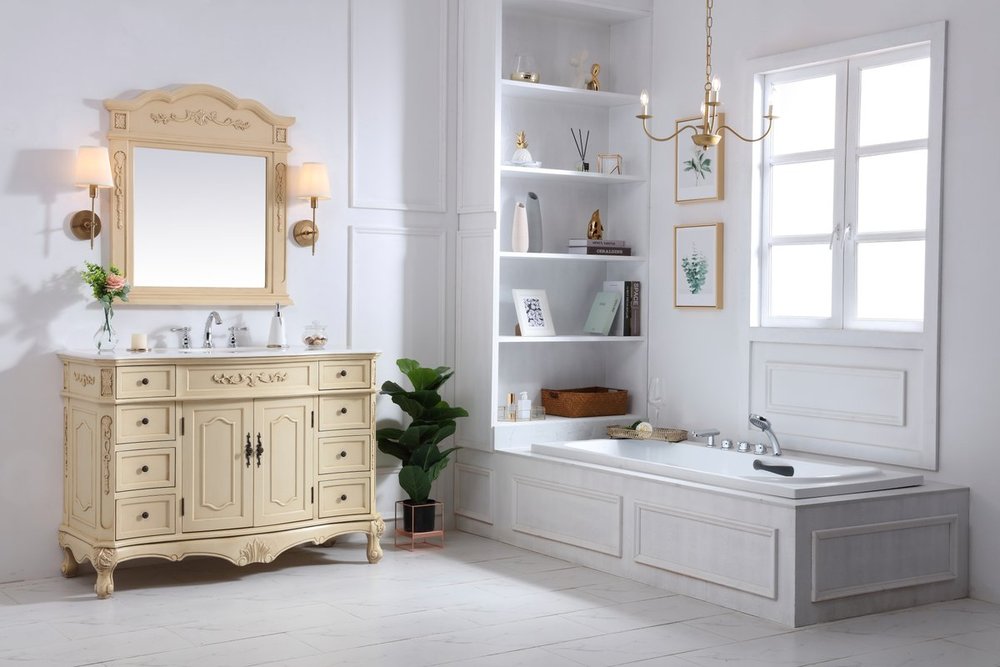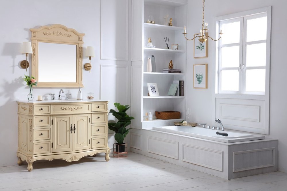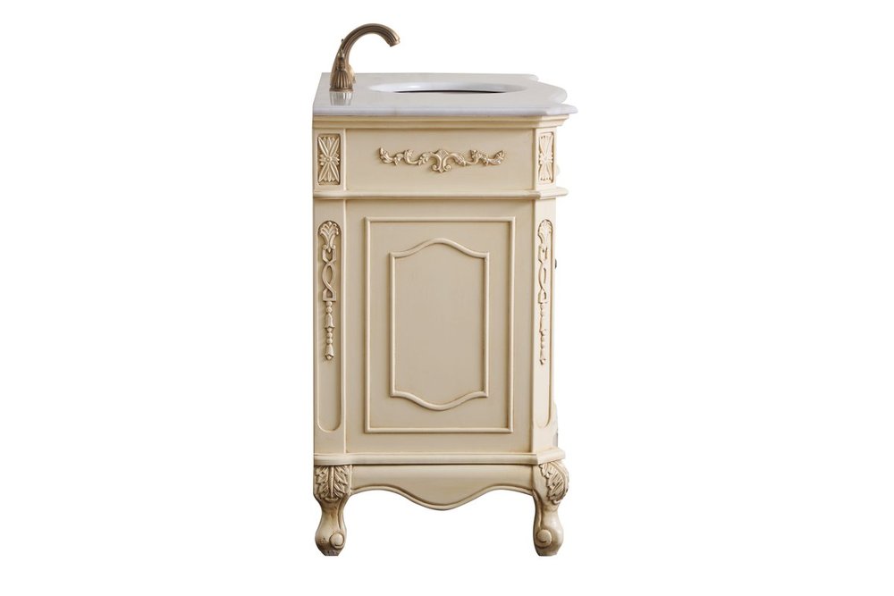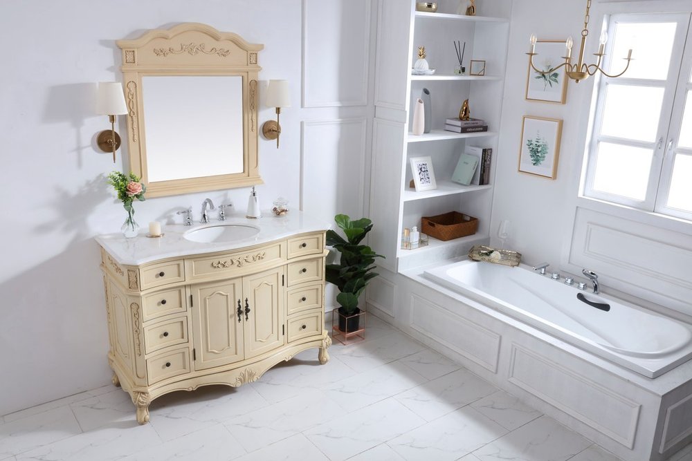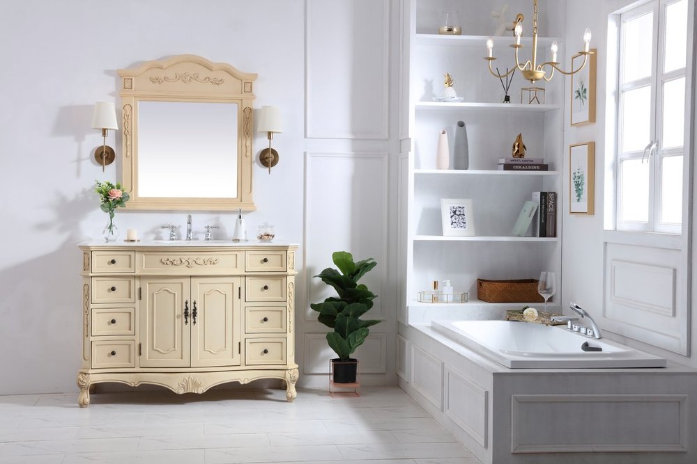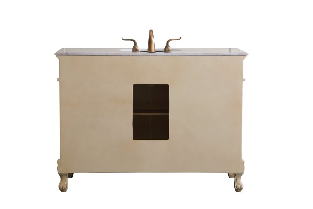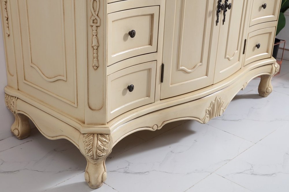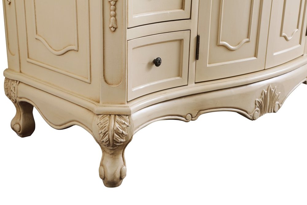 This superb balance of timeless tradition and opulent beauty in a marble-topped vanity will certainly enhance the aesthetics of any home or office bathroom! Featuring a white marble countertop—occasionally with light brown veining, complimenting the hand painted light tan finished cabinet—oval white porcelain under mount sink, 2 doors and 8 drawers, as well as antique bronze finish door knobs, a superbly carved floral design, stands on stylishly carved solid wood French scroll feet. A truly rich statement of luxury! Measurements: W48” x D21” x H35”, fully assembled.