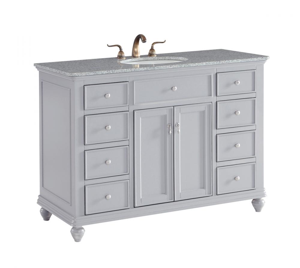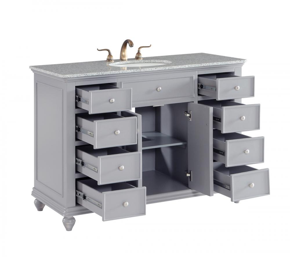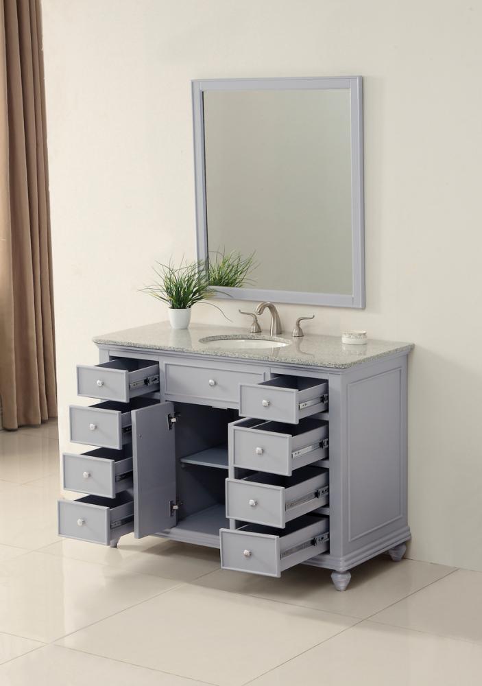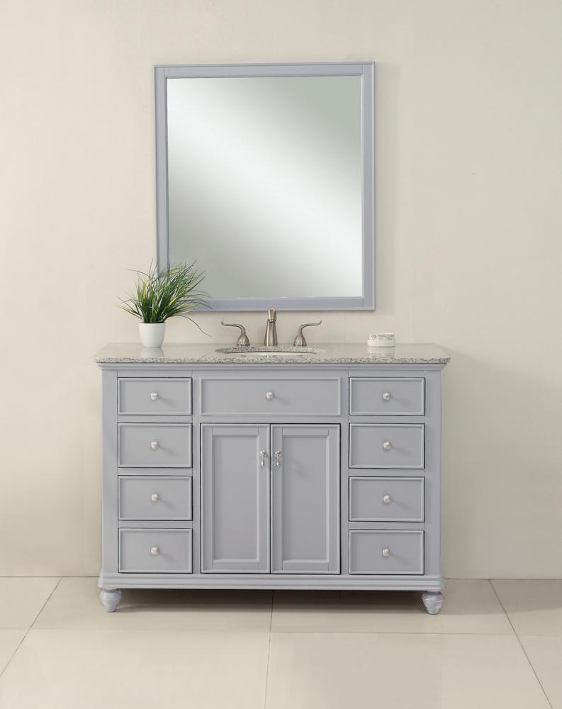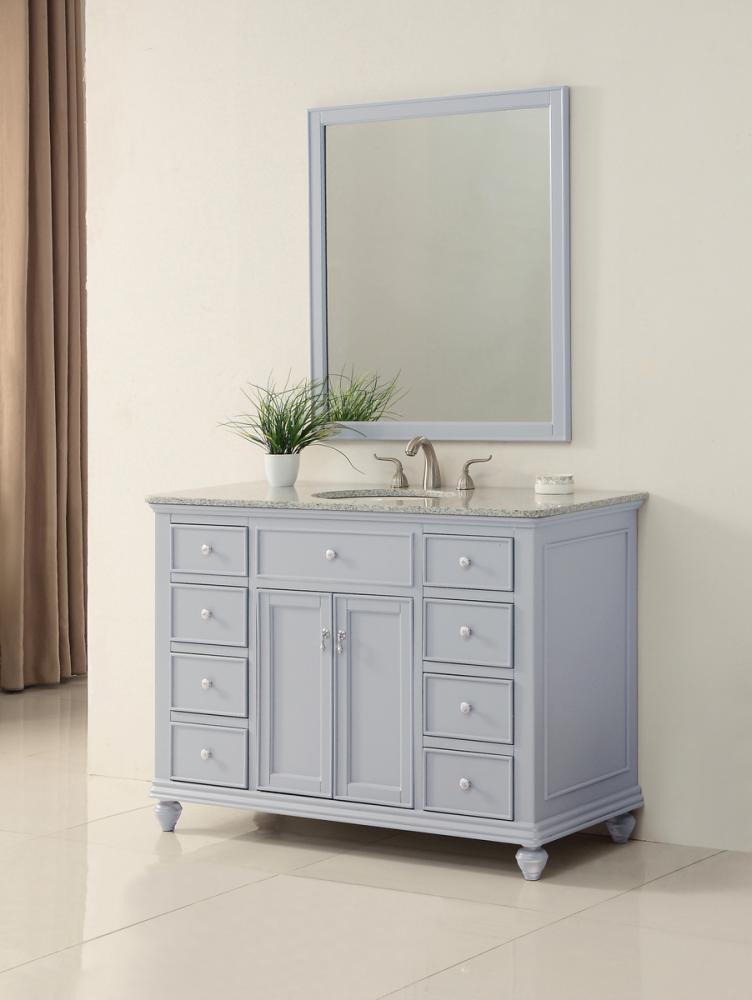 A sleekly styled 4 doors and 8 drawers, granite-topped bathroom vanity like this can only bring a smile of appreciation for its simple beauty and clean lines. With an authentic Kashmir white granite counter top, oval white porcelain sink, hand painted soft grey cabinet, 2 soft-close center doors with a shelf inside, 4 side drawers on each side, brushed steel hardware and carved bun feet, this elegant, transitional vanity balances form and function. Measurements: W48”xD21”xH35”