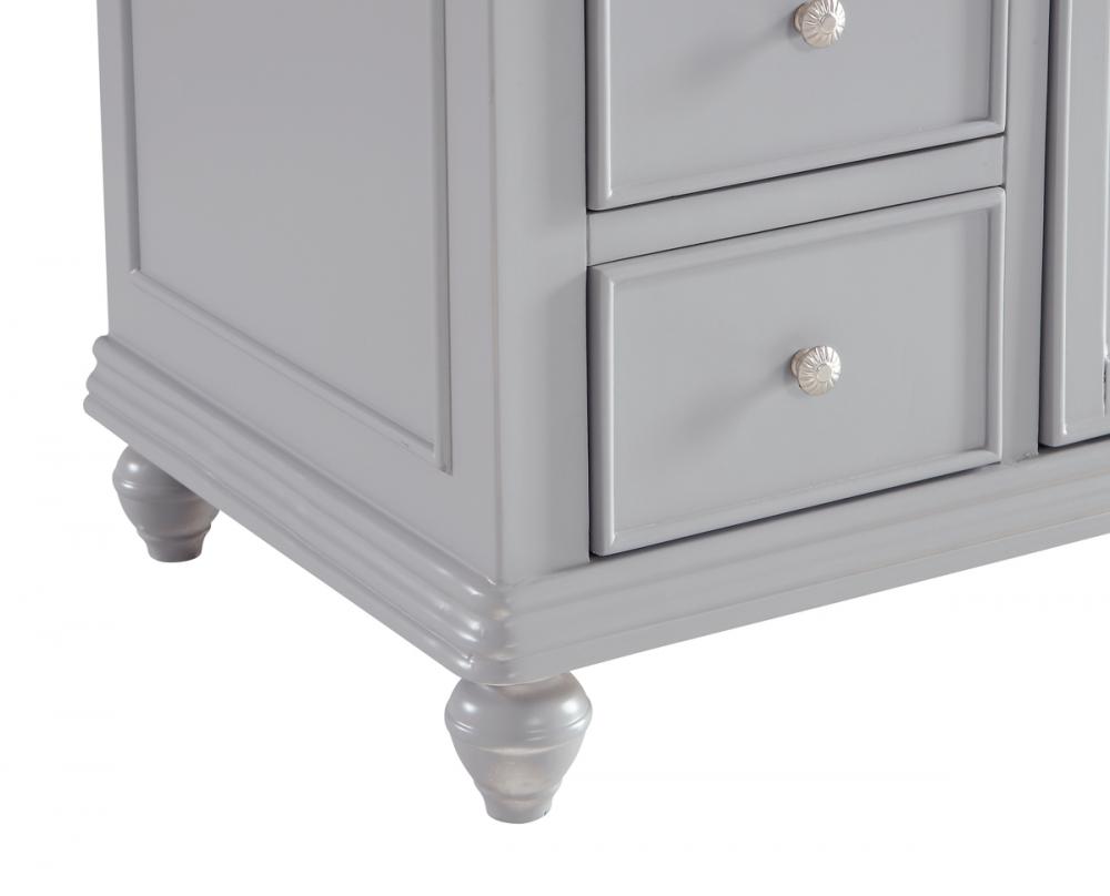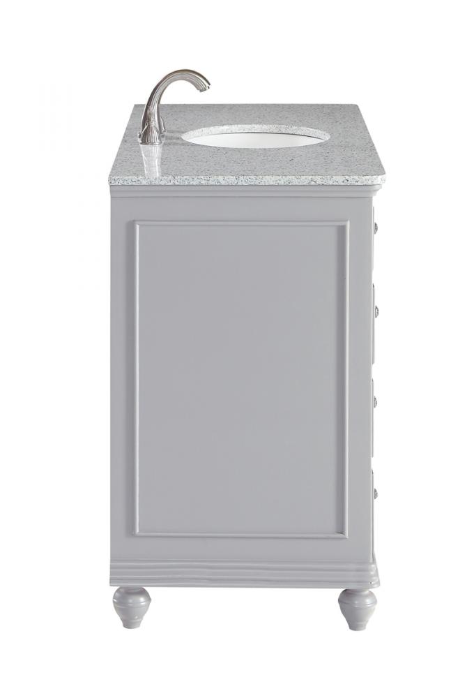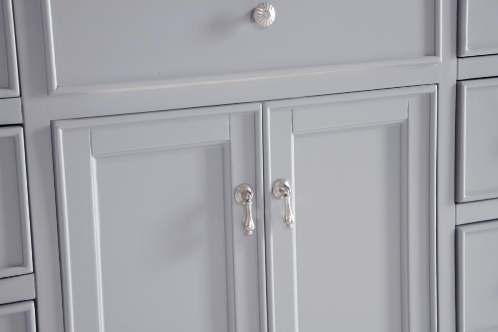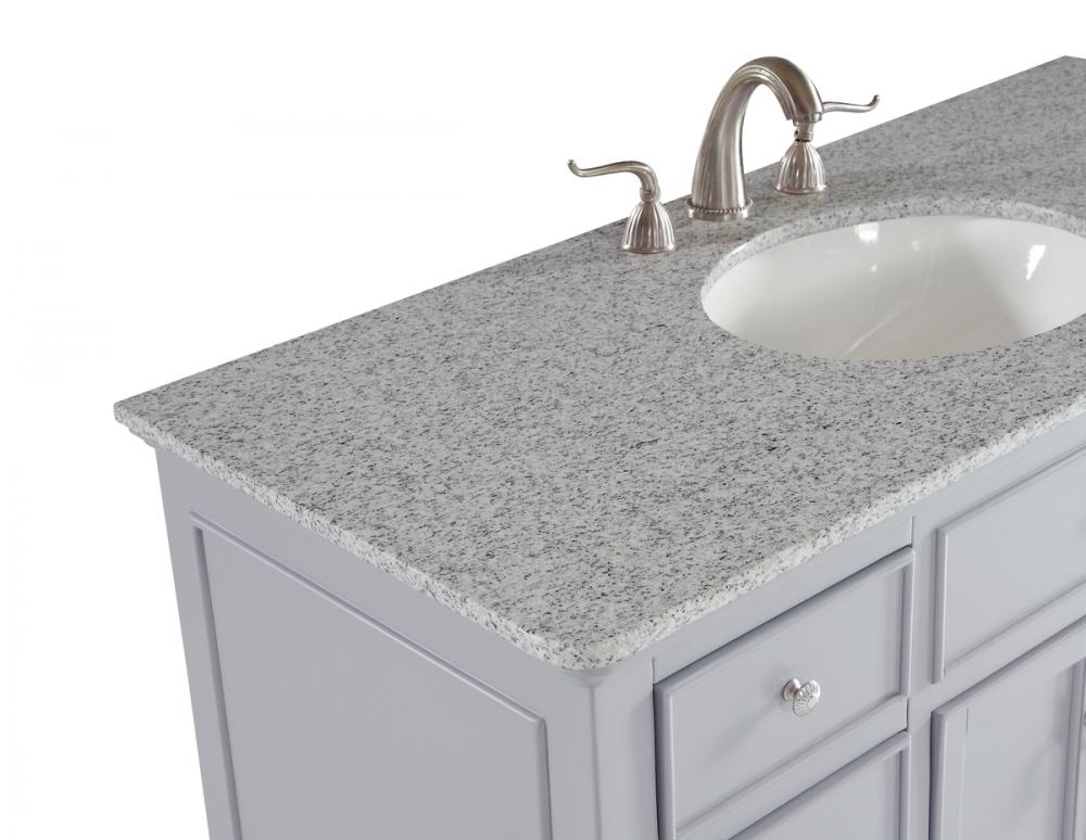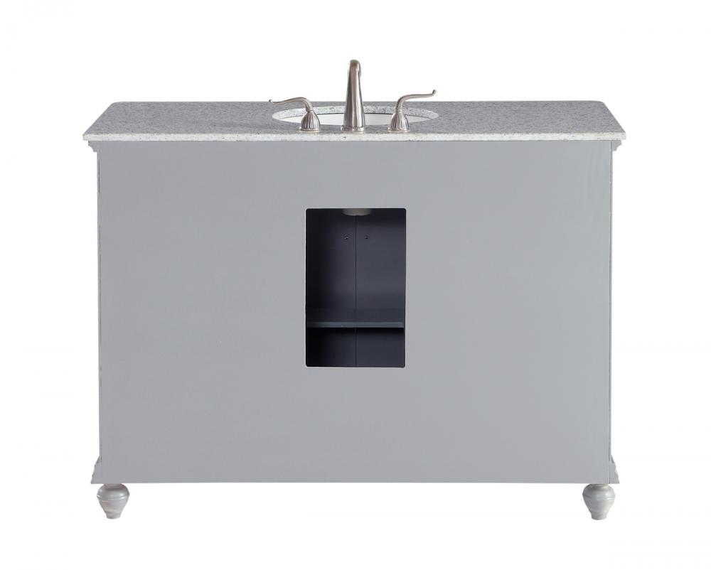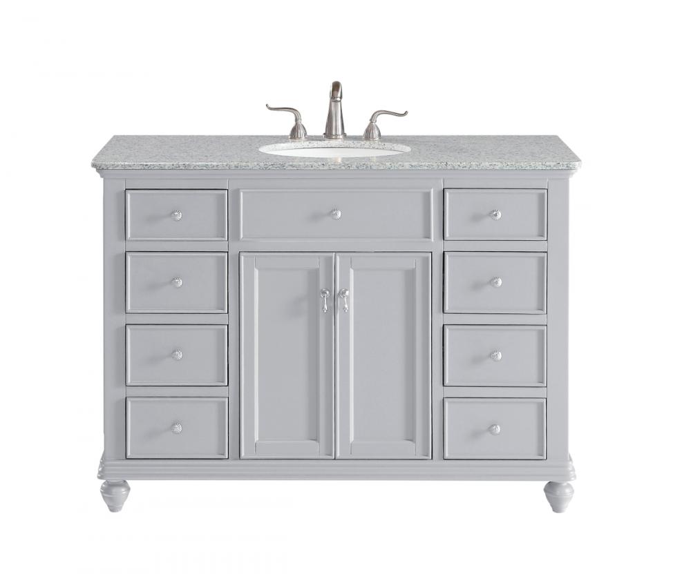 A sleekly styled 4 doors and 8 drawers, granite-topped bathroom vanity like this can only bring a smile of appreciation for its simple beauty and clean lines. With an authentic Kashmir white granite counter top, oval white porcelain sink, hand painted soft grey cabinet, 2 soft-close center doors with a shelf inside, 4 side drawers on each side, brushed steel hardware and carved bun feet, this elegant, transitional vanity balances form and function. Measurements: W48”xD21”xH35”