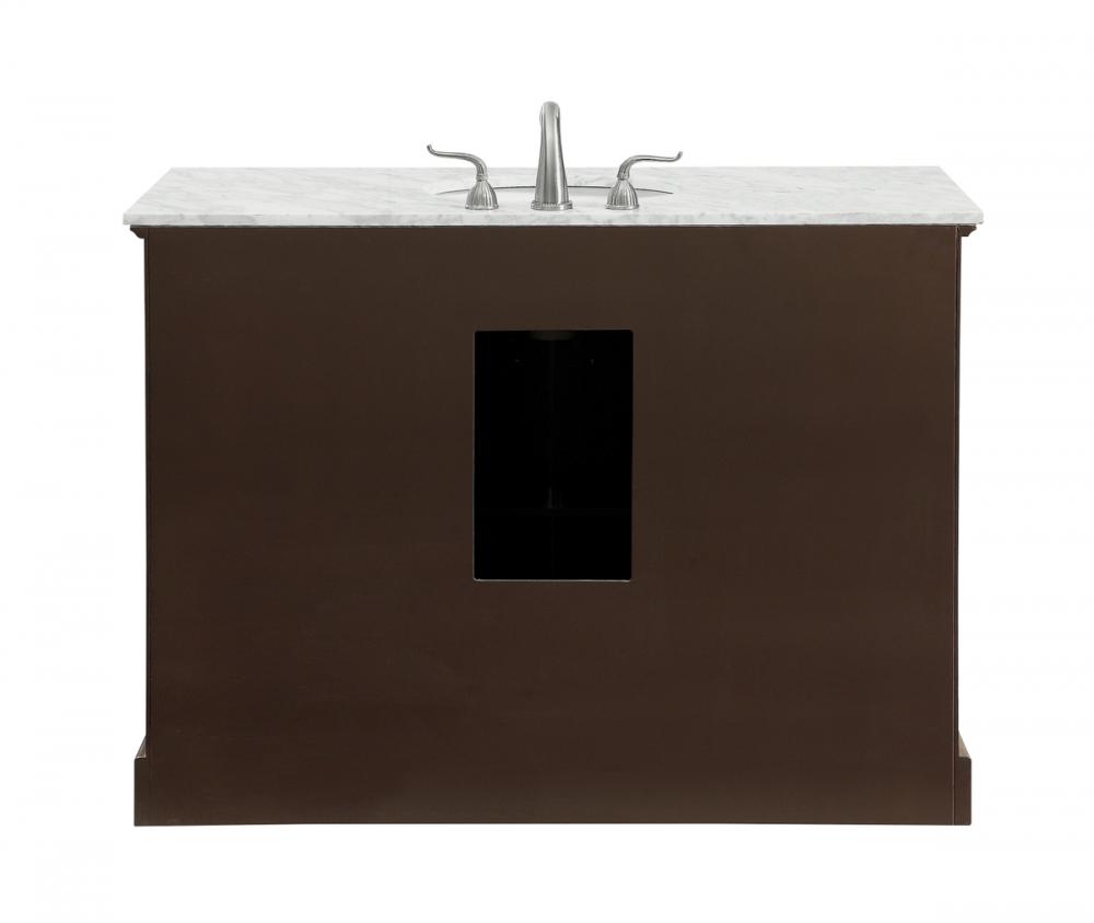From its Italian Carrara white marble top to its contemporary-styled hand painted teakwood cabinet, this member of our “Americana” vanity collection is sure to enhance either your home or office bathroom. Beneath its lustrous, natural marble top and an oval, white porcelain under mount sink, is a cabinet with 4 handsome drawers on each side and 2 center doors with a Single shelf for all your bathroom essentials, highlighted with recessed panel doors, brushed steel bar handle and knobs, stands on strong solid pedestal feet. A wonderful balance of simplicity and practical function! Measurements: W48”xD21.5”xH35”