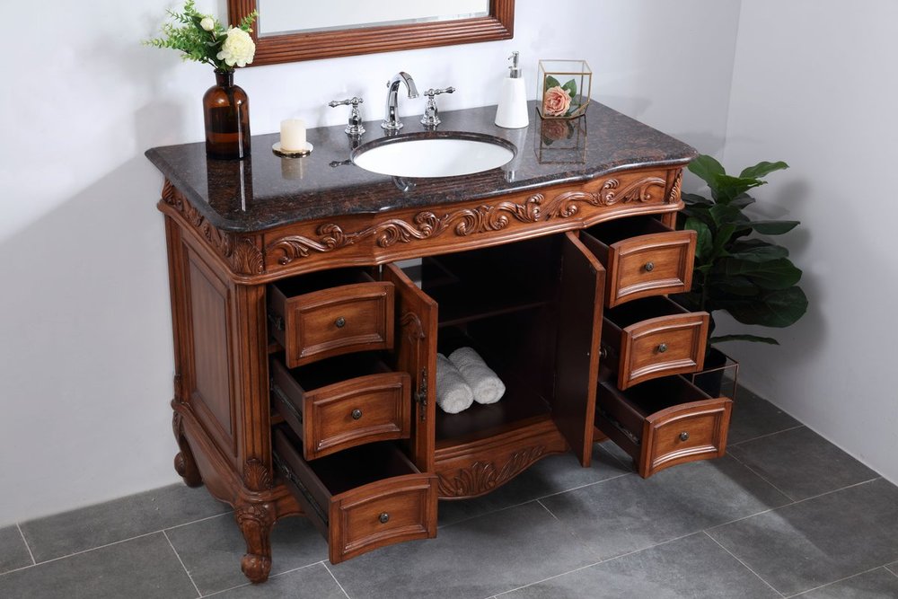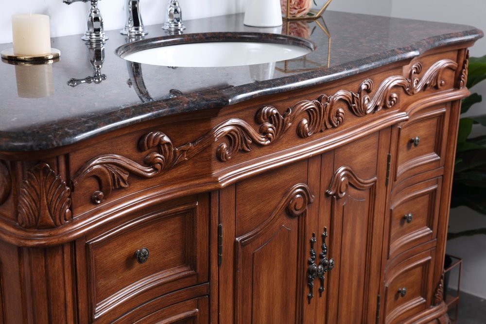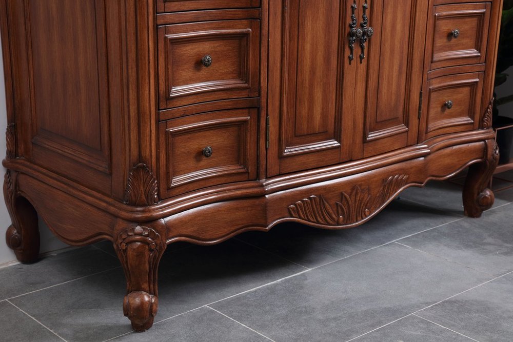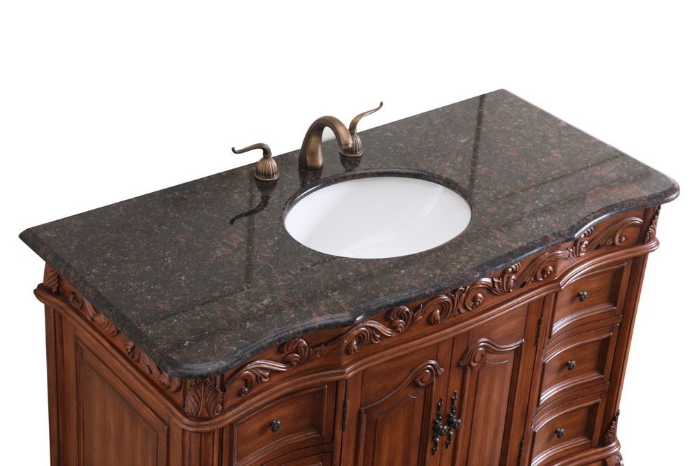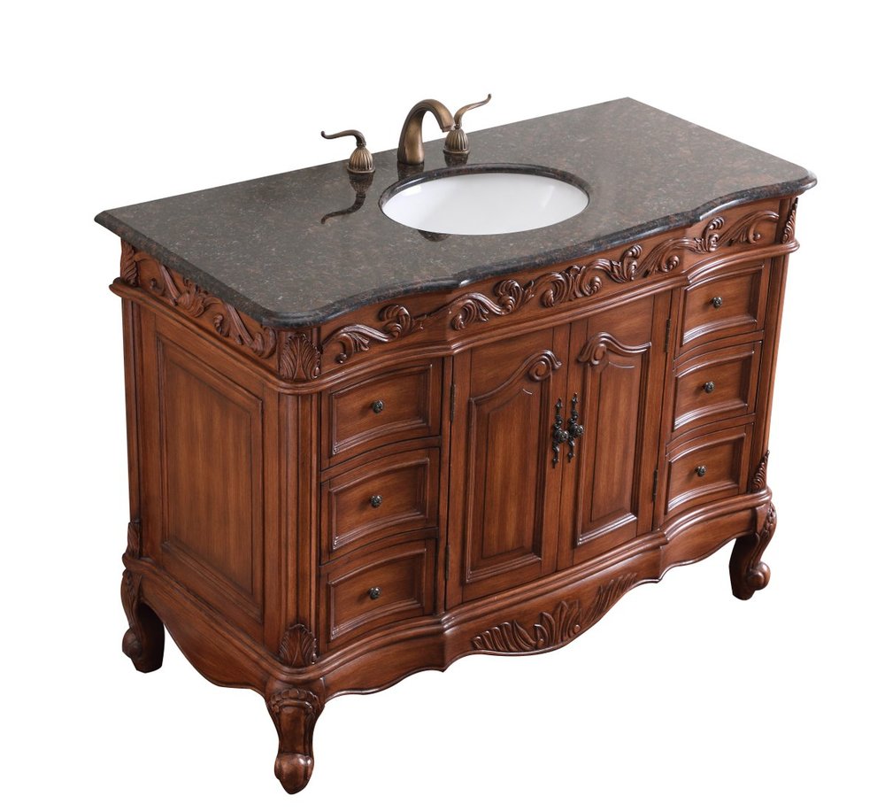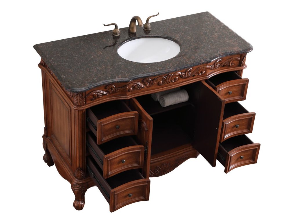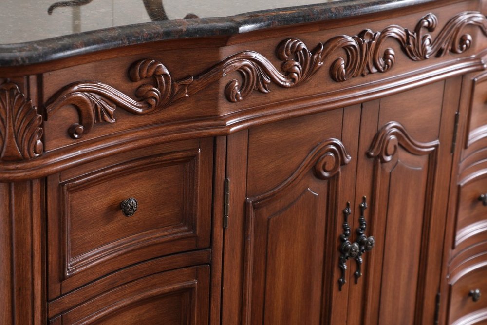 This superb balance of timeless tradition and opulent beauty in a granite-topped vanity will certainly enhance the aesthetics of any home or office bathroom! Featuring an exotic English cream granite countertop, complimenting the hand painted teak cabinet. With 2 doors and 6 drawers, as well as antique bronze finish door knobs, this superbly carved floral design, stands on stylishly carved solid wood French scroll feet made this a truly rich statement of luxury! Measurements: W48” x D22” x H35”, fully assembled.