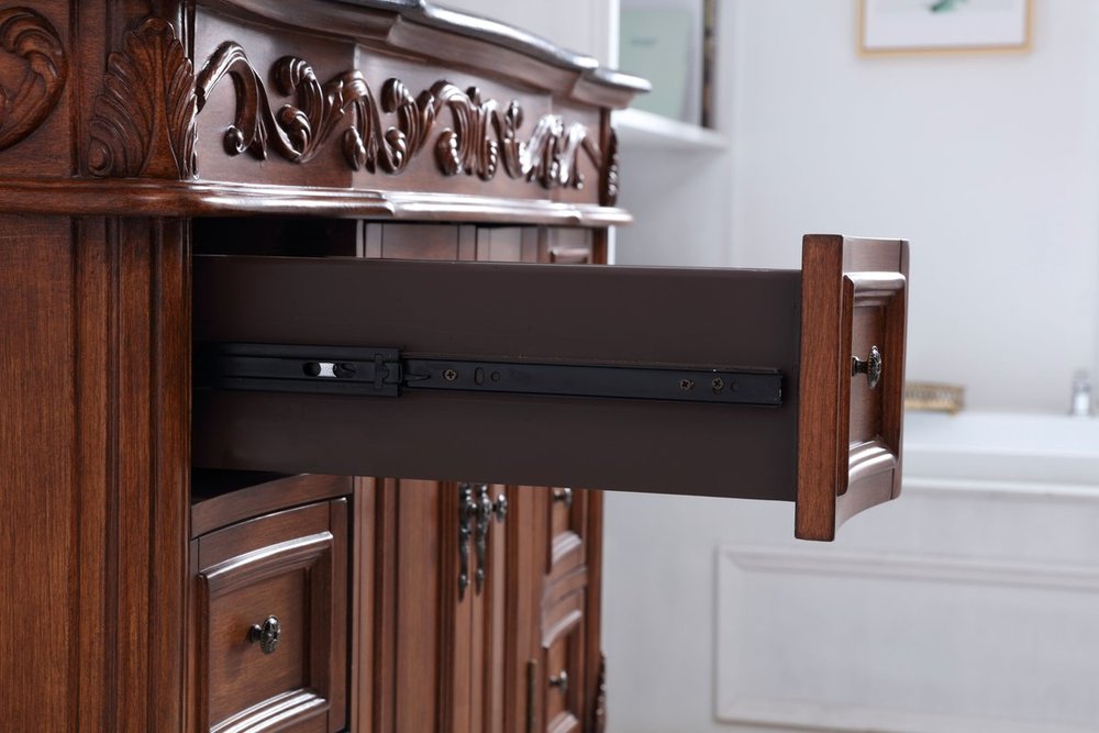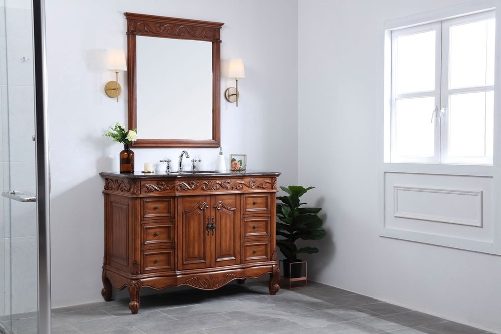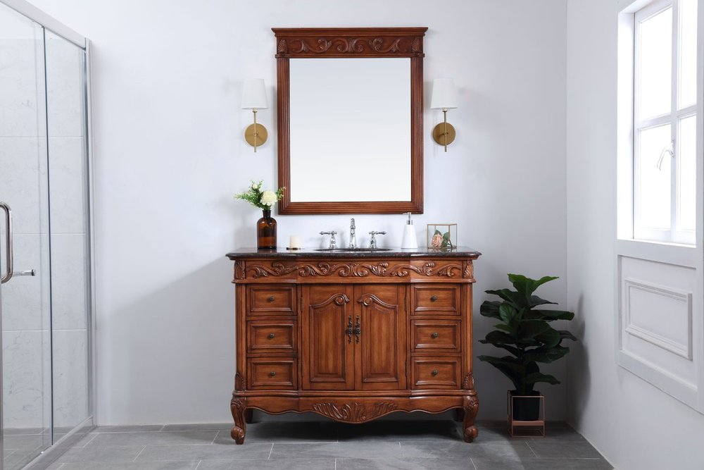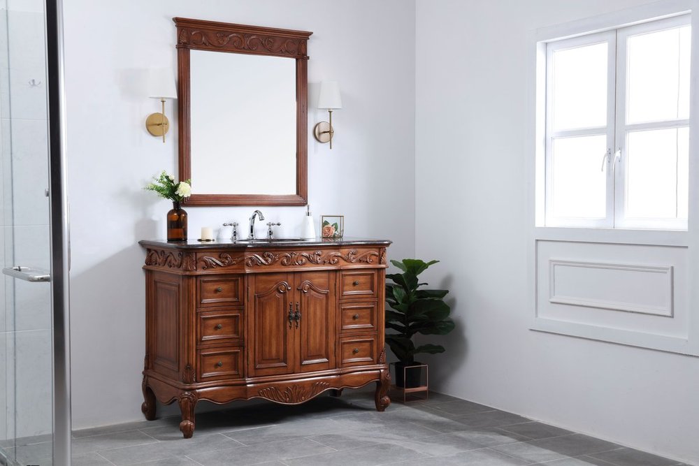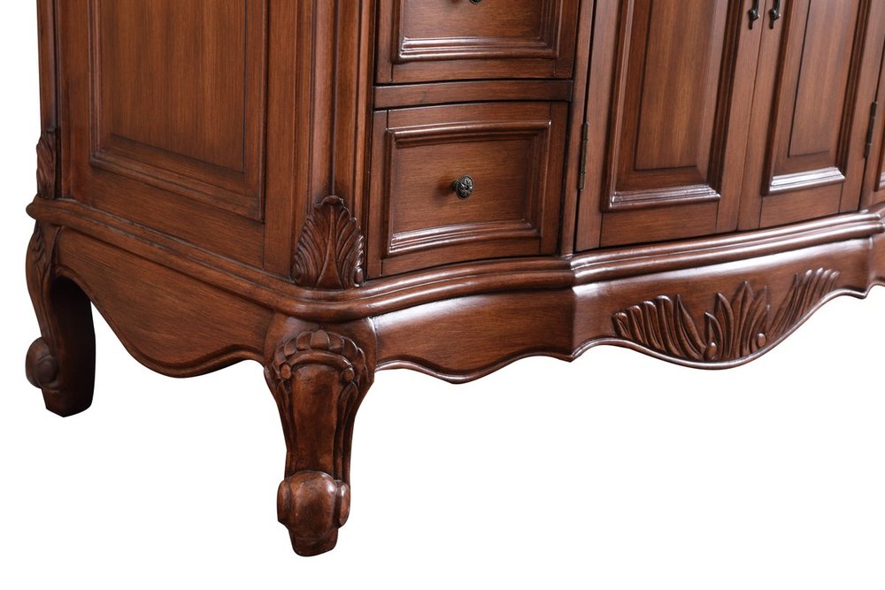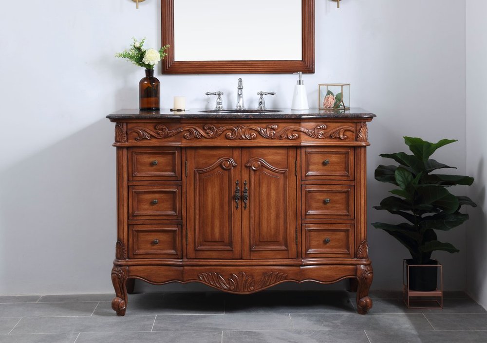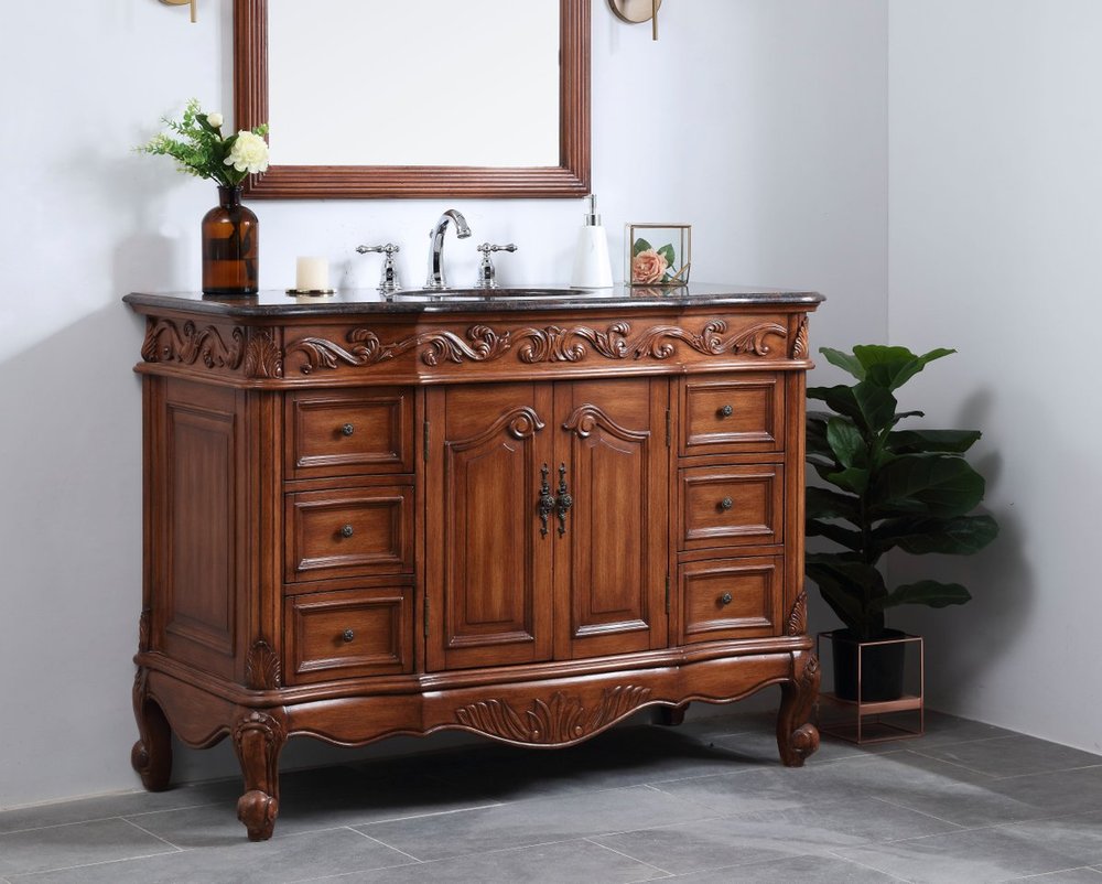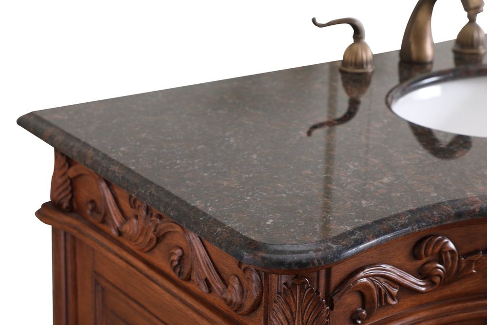 This superb balance of timeless tradition and opulent beauty in a granite-topped vanity will certainly enhance the aesthetics of any home or office bathroom! Featuring an exotic English cream granite countertop, complimenting the hand painted teak cabinet. With 2 doors and 6 drawers, as well as antique bronze finish door knobs, this superbly carved floral design, stands on stylishly carved solid wood French scroll feet made this a truly rich statement of luxury! Measurements: W48” x D22” x H35”, fully assembled.