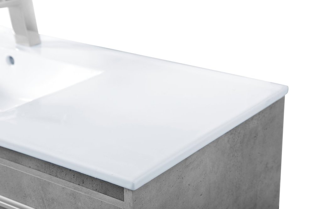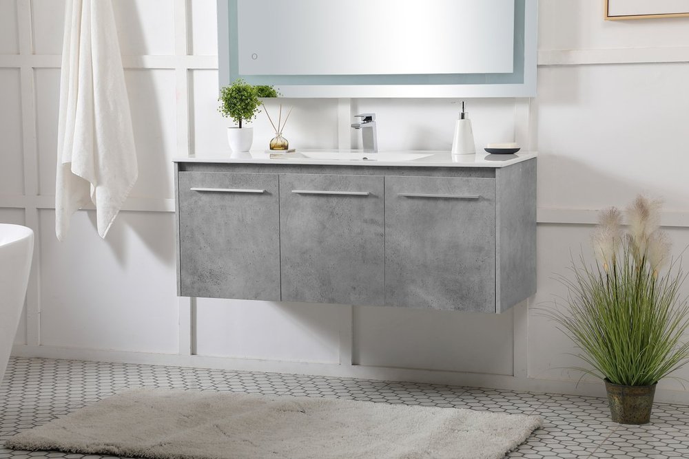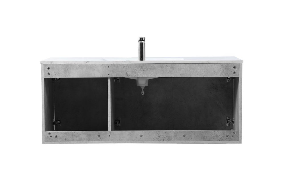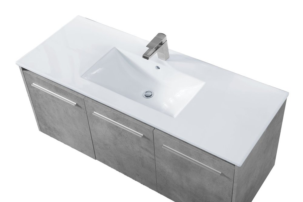The contemporary simplicity of this 48" floating vanity in a concrete grey finish will help open the space and add stunning modern flair to your bathroom or powder room. The open space below makes it easy to show off your tiles and to clean the floor with ease--it's also the perfect place for a hamper. 3 doors open to reveal plentiful of storage pace to store all of your bathroom miscellany. The clean lines that permeate through the design will surely create a fresh look in your home.