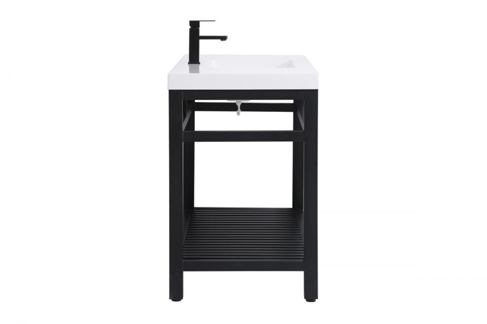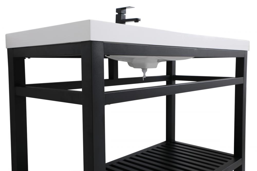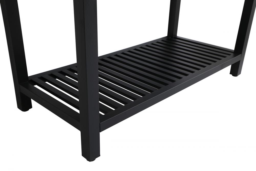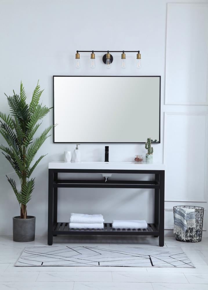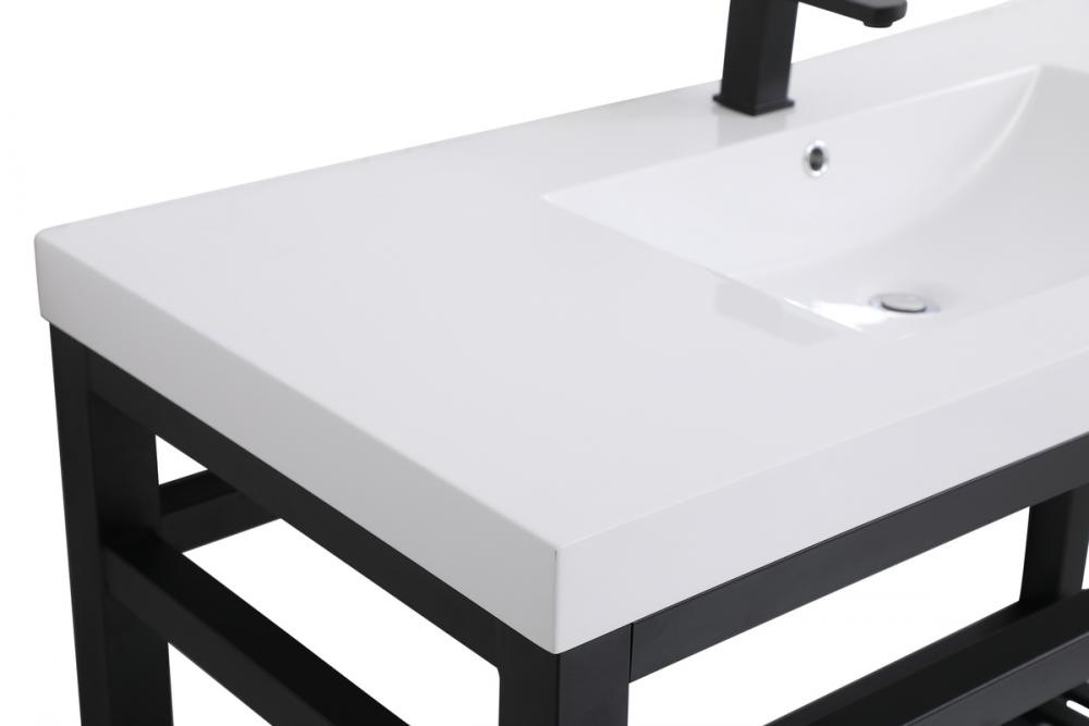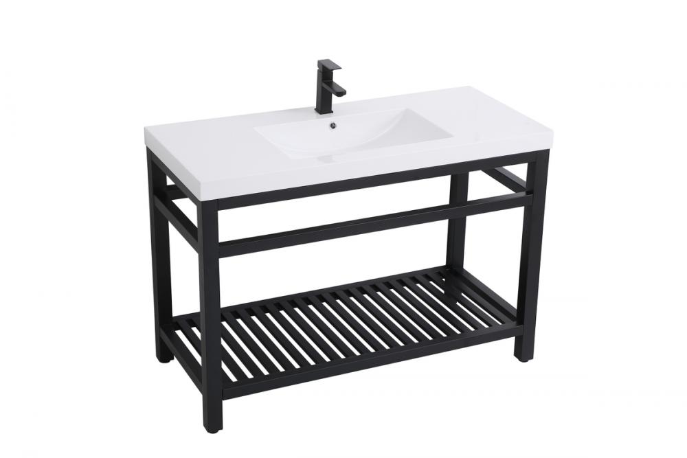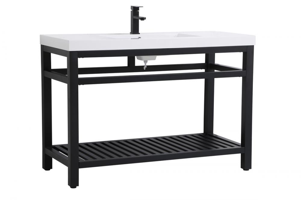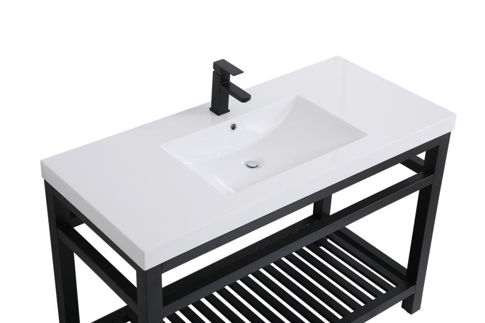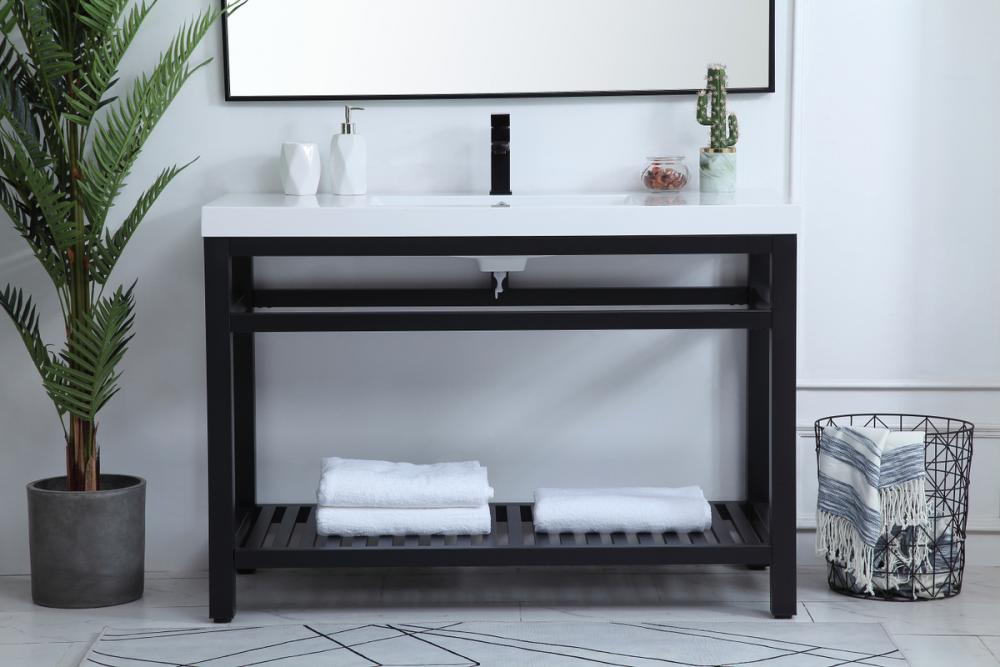 In true minimalistic spirit, this 48" vanity shines with pared down elegance. Bold clean lines build up the metal vanity, creating a modern simplicity that adds visual liveliness and complements any bathroom or powder room. The bottom shelf lets you put away any extra towels or bathroom essentials, and its shining white undermount sink creates contrast against the finish. Its bold graphic style will create a contemporary style in your home.