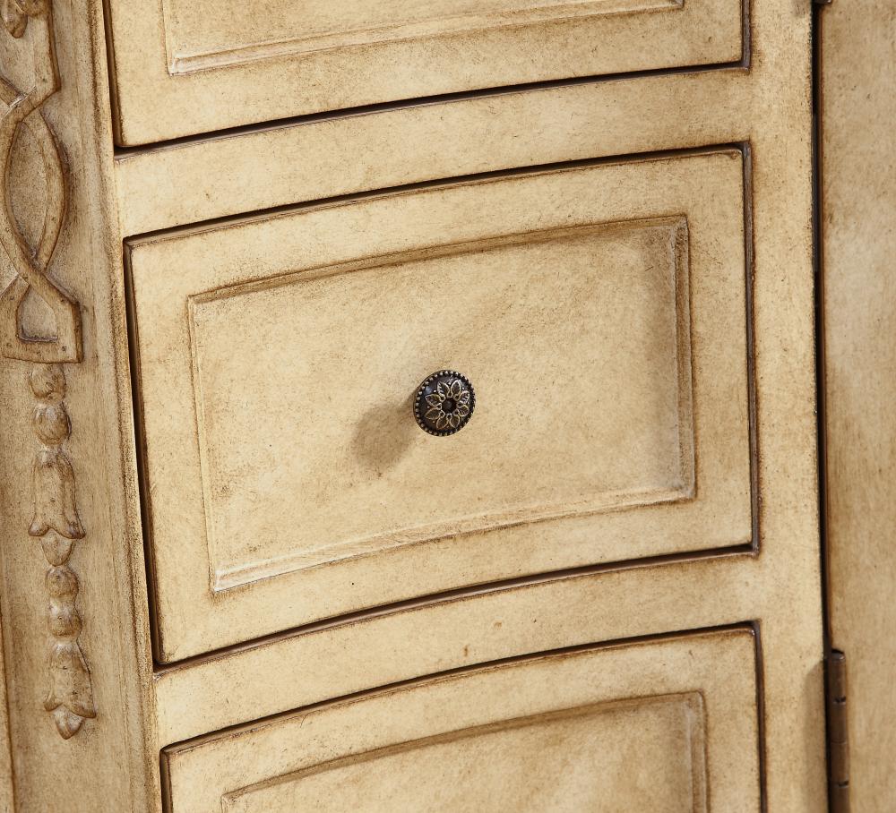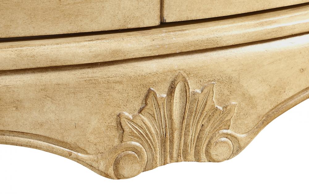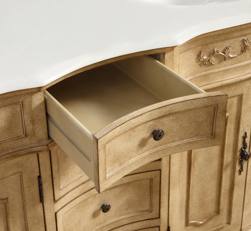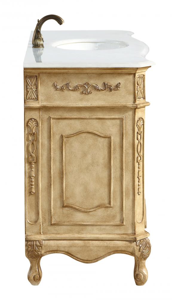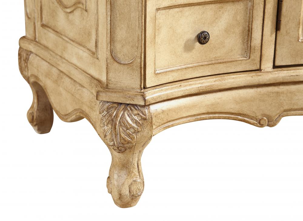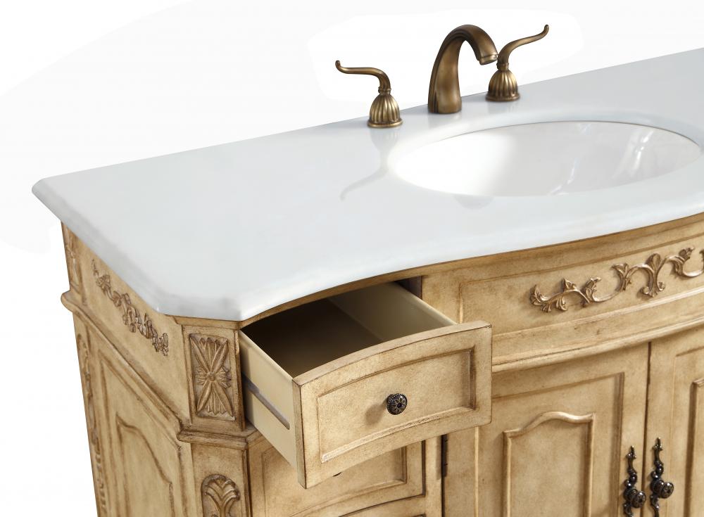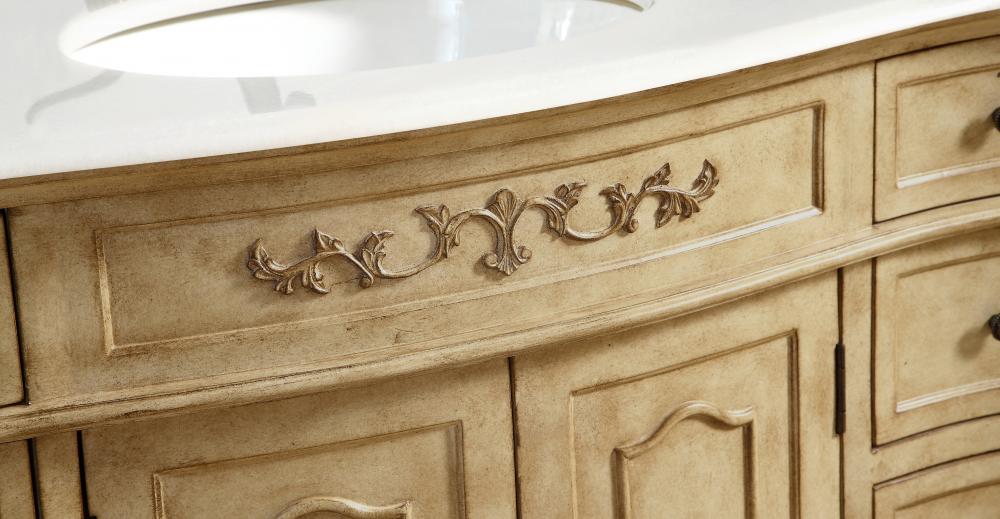 This superb balance of timeless tradition and opulent beauty in a engineered marble-topped vanity will certainly enhance the aesthetics of any home or office bathroom! Featuring an ivory white durable engineered marble countertop complimenting the hand painted cabinet with a delicate carved floral design, stands on stylishly carved solid wood French scroll feet. Don't let the design fool you, the engineered marble countertop and porcelain undermount sink allows for space to get ready, while the antique bronze hardware allows you to discover storage spaces with ease. You and your guests will marvel at this vanity that will both store away your bathroom essentials and enhance the aesthetics of your room.