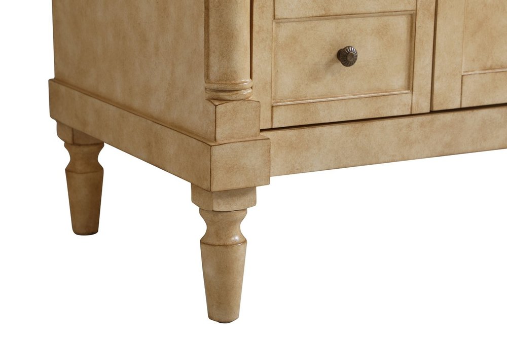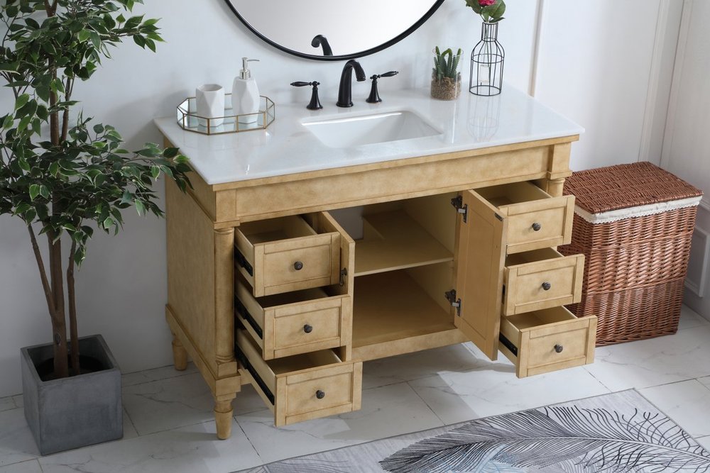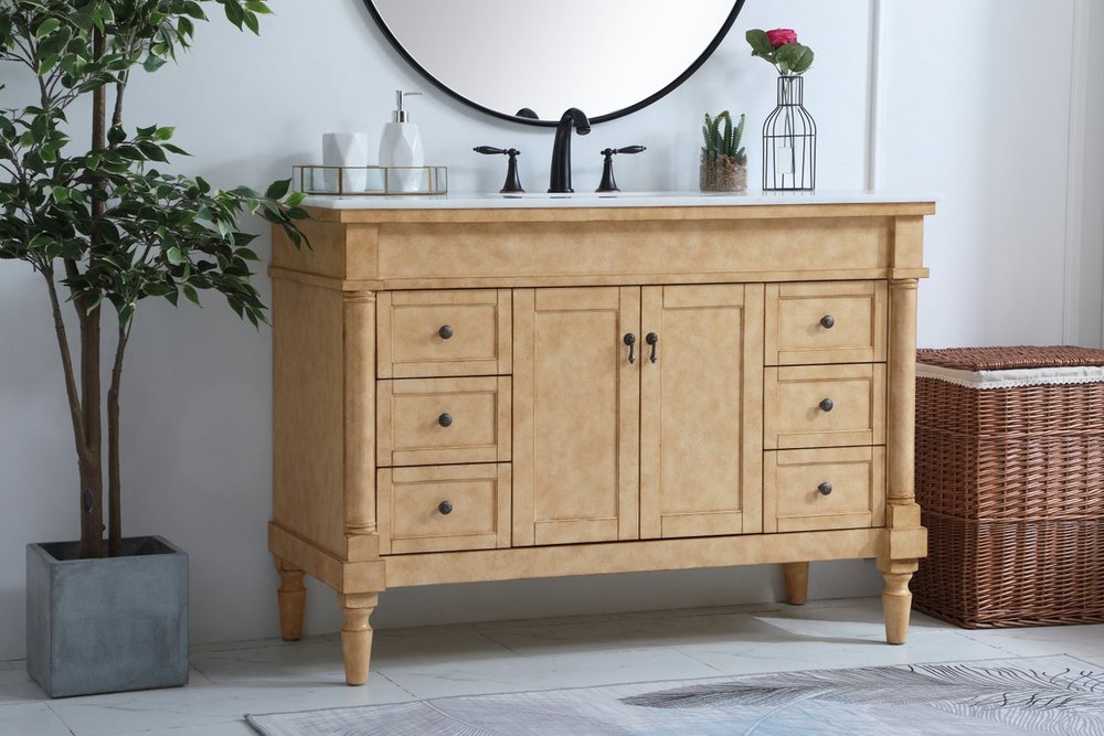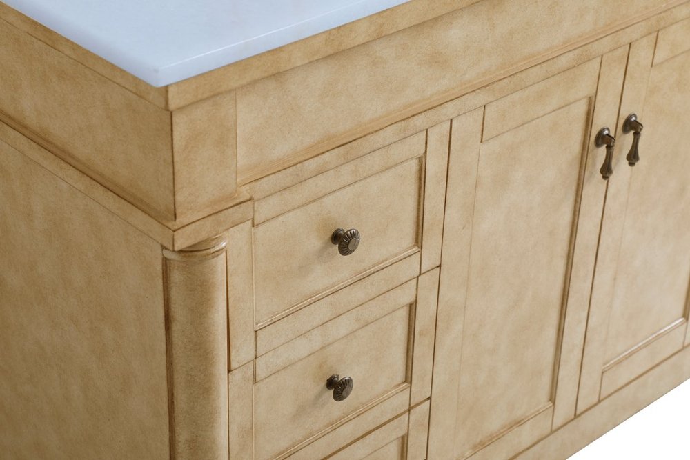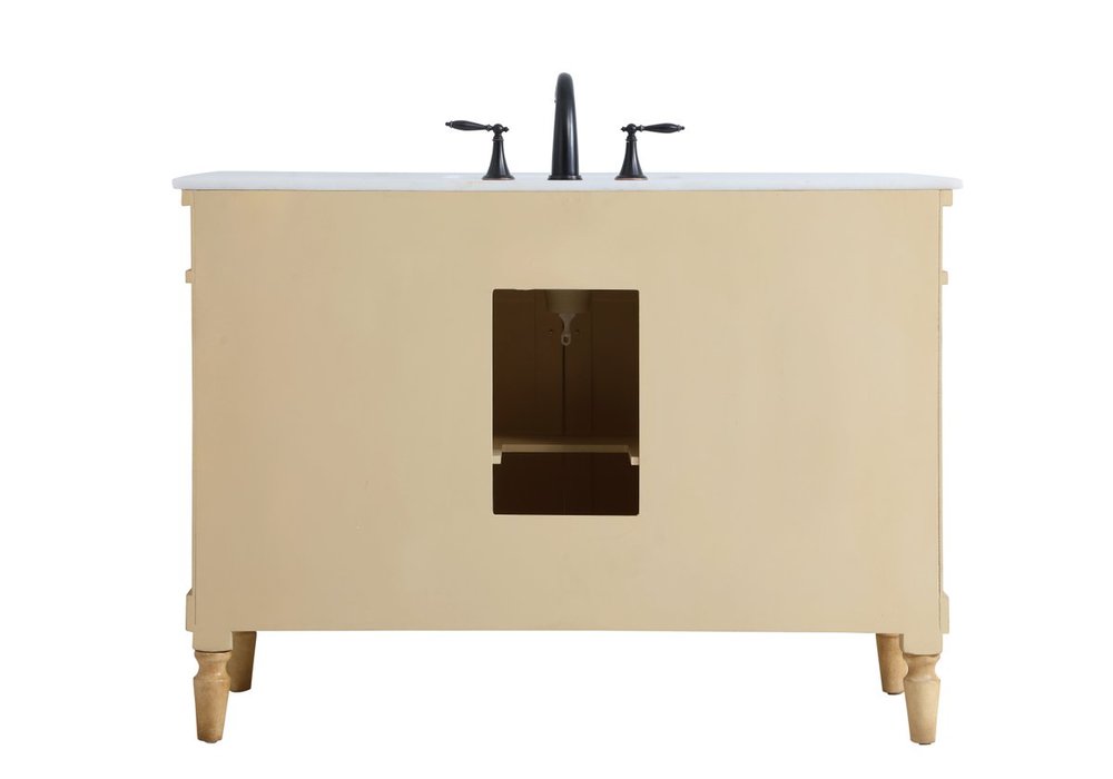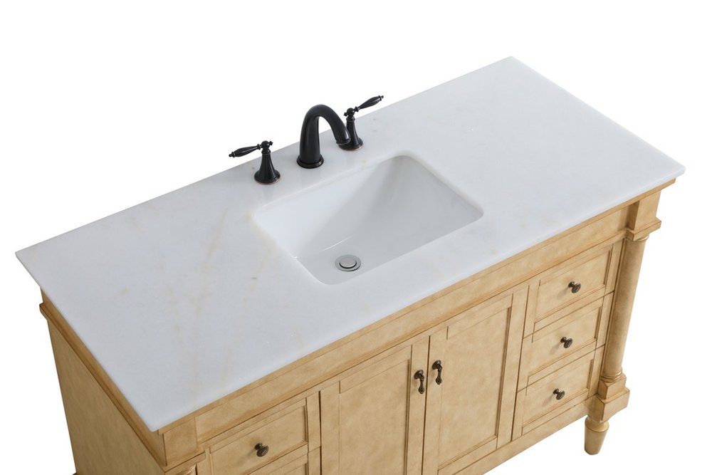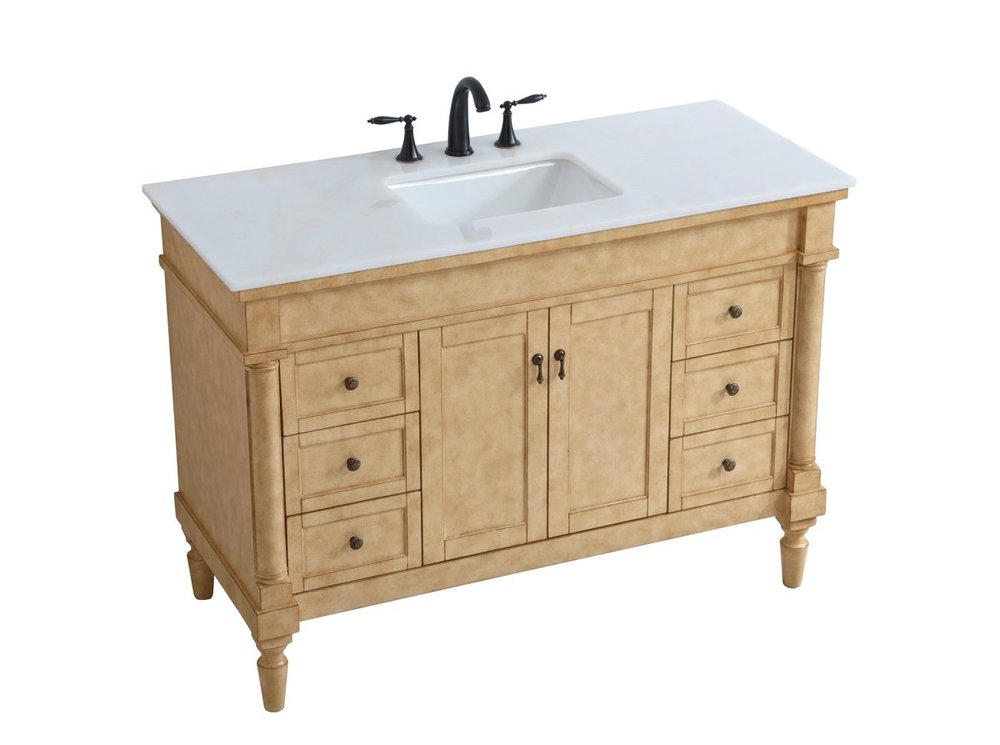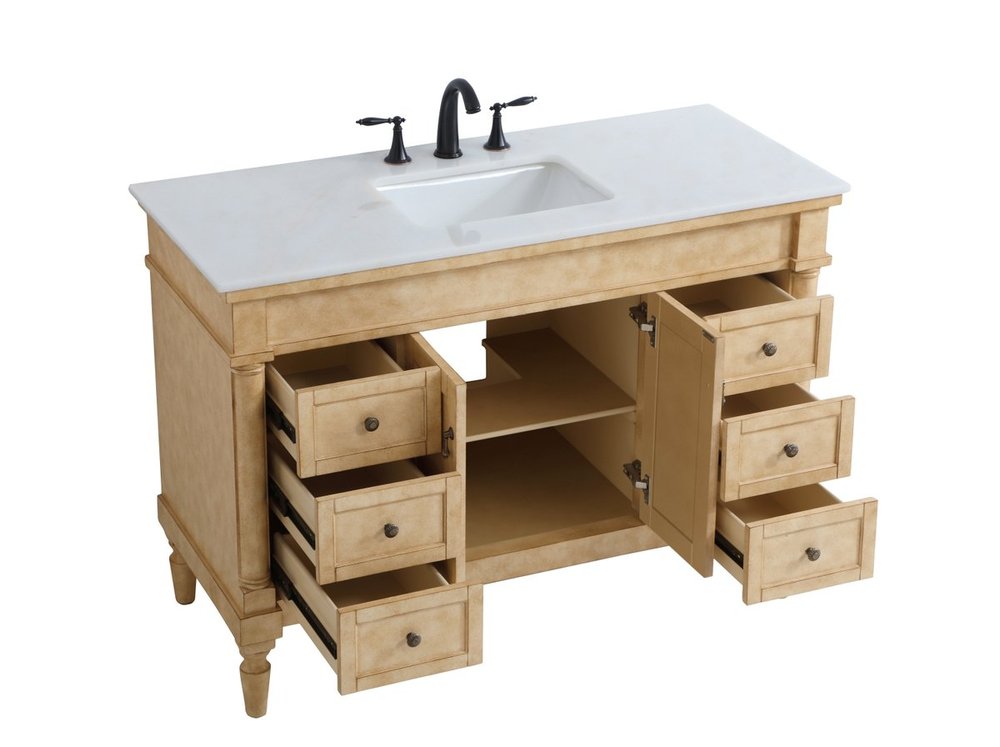The subtle beauty of the Lexington collection 48" vanity in an antique beige finish exudes comfortable luxury. Its modern, yet traditional beauty will surely dress up your bathroom or powder room without any fuss. The white marble countertop with occasional coffee color veins and porcelain undermount sink shows quiet opulence, and the legs support upright without fail. Antique bronze hardware complements the refined beige finish, with pulls adorning the two center cabinet doors and ornate knobs dressing the six side drawers, showcasing ample storage space within. Whether this vanity is in your bathroom or for guests, its presence will surely elevate the aesthetics of your room.