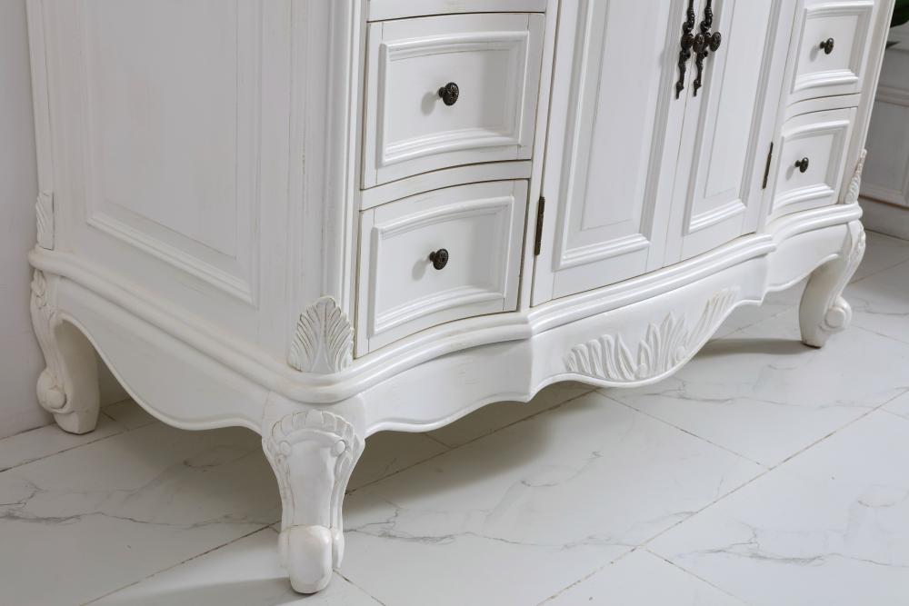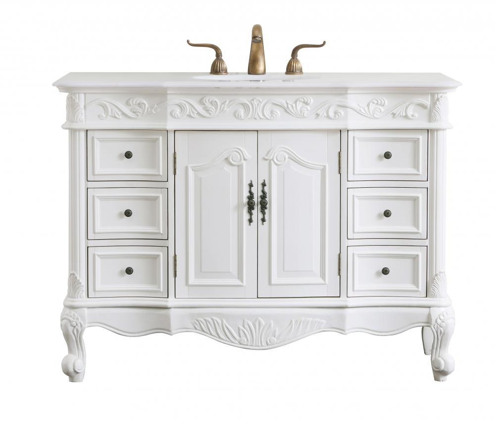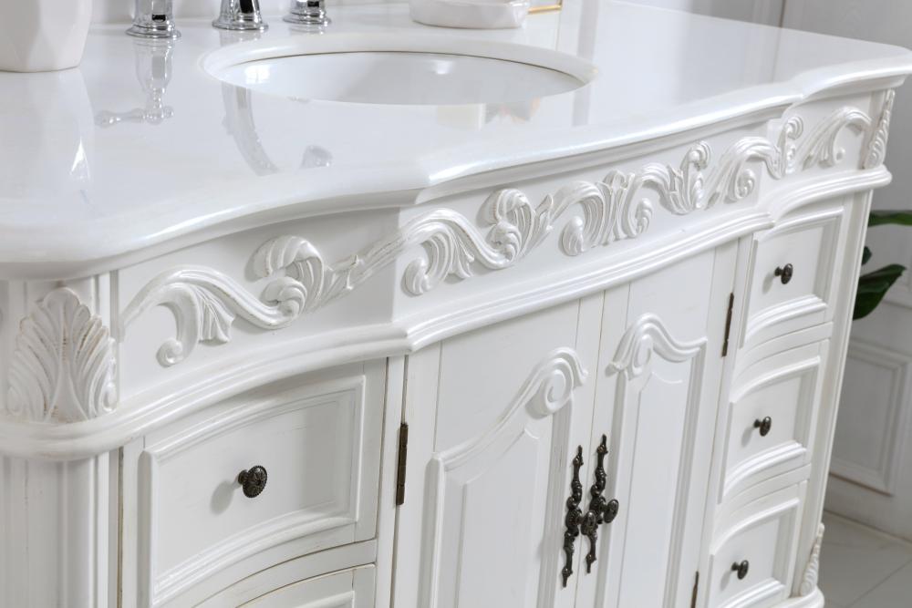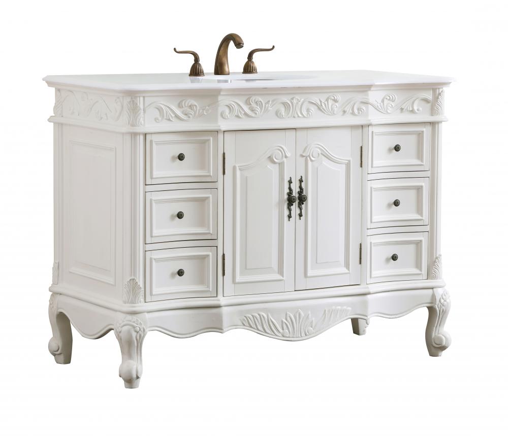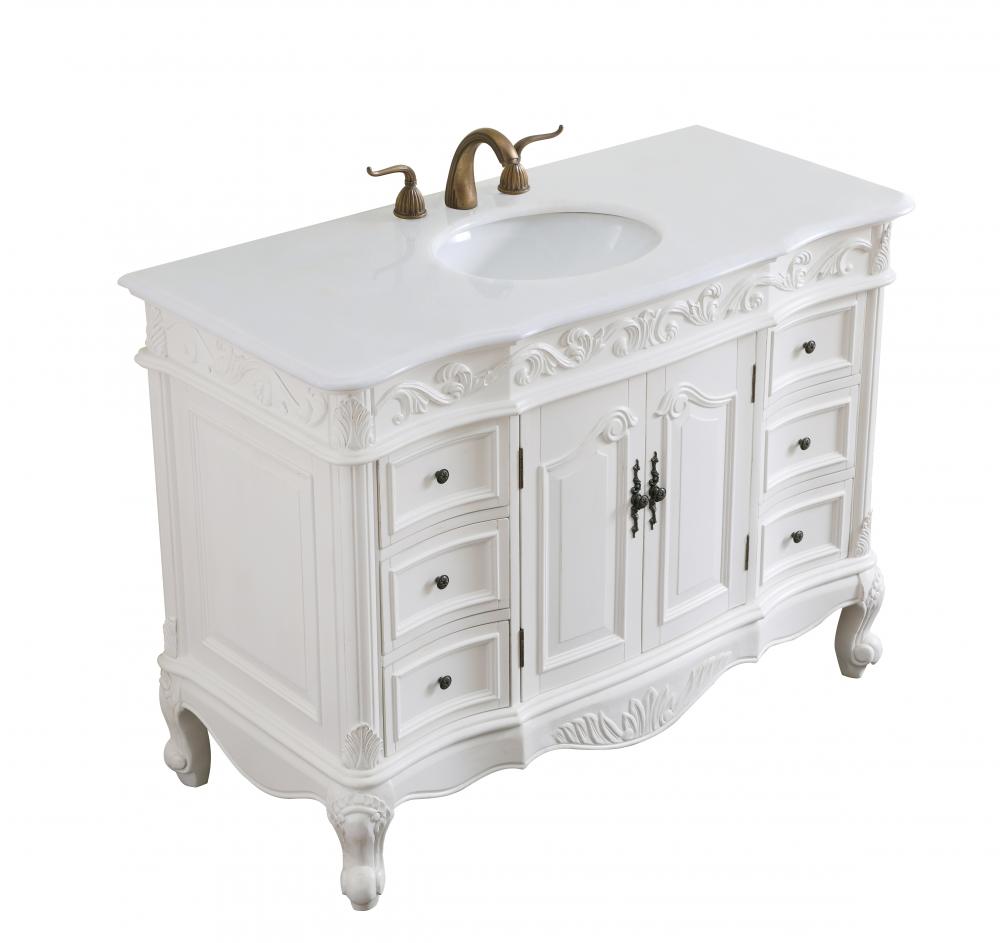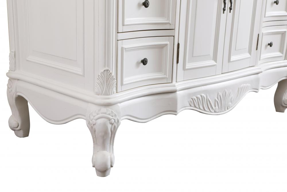 This superb balance of timeless tradition and opulent beauty in a traditional vanity will certainly enhance the aesthetics of any home or office bathroom! Featuring an ivory white engineered marble countertop complimenting the hand painted cabinet. With two doors and six drawers, as well as antique bronze finish door knobs, this superbly carved floral design, stands on stylishly carved solid wood French scroll feet. The vanity ships fully assembled with a convenient open access plumbing panel.