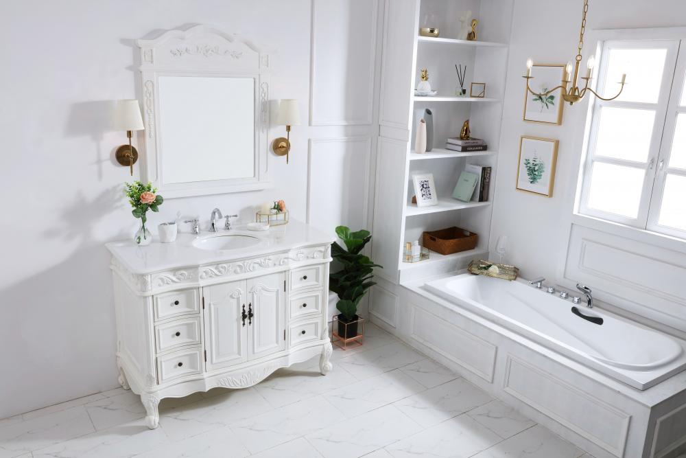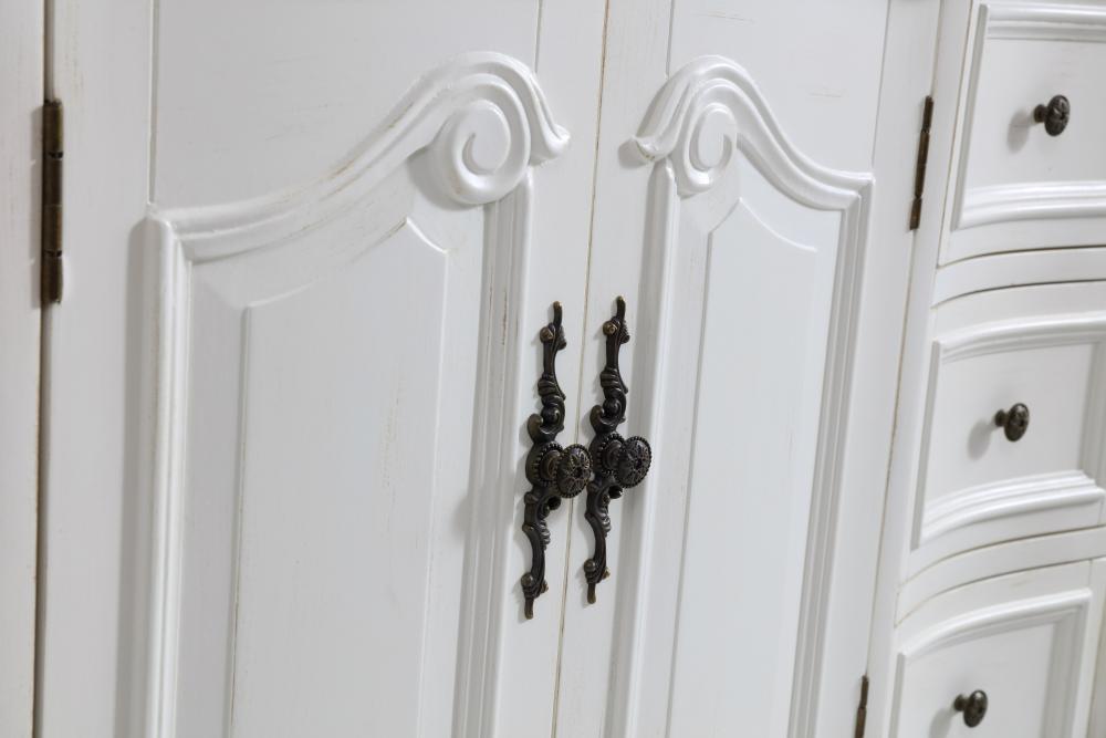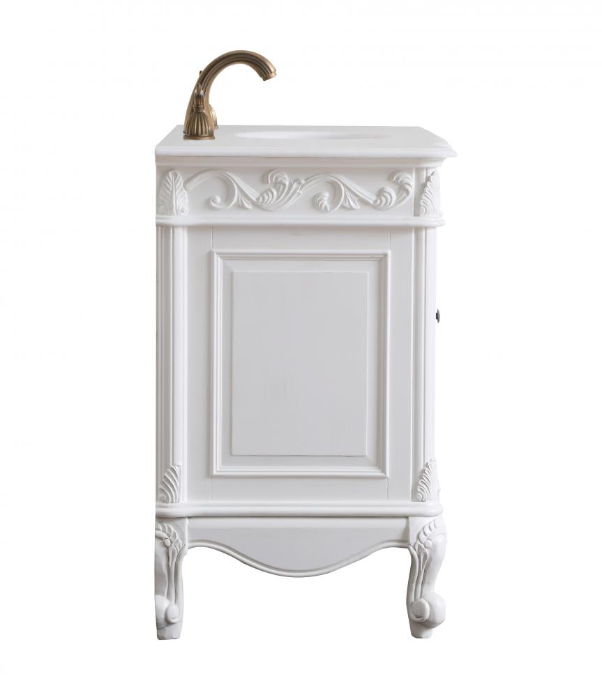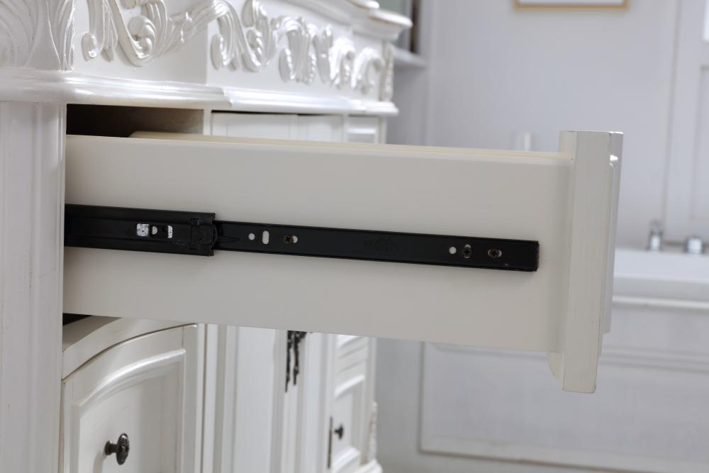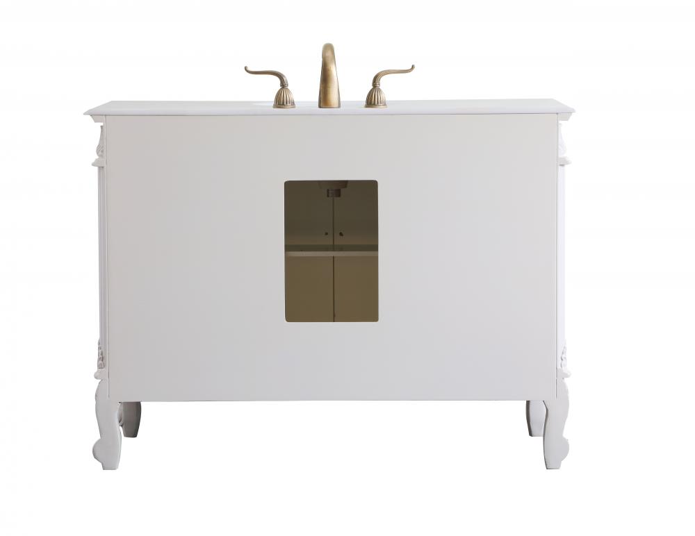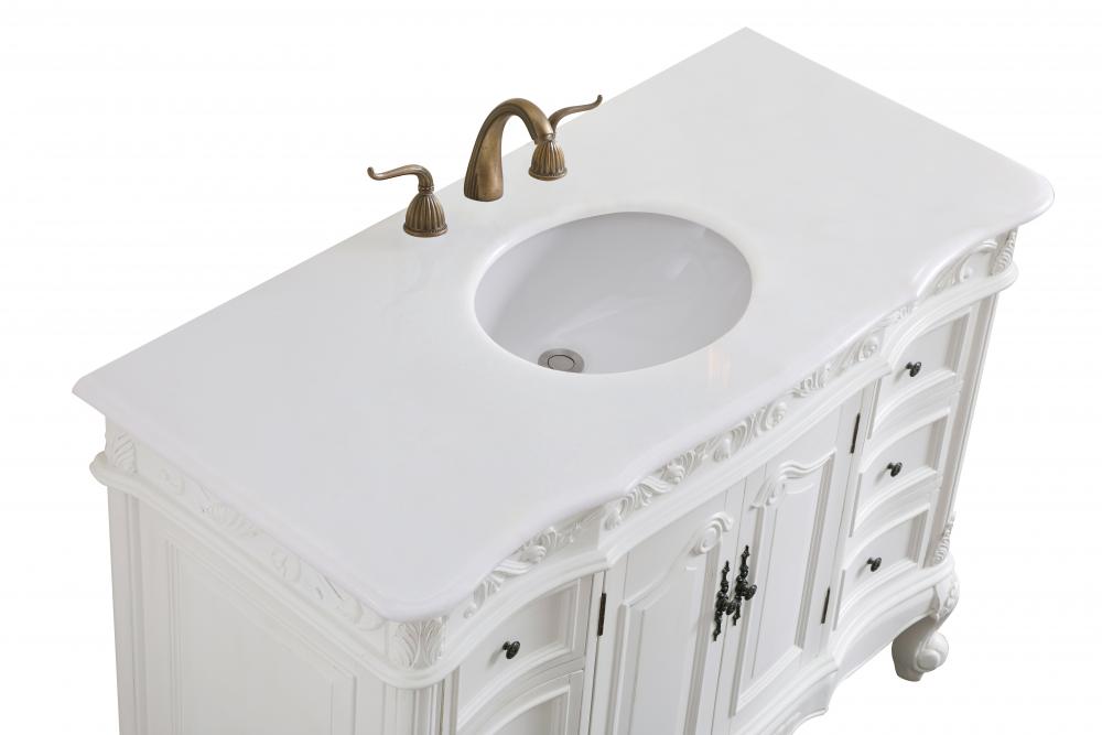 This superb balance of timeless tradition and opulent beauty in a traditional vanity will certainly enhance the aesthetics of any home or office bathroom! Featuring an ivory white engineered marble countertop complimenting the hand painted cabinet. With two doors and six drawers, as well as antique bronze finish door knobs, this superbly carved floral design, stands on stylishly carved solid wood French scroll feet. The vanity ships fully assembled with a convenient open access plumbing panel.