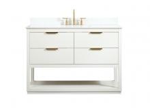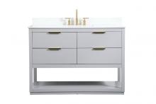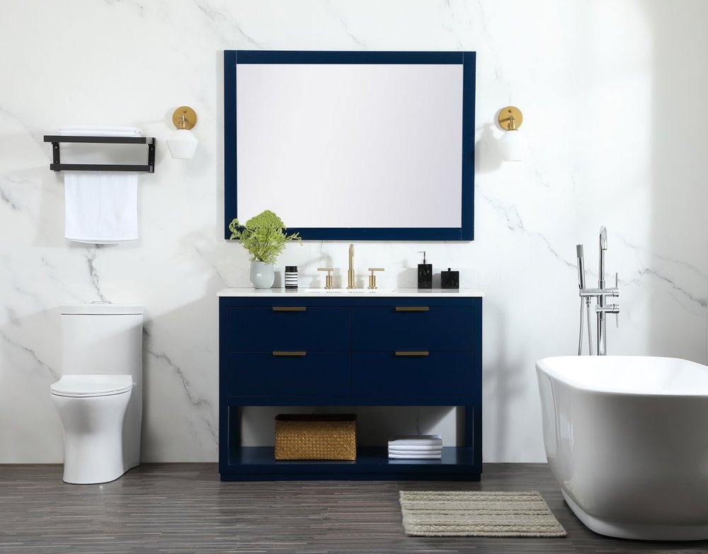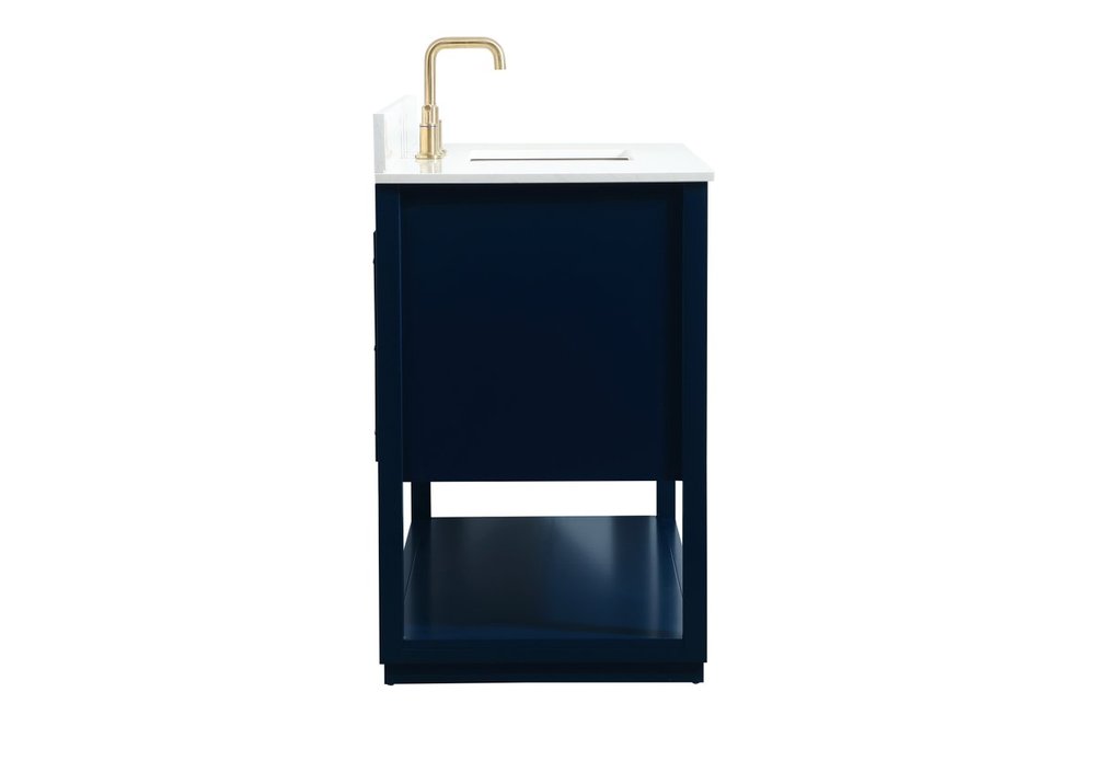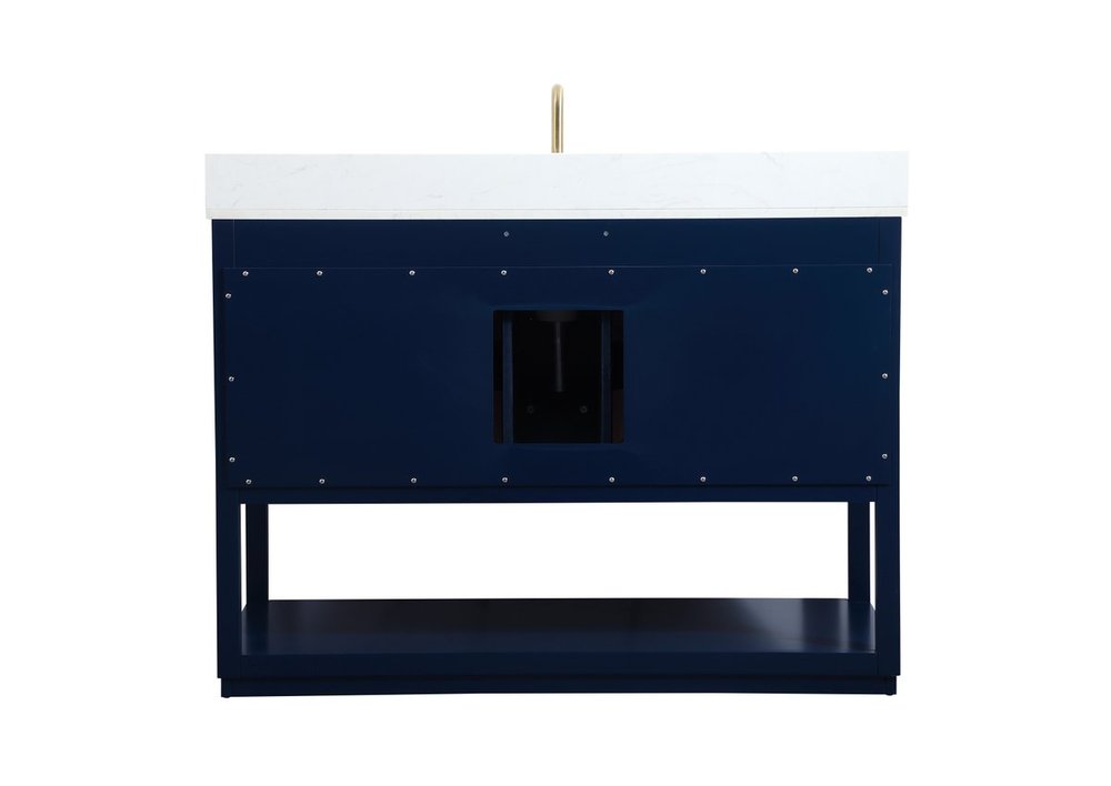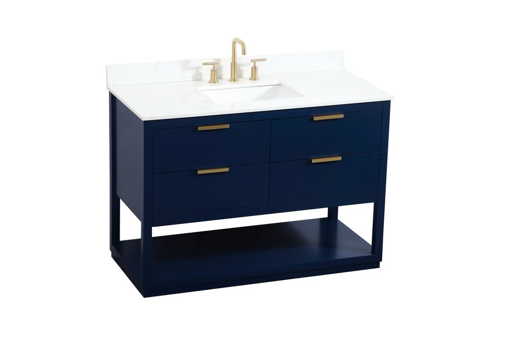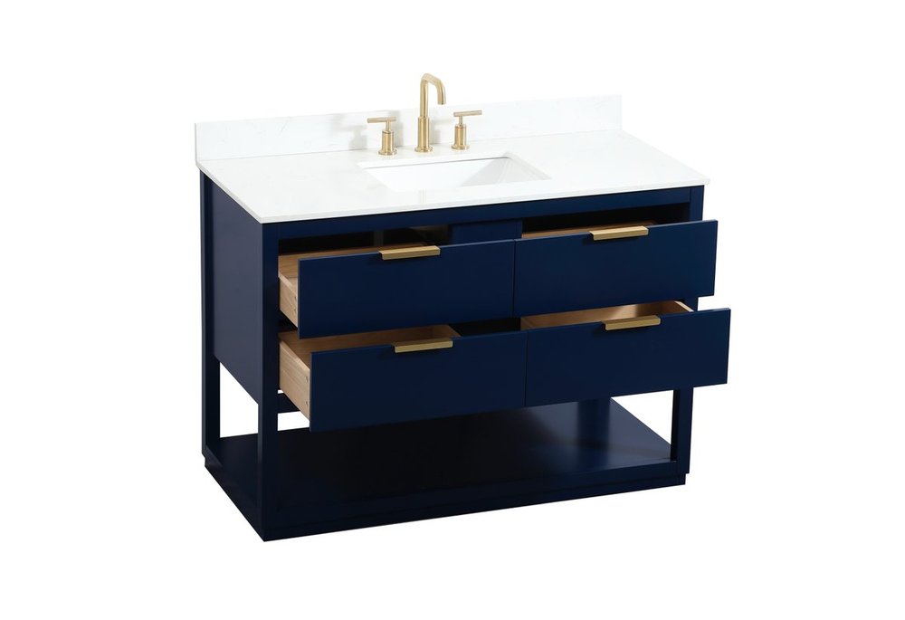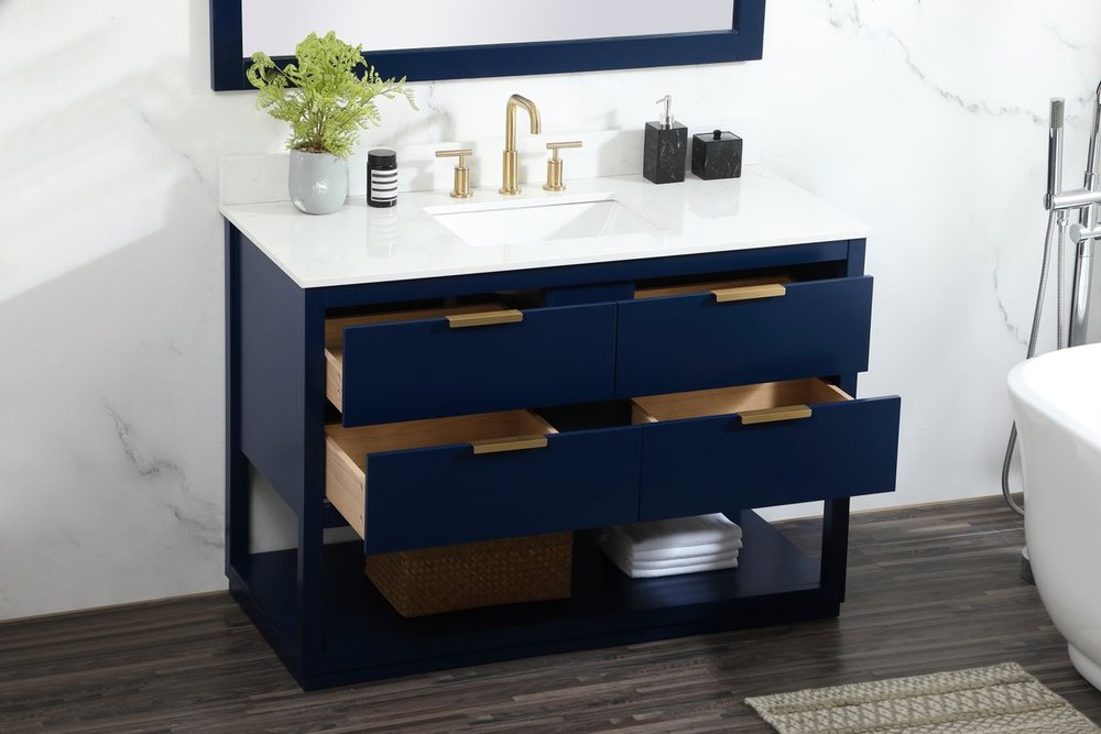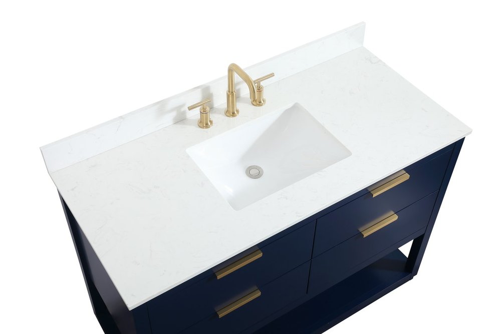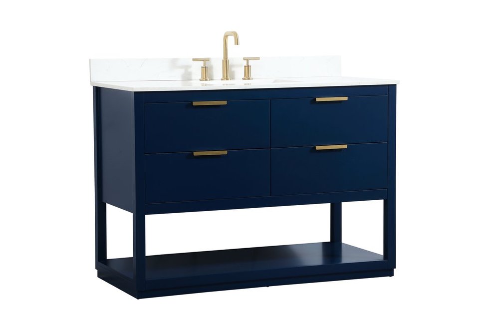 Live in modern comfort with this 48" blue finish vanity. Dressed in a blue and sleek gold metal hardware, its contemporary style will have your bathroom or powder room elevated in modern sophistication. The open shelf at the base and four drawers reveal ample storage space for your bathroom essentials and miscellany. Clean lines create its own visual interest, adding trendy looks to your already chic room. Comes with a matching backsplash to protect your walls.