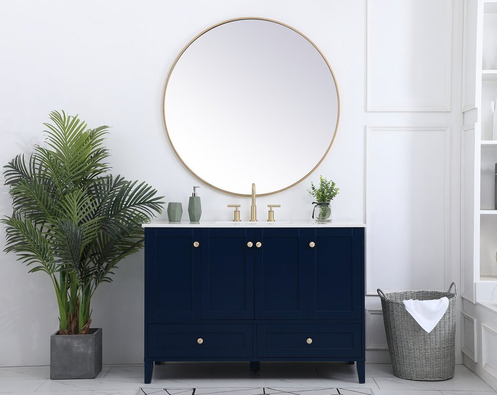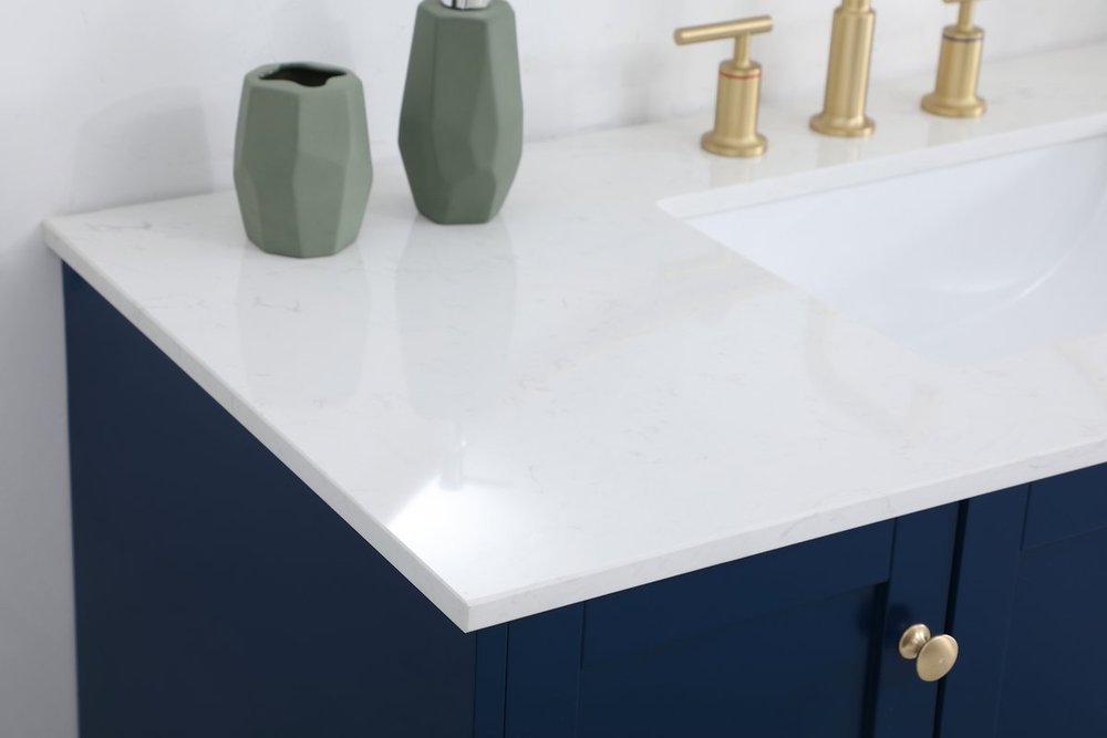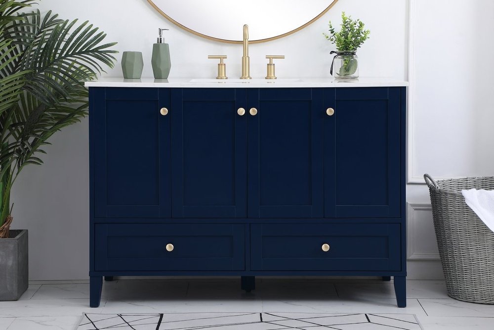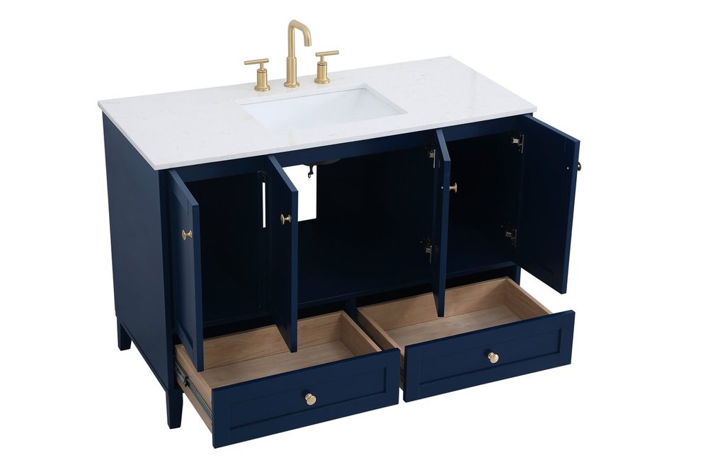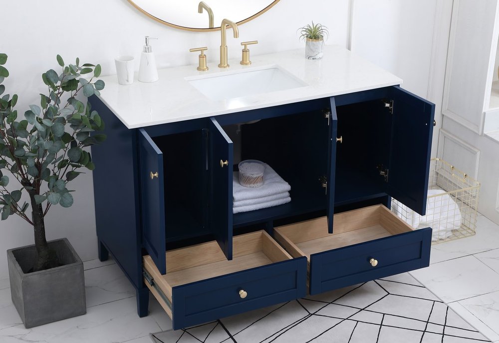 While unassuming, this 48" vanity in a Blue finish sure knows how to redefine luxury. The sleek gold knobs adorn the 4 cabinet doors and 2 bottom drawers which allow you to store your bathroom toiletries and necessities. Standing strong on oblique legs and dressed with a Calacatta engineered marble countertop, this vanity will surely create beauty and casual elegance in your bathroom or powder room.