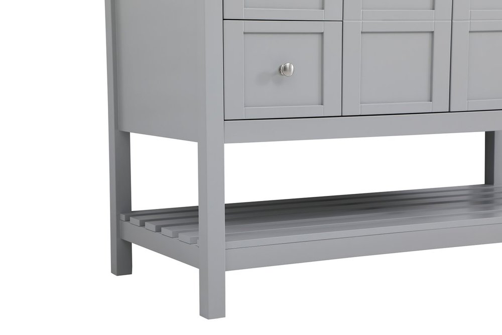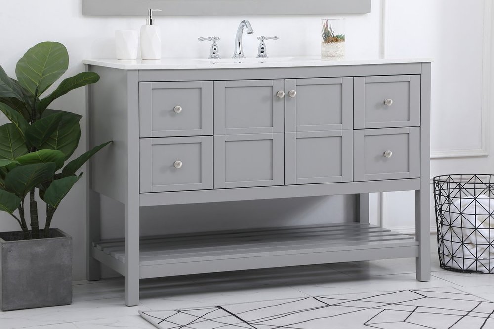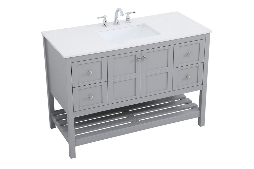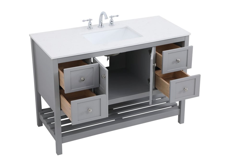 The subtle beauty of the Theo collection 48" vanity in a gray finish exudes comfortable luxury. Its modern, yet traditional beauty will surely dress up your bathroom or powder room without any fuss. The white stone countertop and porcelain undermount sink shows quiet opulence, and the legs support upright without fail. Brushed Nickel hardware complements the trendy gray finish, with pulls adorning the two cabinet doors and four drawers, showcasing ample storage space within. Slated shelf allows for additional space to organize your towels. Whether this vanity is in your bathroom or for guests, its presence will surely elevate the aesthetics of your room.