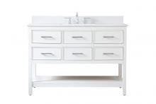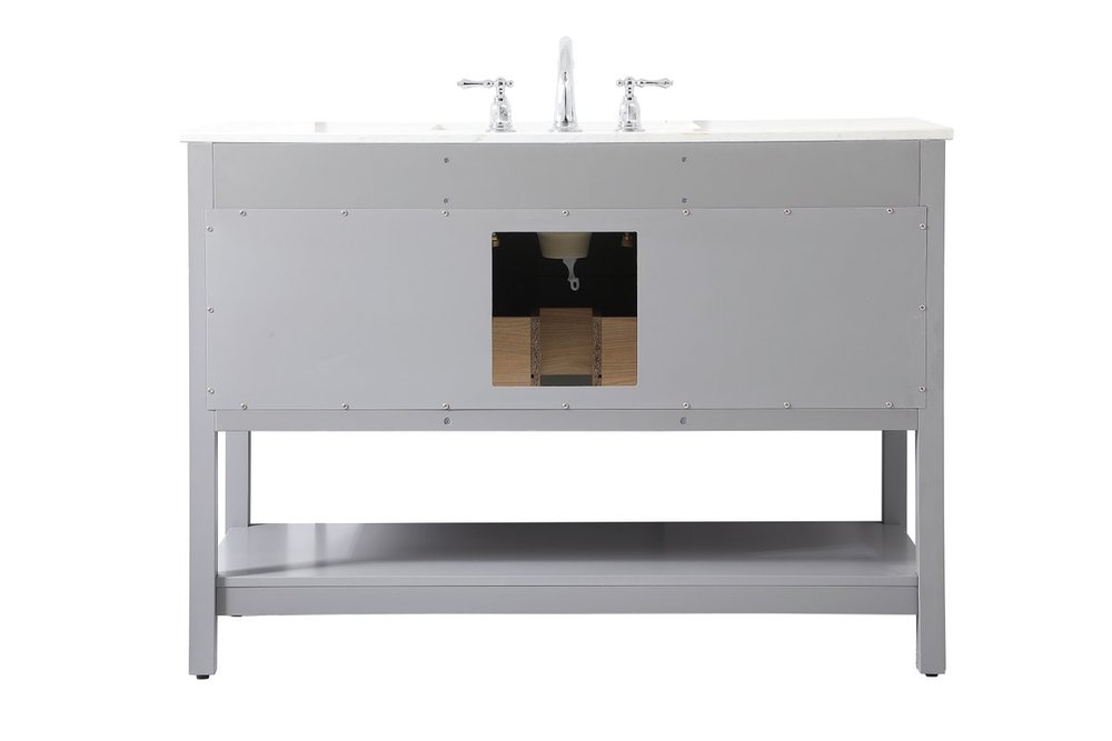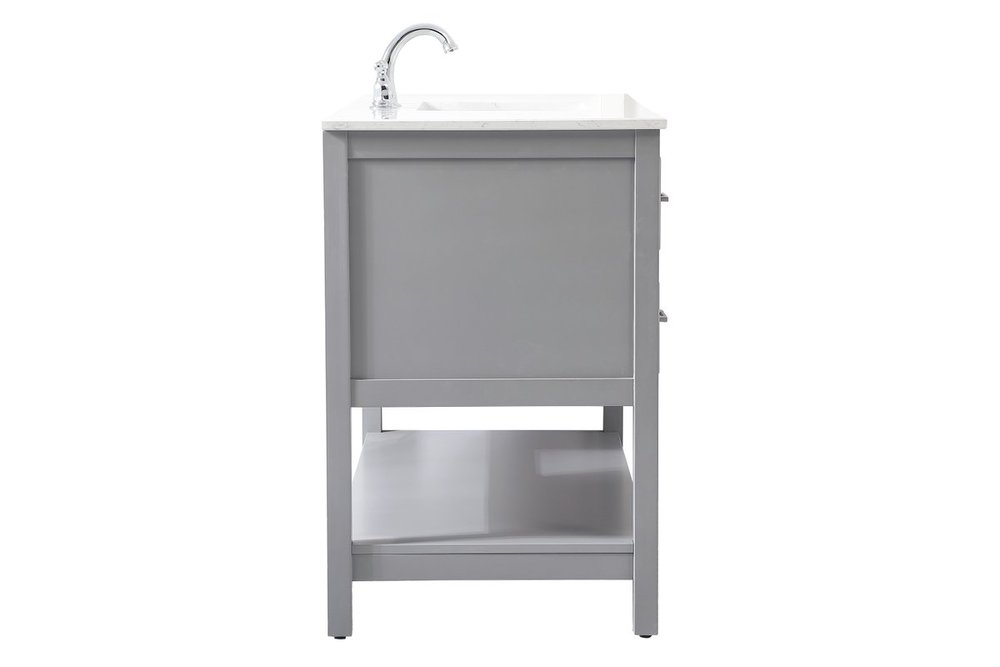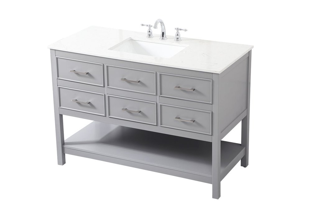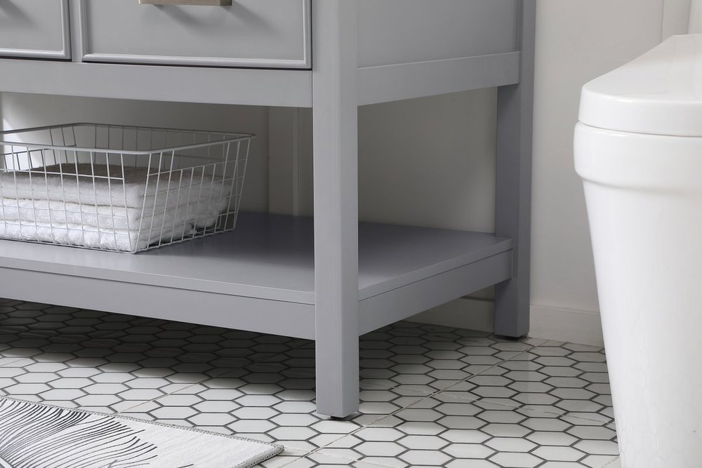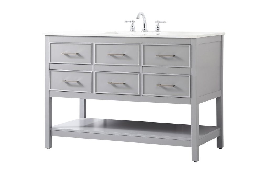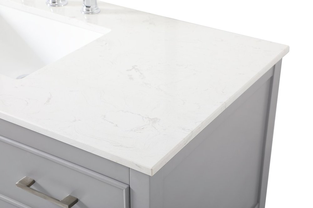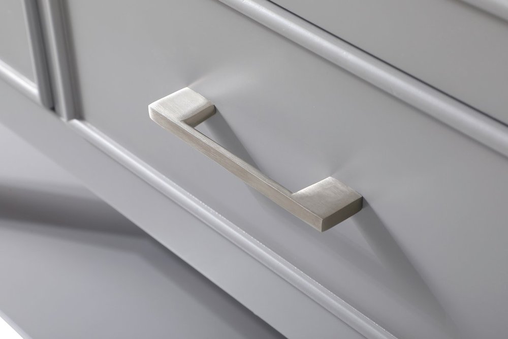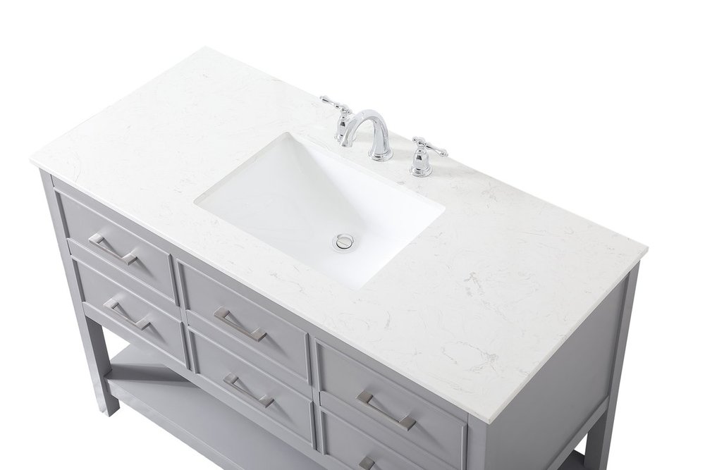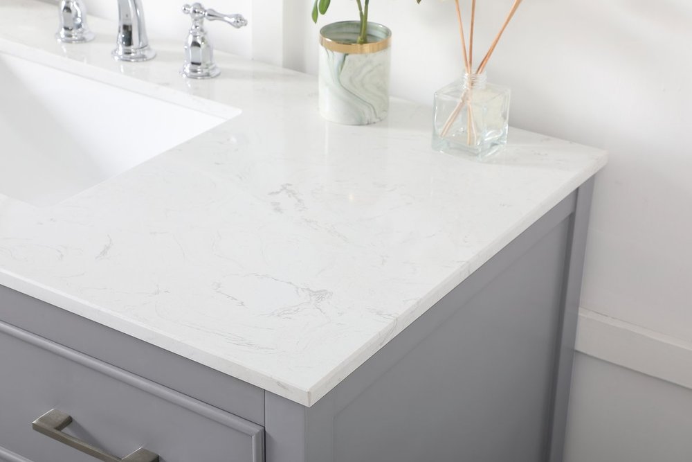 Make the most of your space with this traditional style bathroom vanity. Complements well with many aesthetics with its beautiful finish, calacatta engineered marble countertop, and the contemporary slender handle bar that sits on one false drawer and five functional drawers with soft closing mechanism, allowing you to store an assortment of bathroom essentials. The lower shelf makes it the perfect space to hold new towels for your guests. This compact vanity ensures both form and function in your bathroom or powder room for you and your guests.
