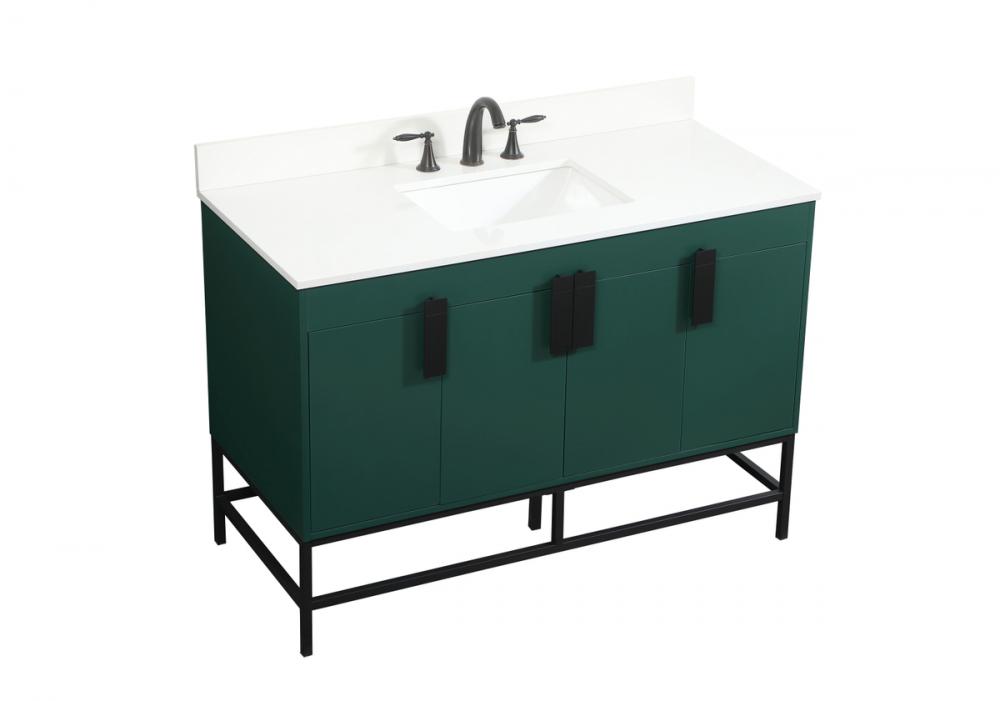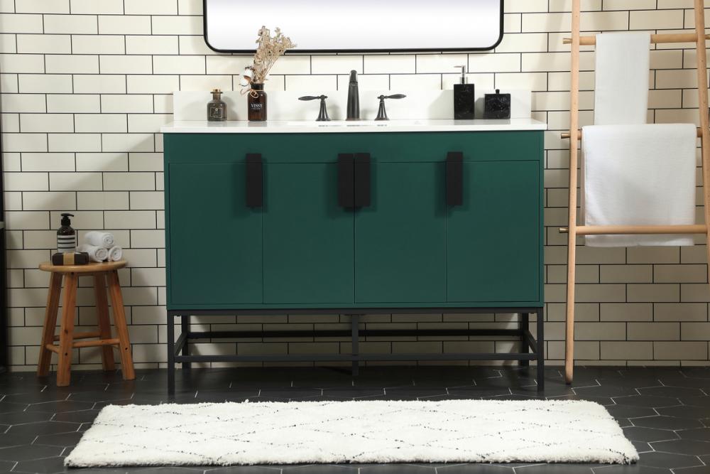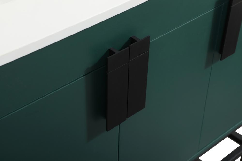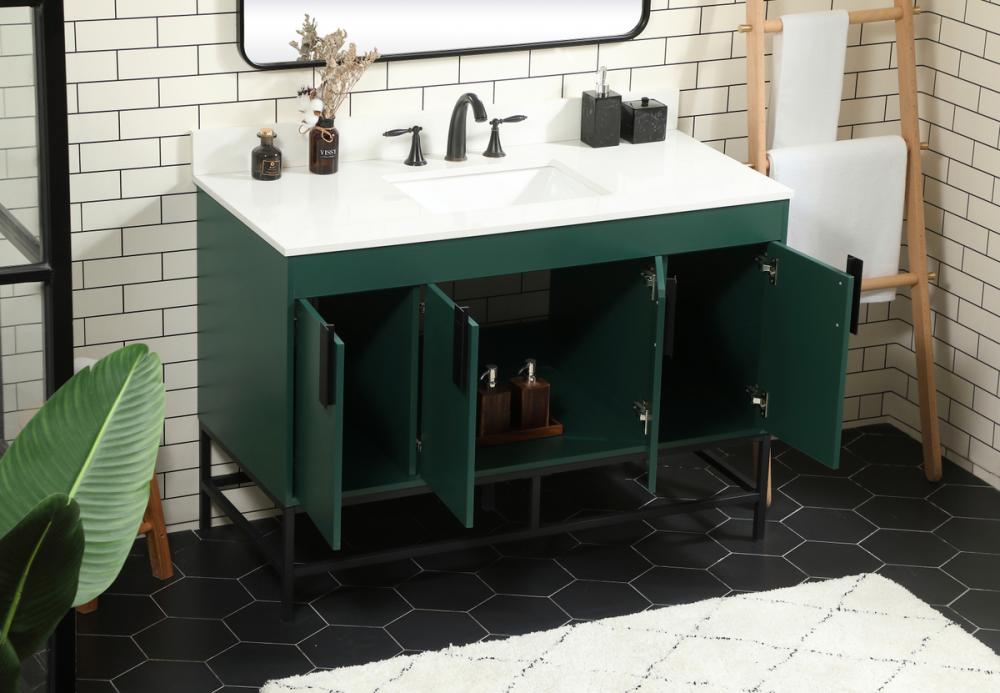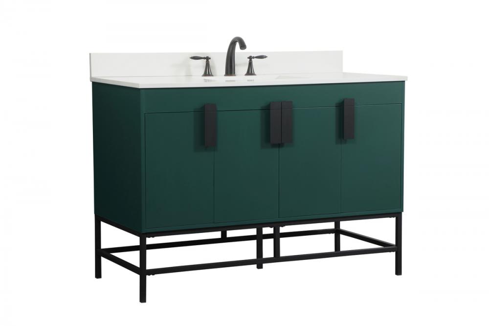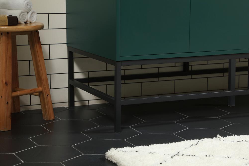 This vanity is a sleek-looking piece of bathroom furniture that is easy to incorporate into your design scheme. The cabinet features a smooth door panel with an oversized steel handle and soft close hinges provide ample room for accessories. Constructed of engineered wood, the powder-coated metal rod legs are an urban industrial look that we love. Minor assembly of the metal legs needed to get this vanity up and running. Comes with a matching backsplash to complete the look and protects your wall.