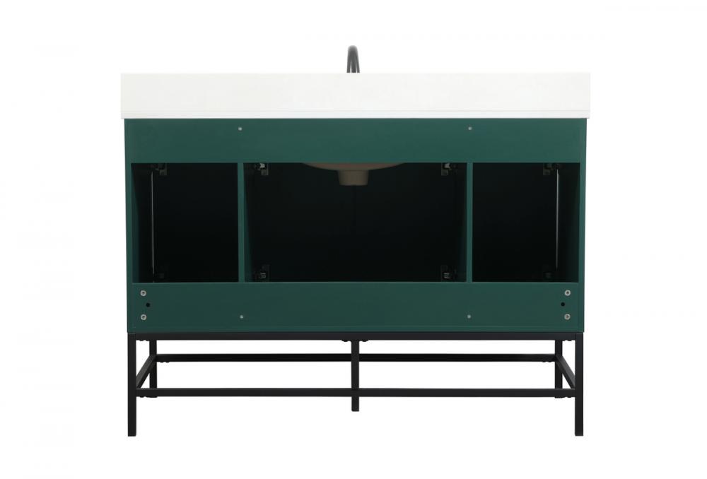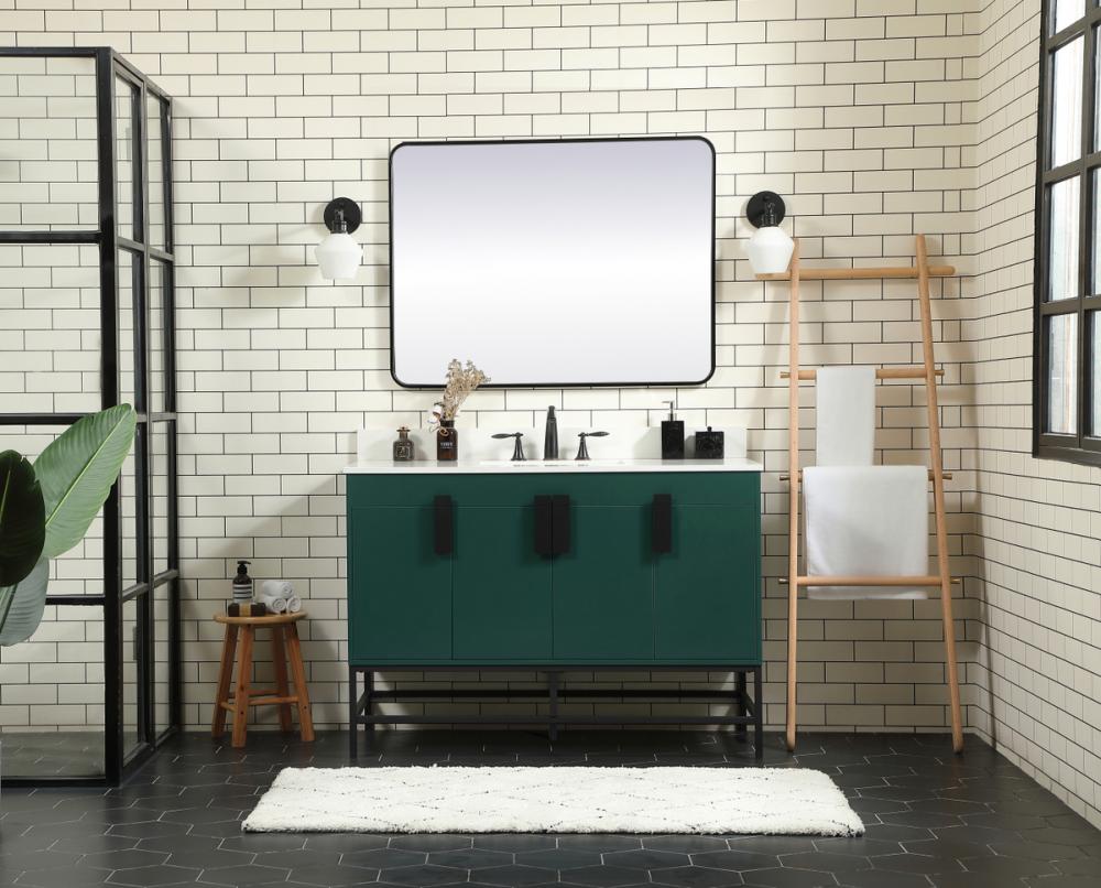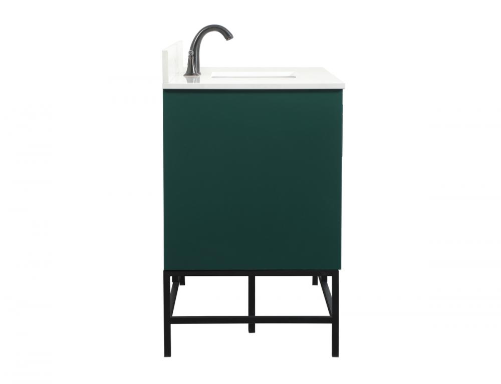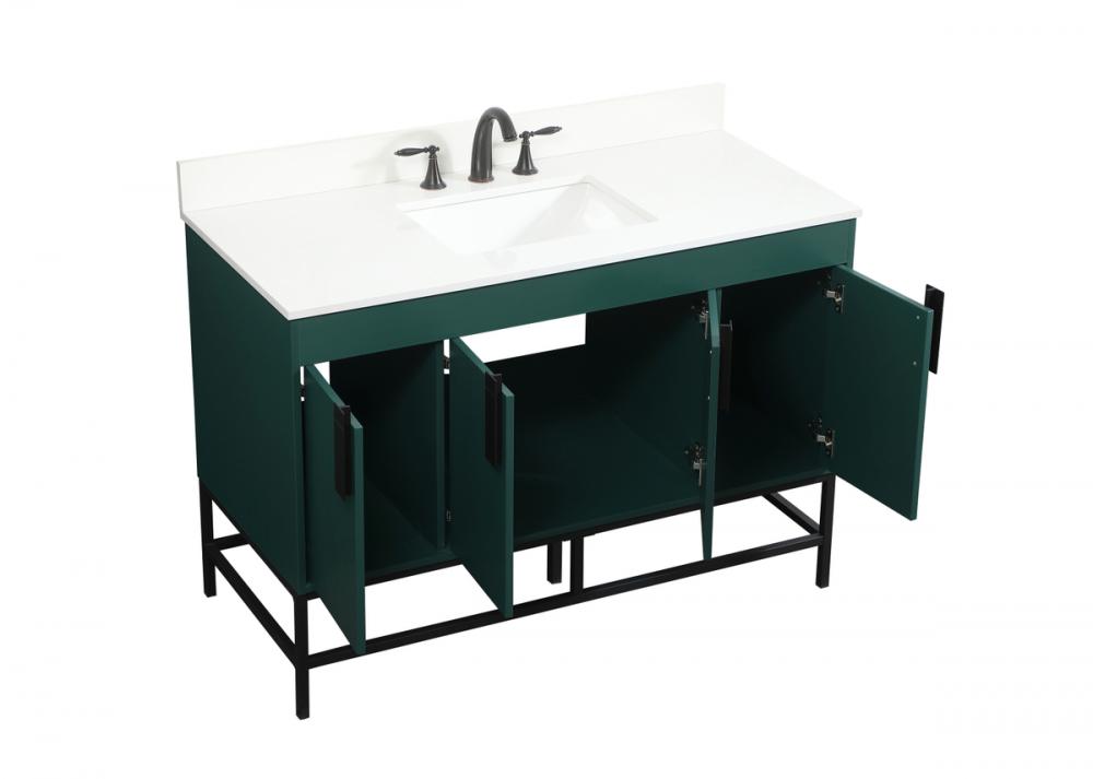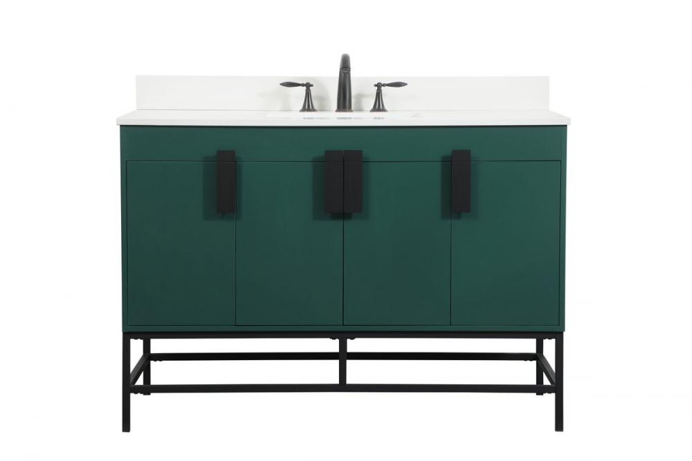 This vanity is a sleek-looking piece of bathroom furniture that is easy to incorporate into your design scheme. The cabinet features a smooth door panel with an oversized steel handle and soft close hinges provide ample room for accessories. Constructed of engineered wood, the powder-coated metal rod legs are an urban industrial look that we love. Minor assembly of the metal legs needed to get this vanity up and running. Comes with a matching backsplash to complete the look and protects your wall.
