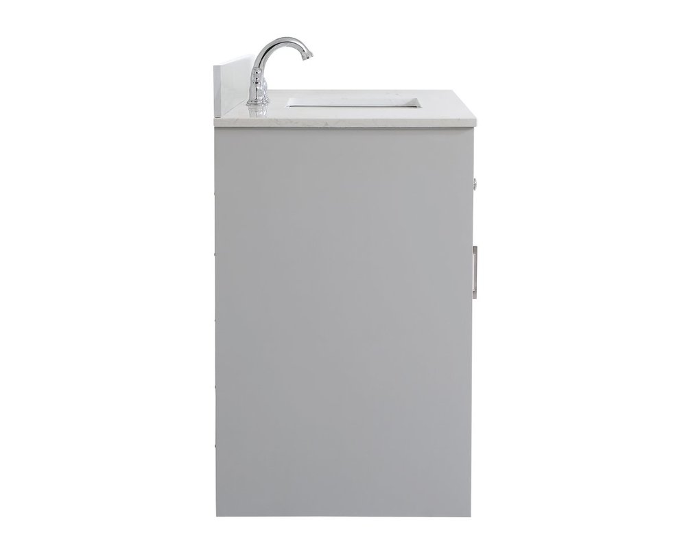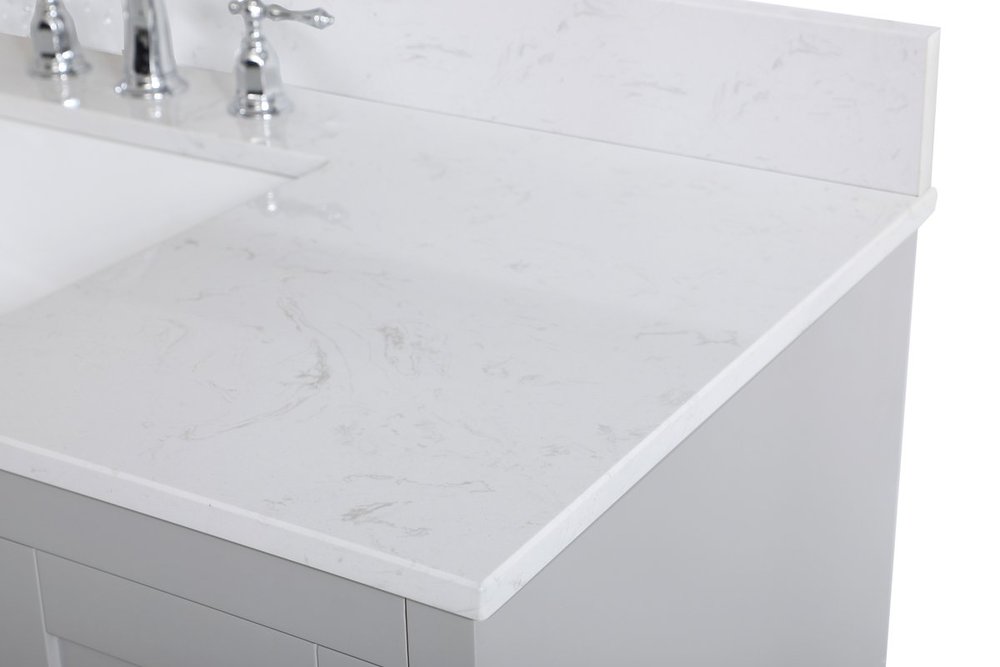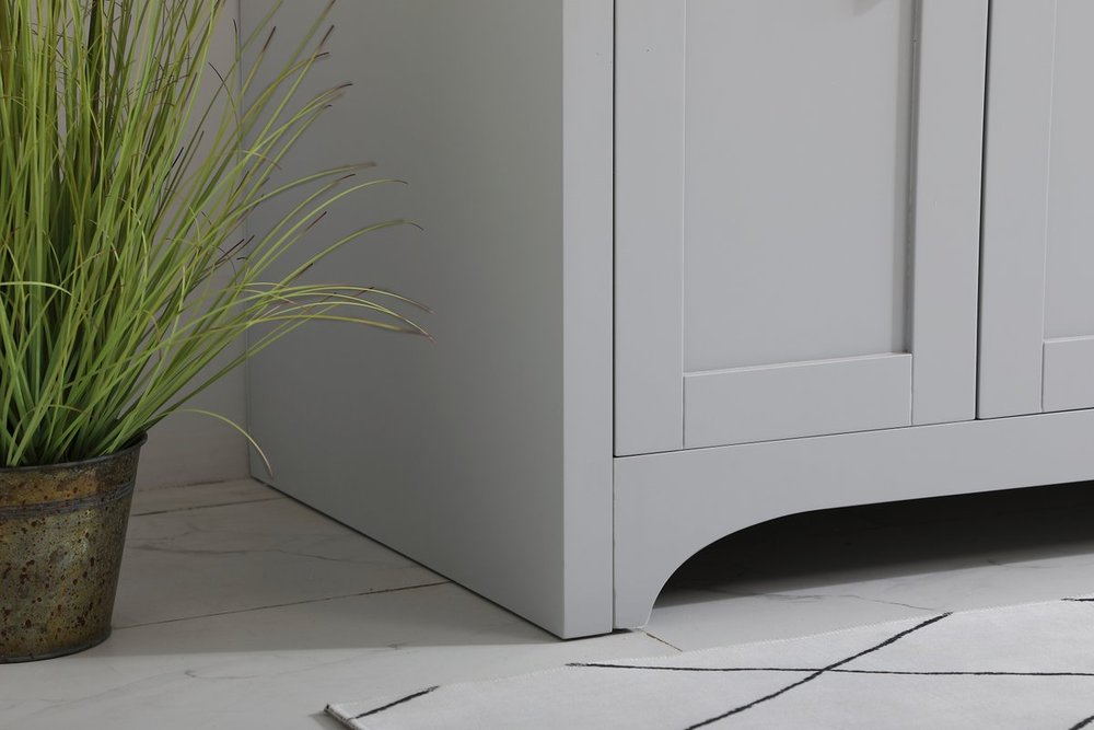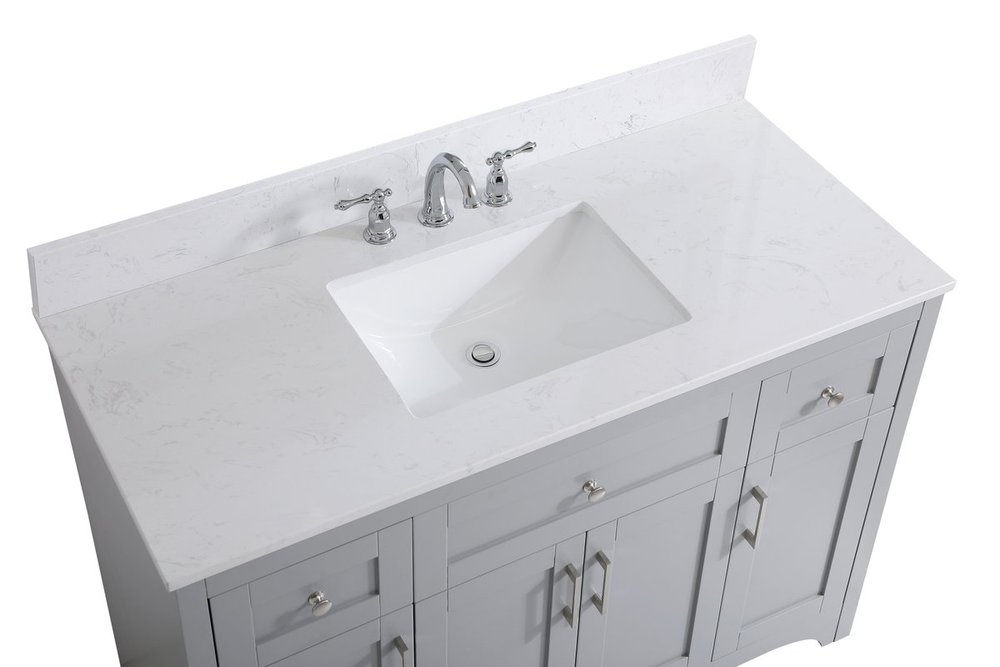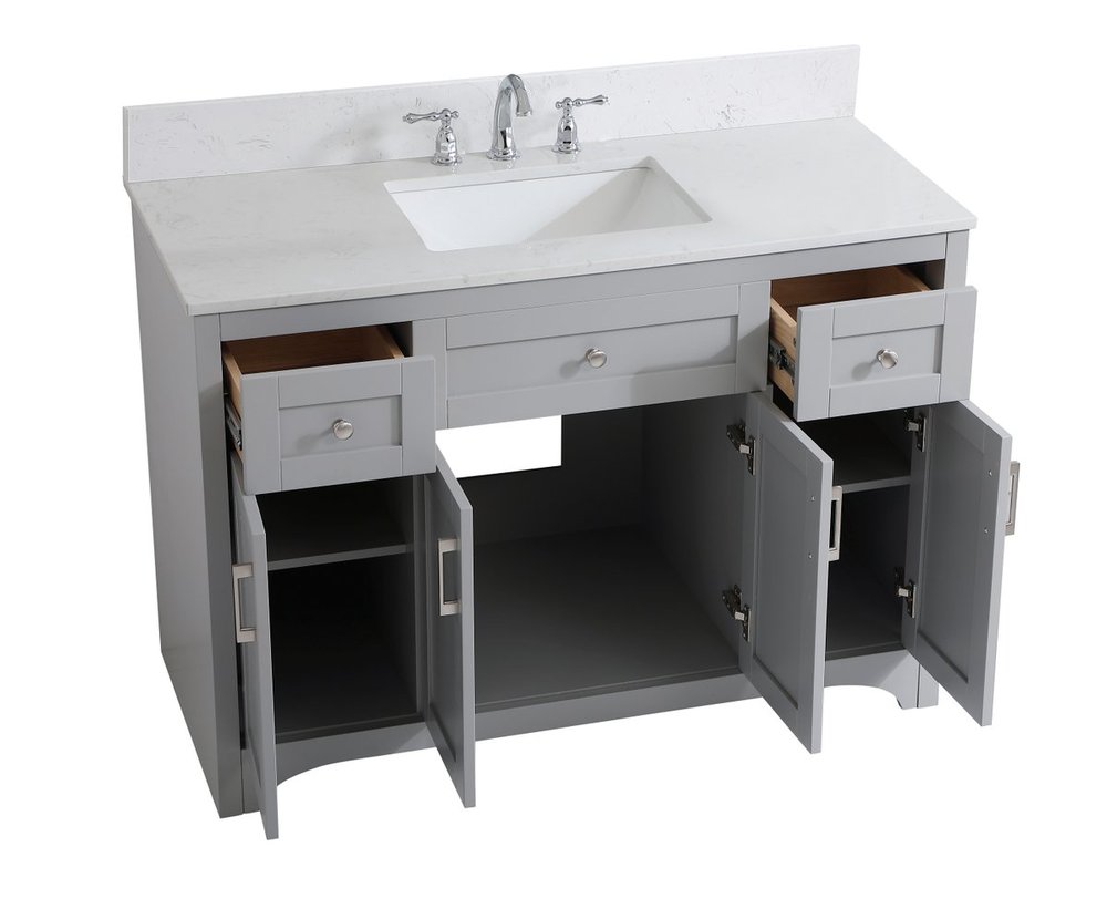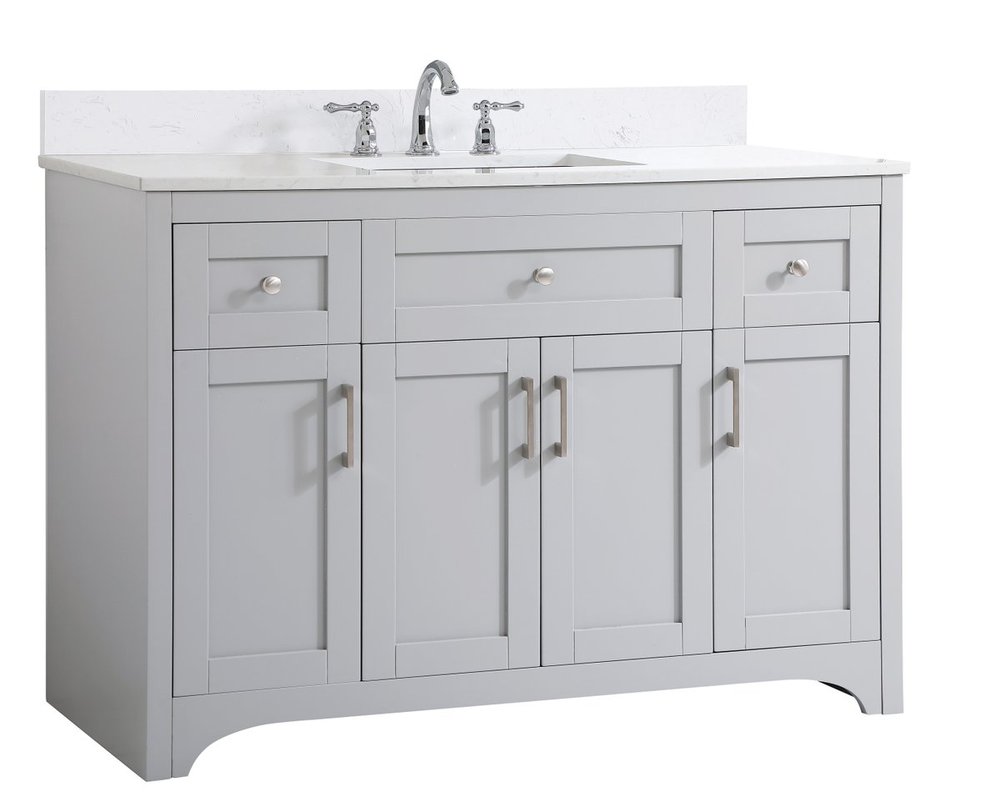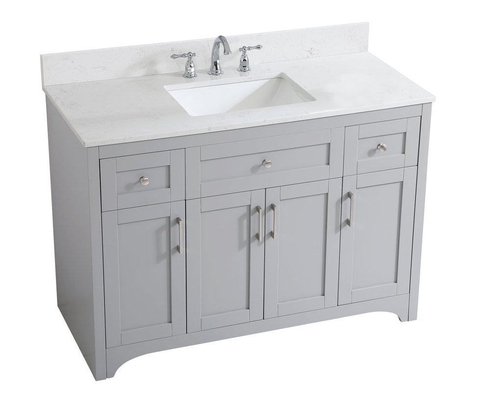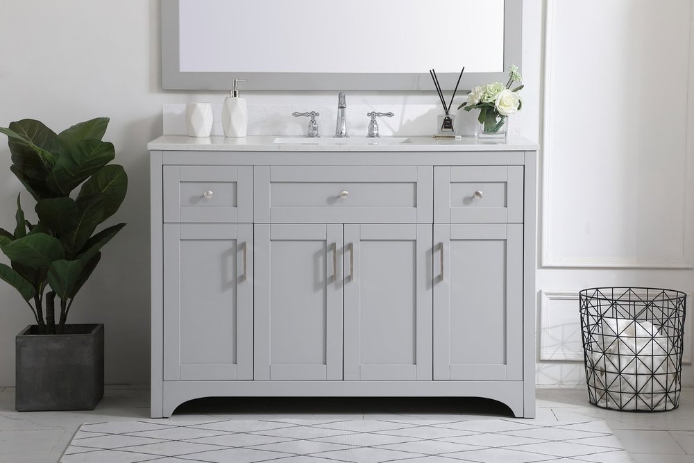 The refined simplicity of this 48" grey finish vanity creates a peaceful, yet stylish, atmosphere. Its traditional modernity adds a mature beauty that will elevate any bathroom or powder room--the Calacatta engineered marble counter top adds refined luxe while the brushed nickel handle bars open the 4 cabinet doors and 2 upper drawers, revealing ample storage space to store and hide away an assortment of bathroom essentials. Whether your home is large or small, this vanity will surely fit in well. Comes with a matching backsplash to complete the look and protects your wall.