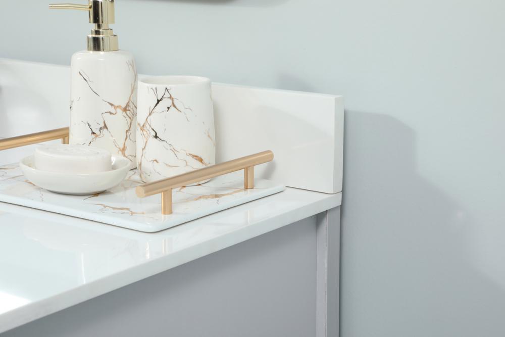 Reminiscent of barn doors, the two door cabinet and eight drawers adds both stylistic charm and function with its plethora of storage options for all your bathroom essentials. Whether for your bathroom or the guests', everyone will marvel at its classic look for traditional and farmhouse aesthetics. A slab of engineered marble rounds out the piece up top, as well as the porcelain under mount sink and predrilled faucet holes. This vanity arrives fully assembled. Comes with a matching backsplash to complete the look and protects your wall.