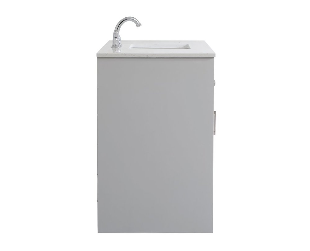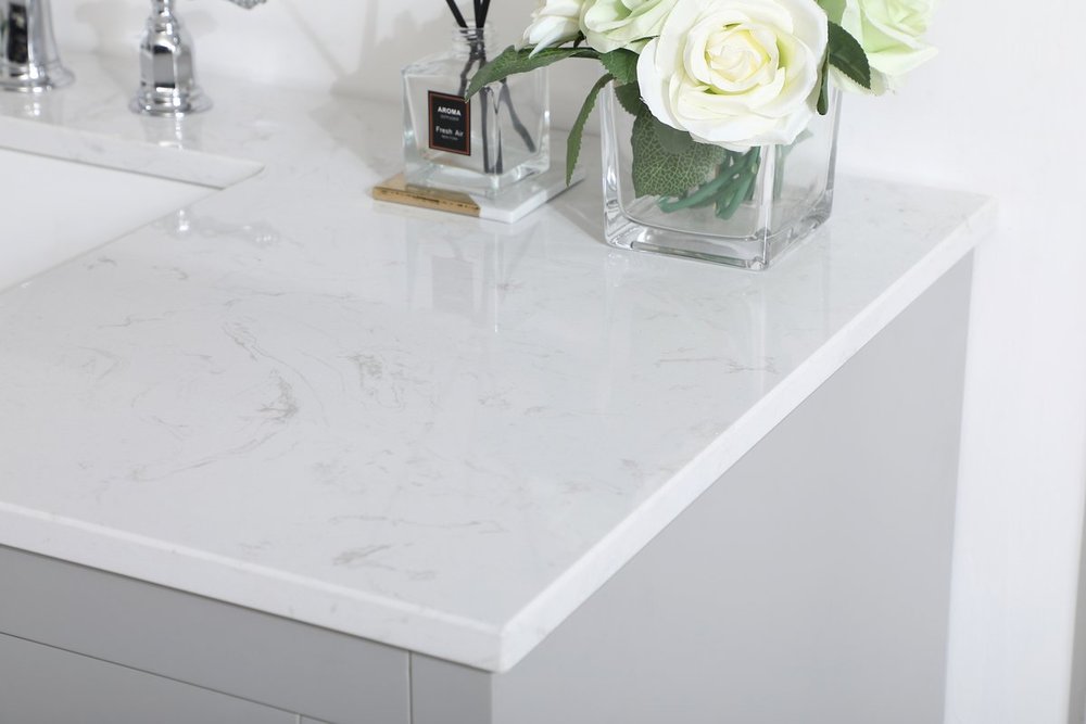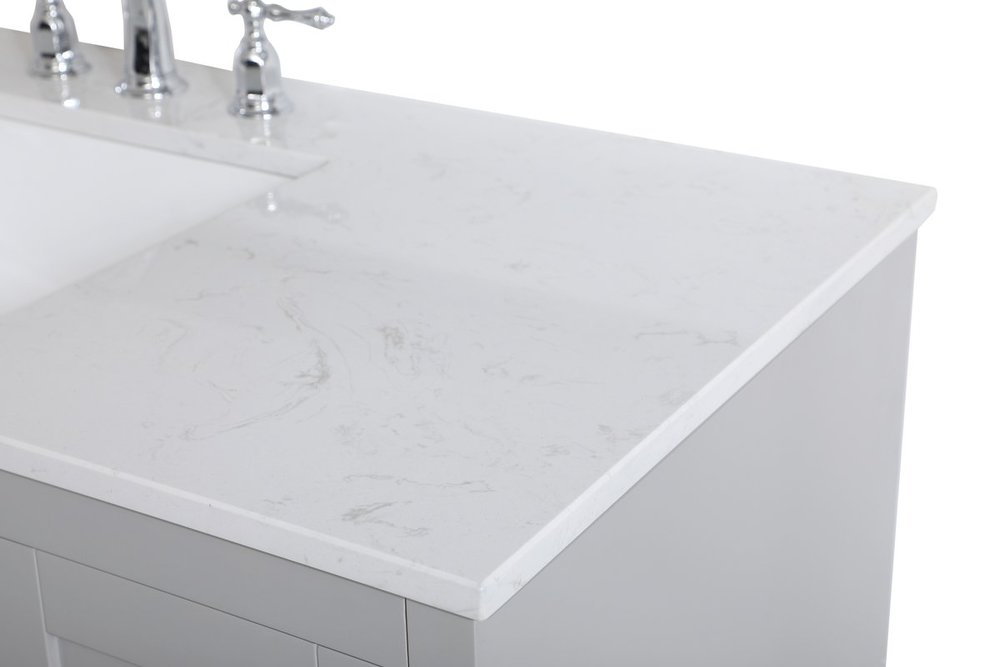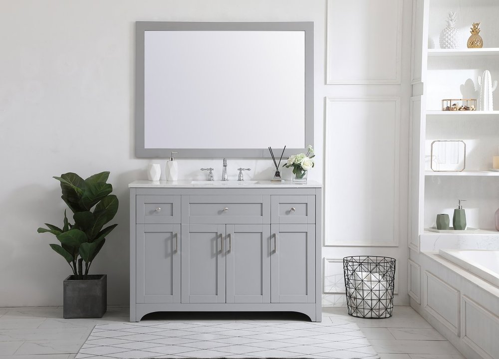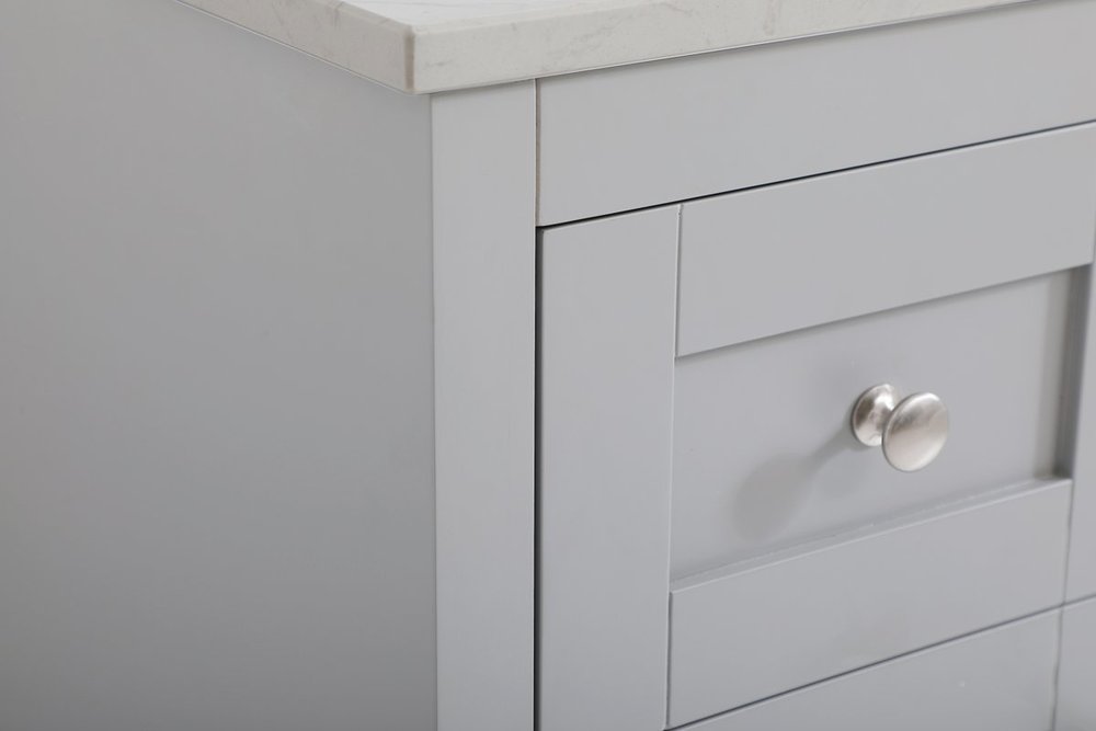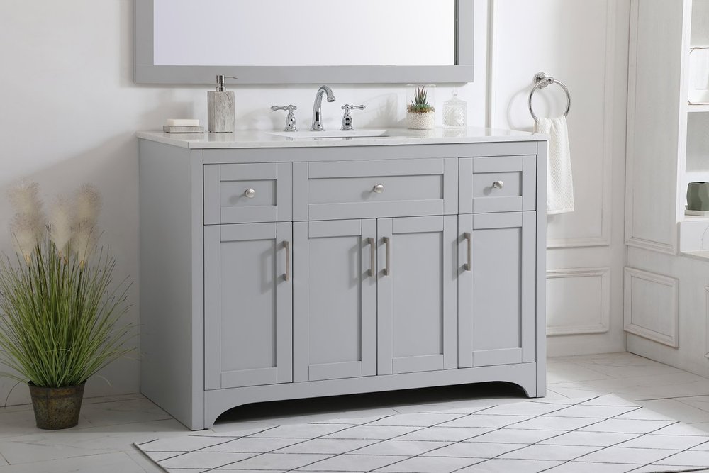 The refined simplicity of this 48" grey finish vanity creates a peaceful, yet stylish, atmosphere. Its traditional modernity adds a mature beauty that will elevate any bathroom or powder room--the Calacatta engineered marble counter top adds refined luxe while the brushed nickel handle bars open the 4 cabinet doors and 2 upper drawers, revealing ample storage space to store and hide away an assortment of bathroom essentials. Whether your home is large or small, this vanity will surely fit in well.