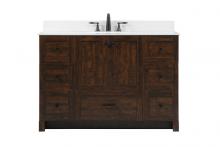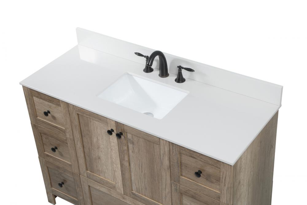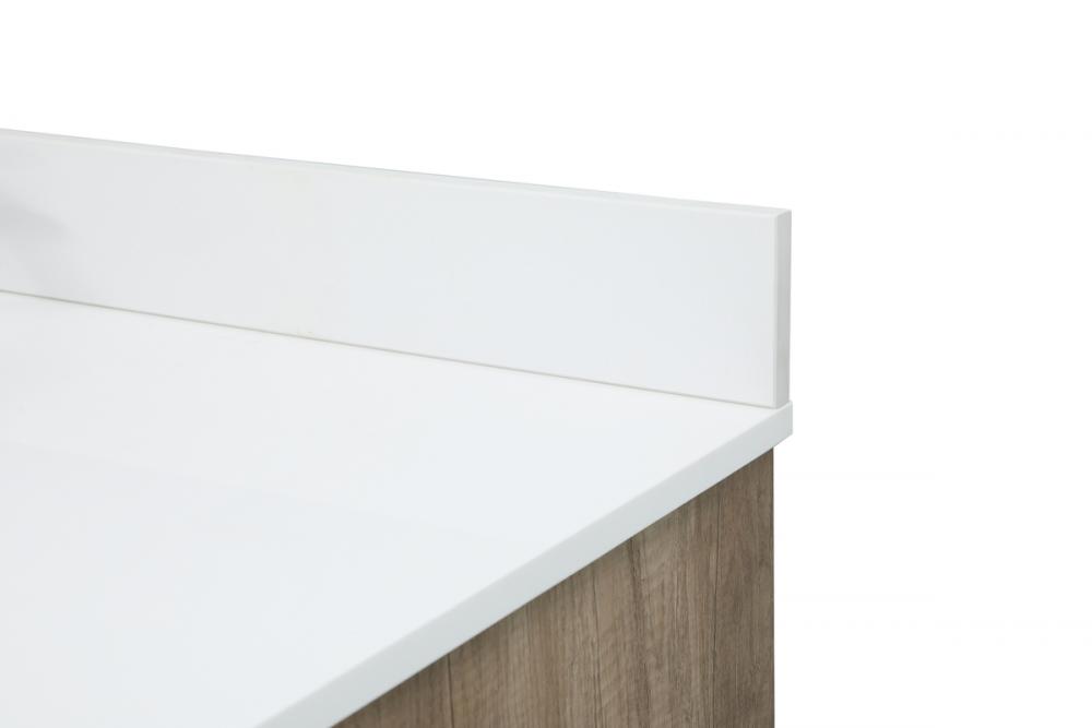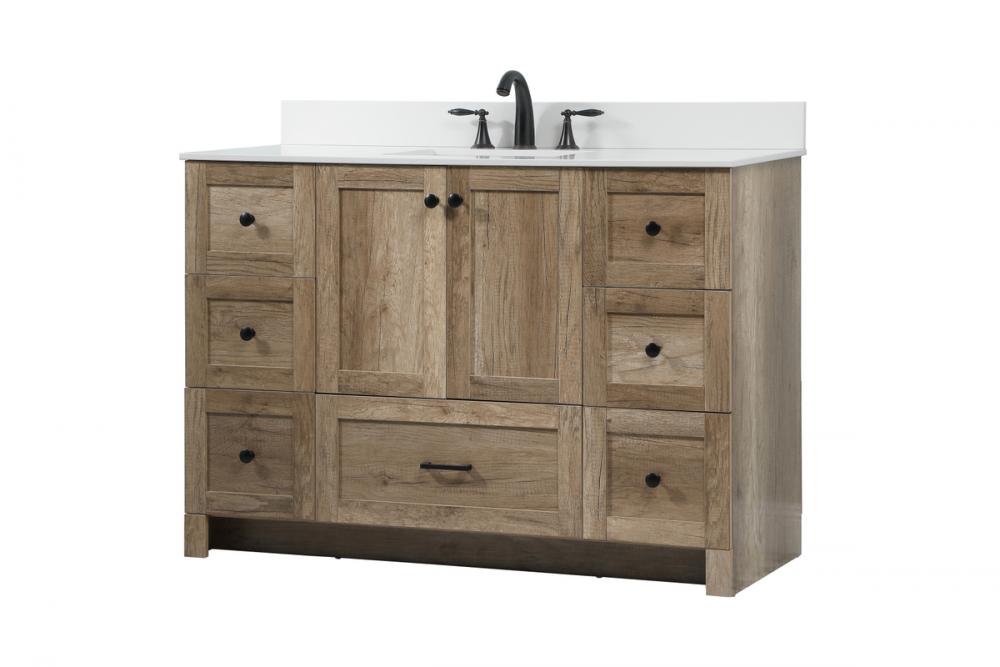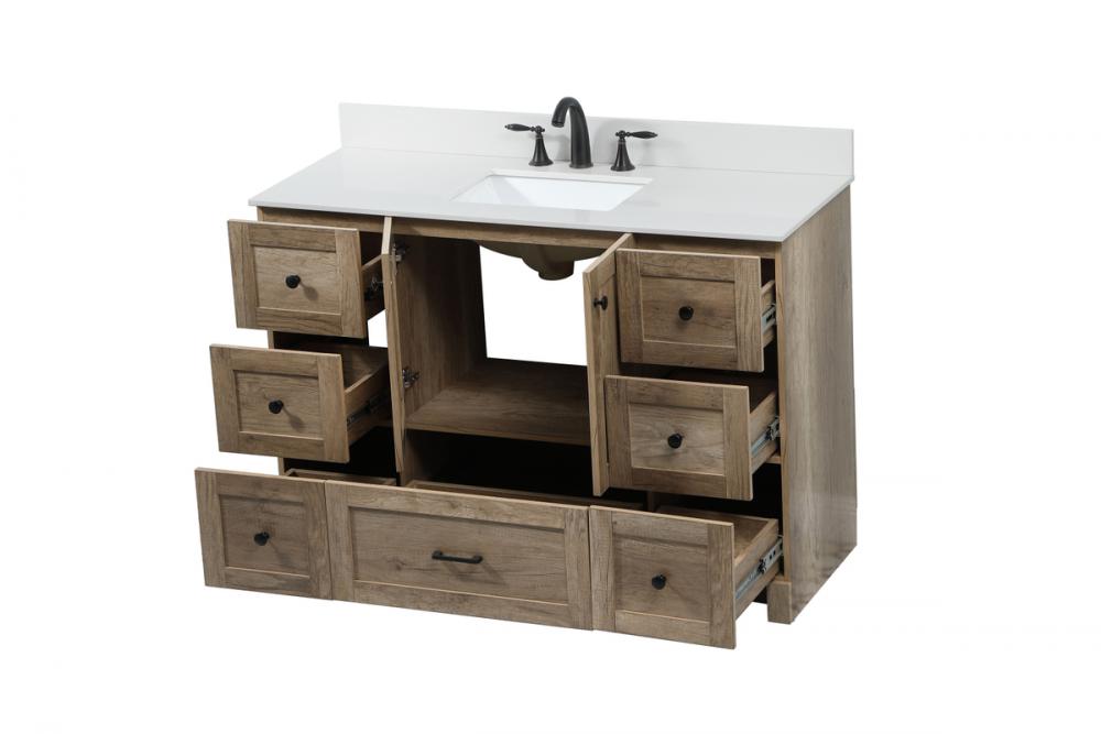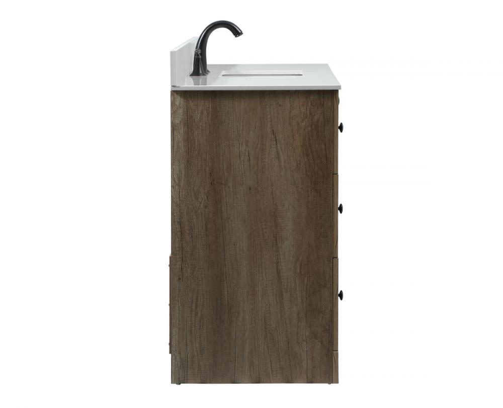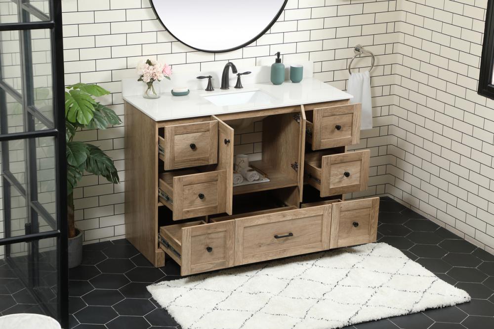 Delve into a world of minimalistic fashion and contemporary styling with this farmhouse 48" vanity. The clean faux lines anchors the weathered design. Black handle adorns the two doors hiding the base of the integrated porcelain sink while the bottom drawer and side drawers allow you to store your bathroom necessities and toiletries. It is the perfect vanity for any bathroom, regardless of size. Comes with a matching backsplash to complete the look and protects your wall.