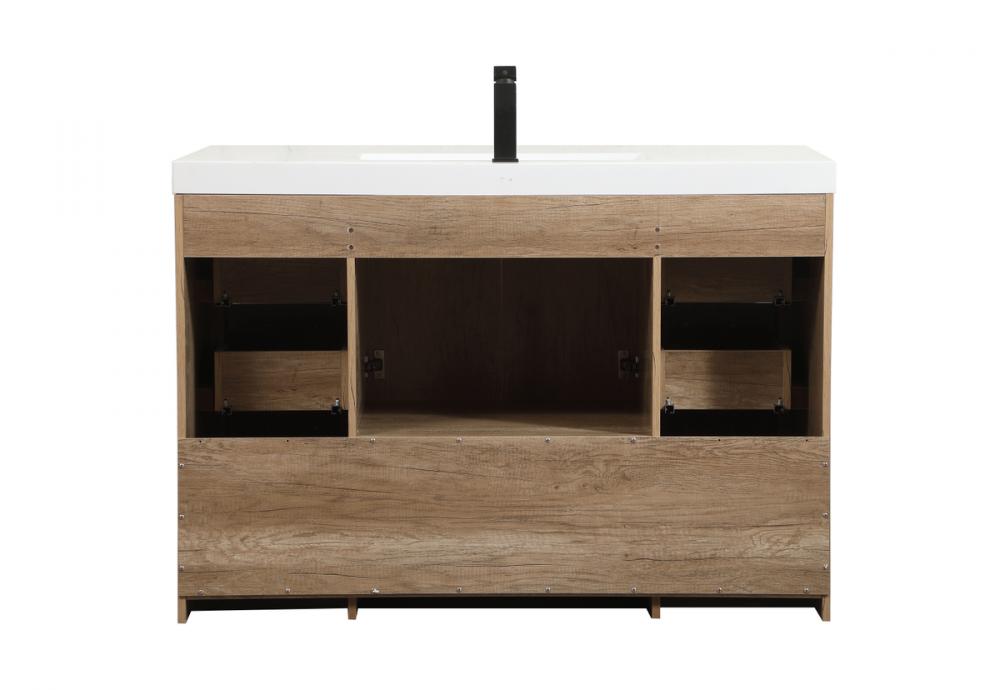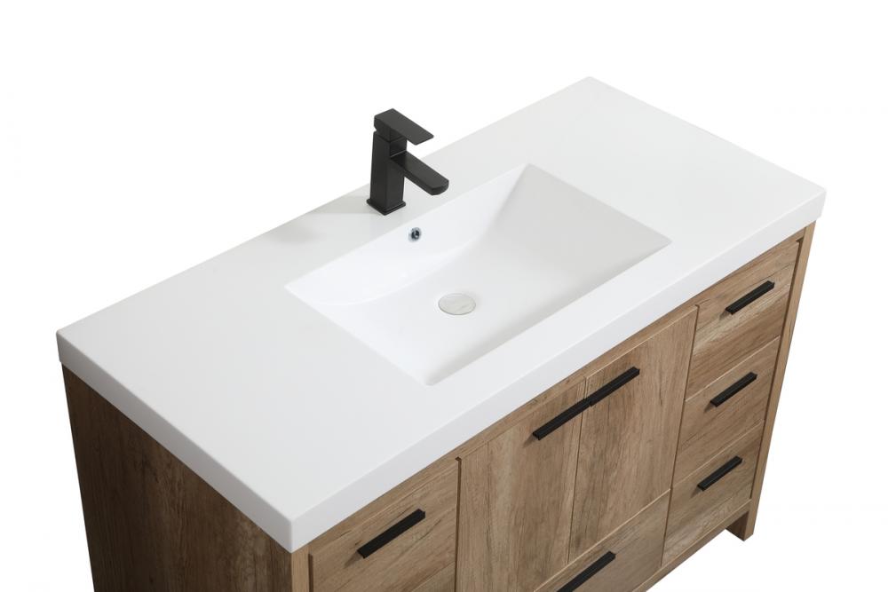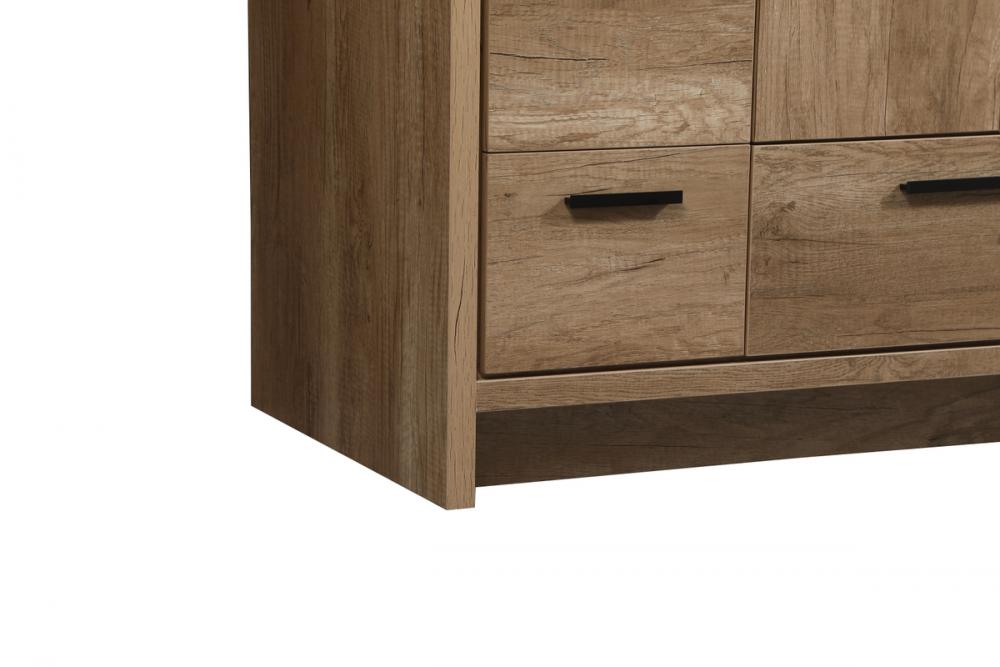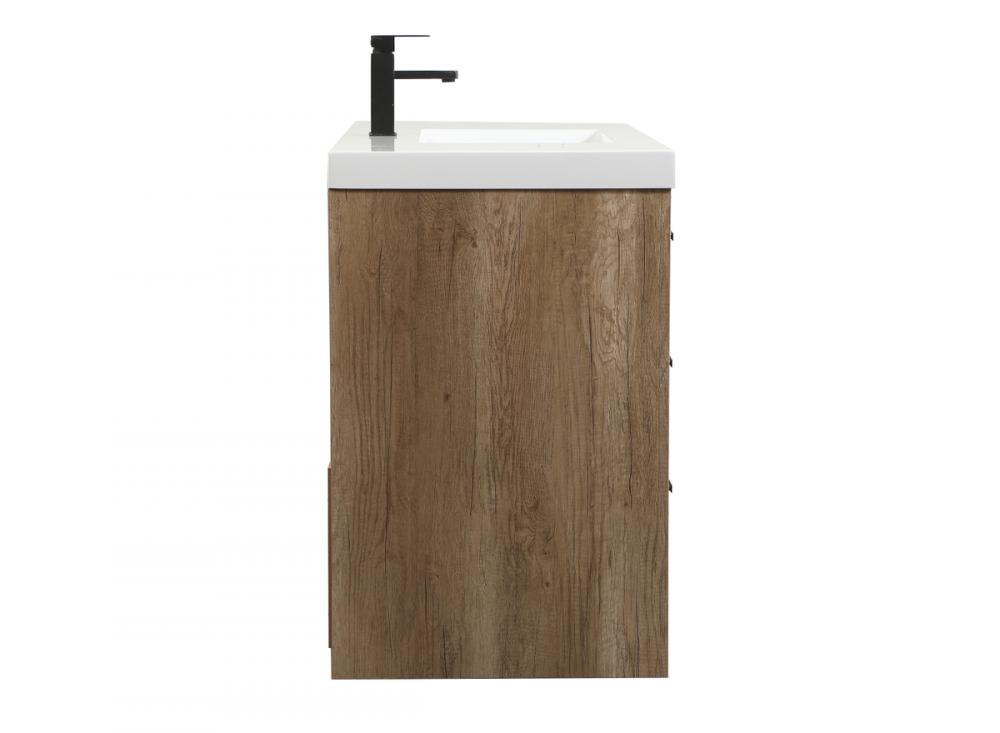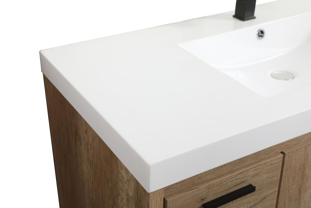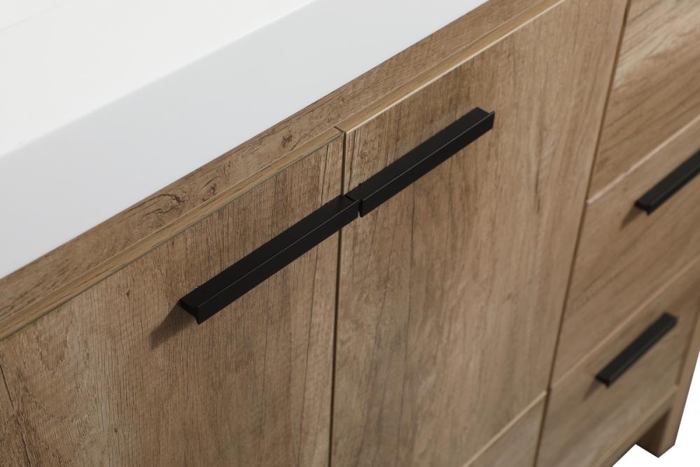 Modern sophistication is defined within the wood finish look and black barpulls of this vanity. Its length makes it the perfect addition to any sized home, and saves space with its storage area hidden behind the double cabinet doors and one bottom drawers. Topped with a highly durable thick resin white counter top and an integrated sink, this modern design will add everlasting class to your bathroom and powder room.