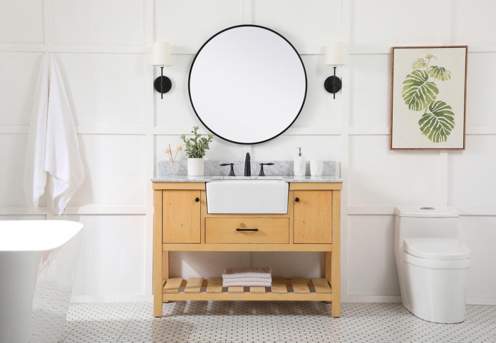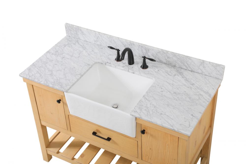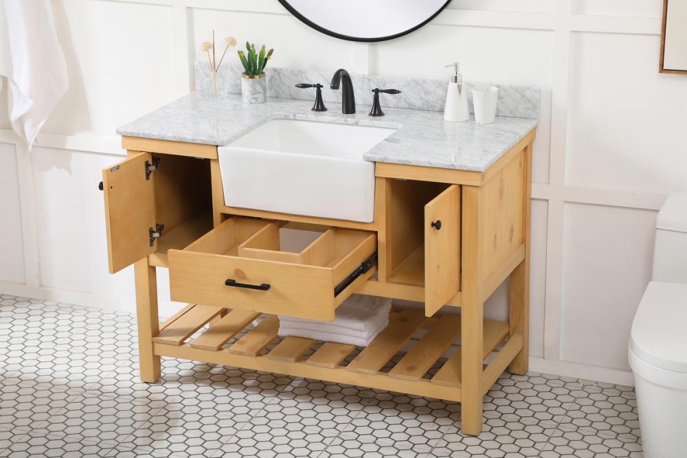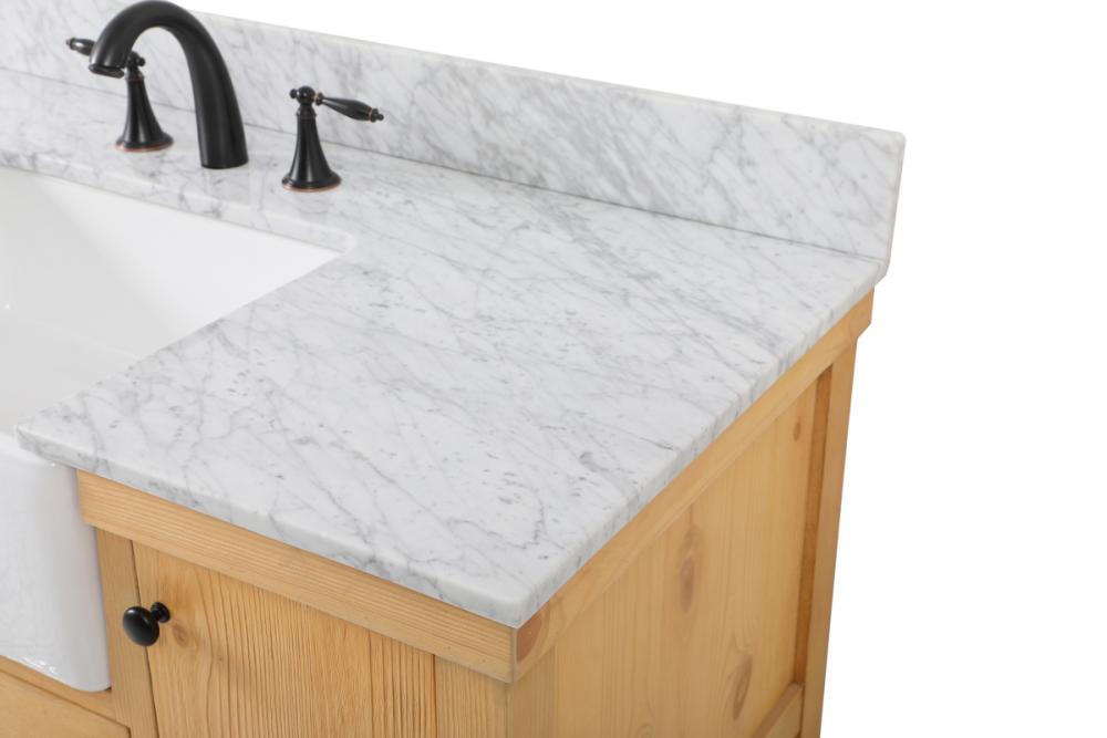 Make the most of your space with this farmhouse style bathroom vanity. Complements well with its beautiful finish, carrara white marble countertop, and the contemporary slender handle bar that sits on the functional drawers with soft closing mechanism, allowing you to store an assortment of bathroom essentials. The lower shelf makes it the perfect space to hold new towels for your guests. This stylish vanity ensures both form and function in your bathroom for you and your guests. Comes with a matching backsplash to complete the look and protects your wall.
