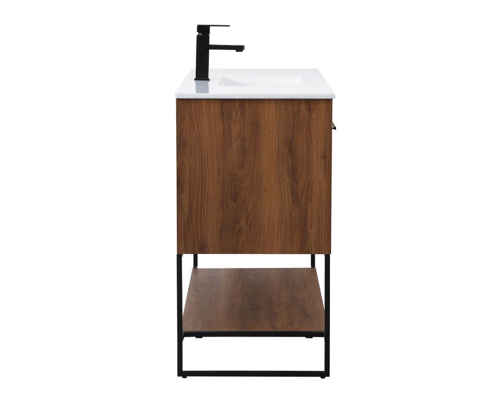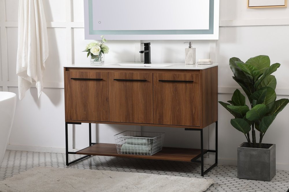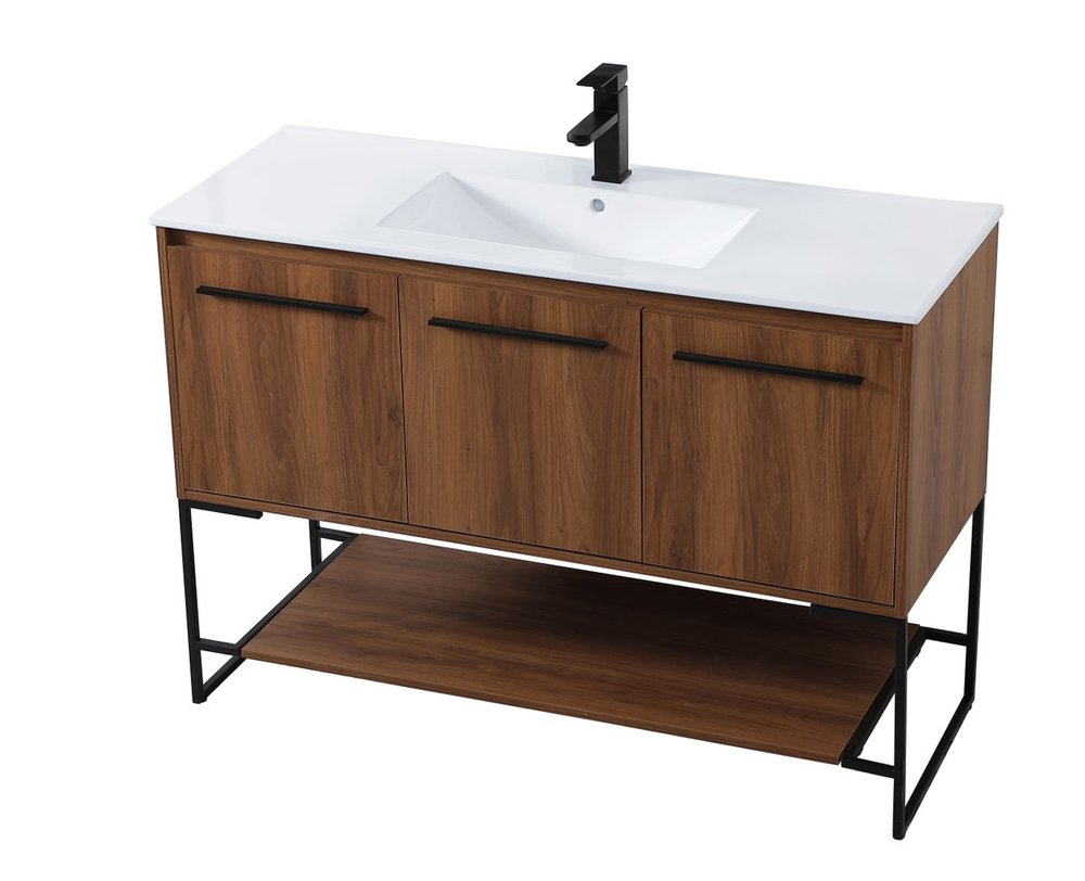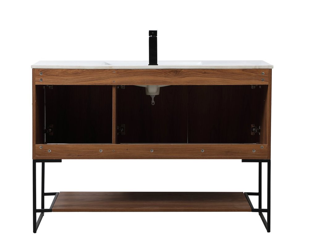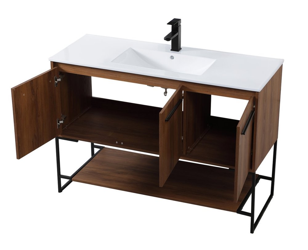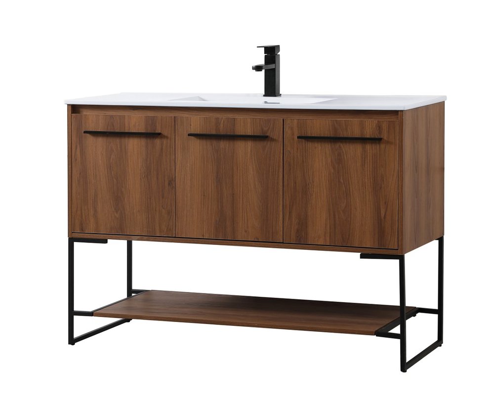 Live in modern comfort with this 48" walnut brown finish vanity. Dressed in a concrete grey and sleek black metal hardware, its contemporary style will have your bathroom or powder room elevated in industrial sophistication. The open shelf at the base and 3 doors reveal ample storage space for your bathroom essentials and miscellany. Clean lines create its own visual interest, adding trendy looks to your already chic room.