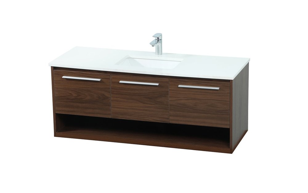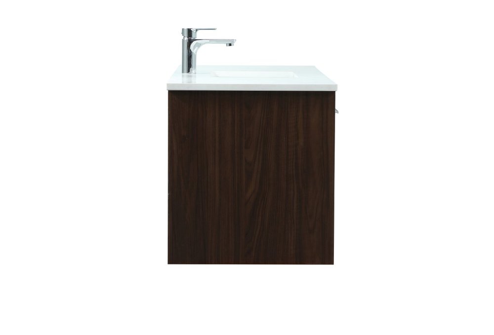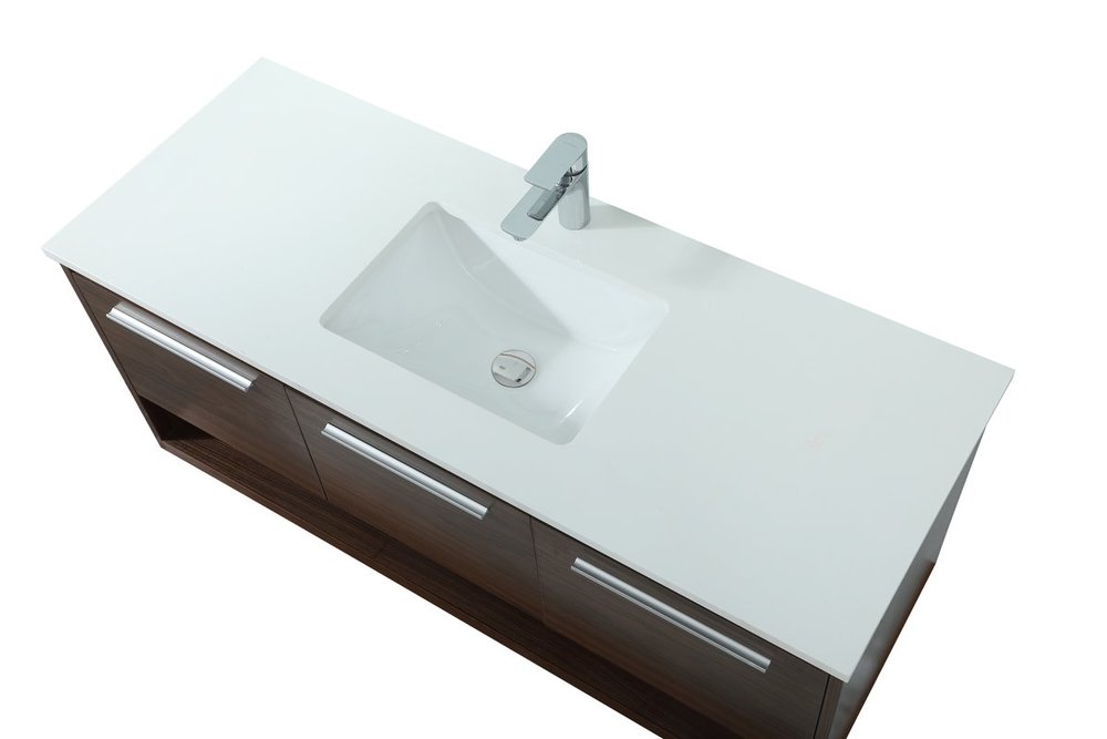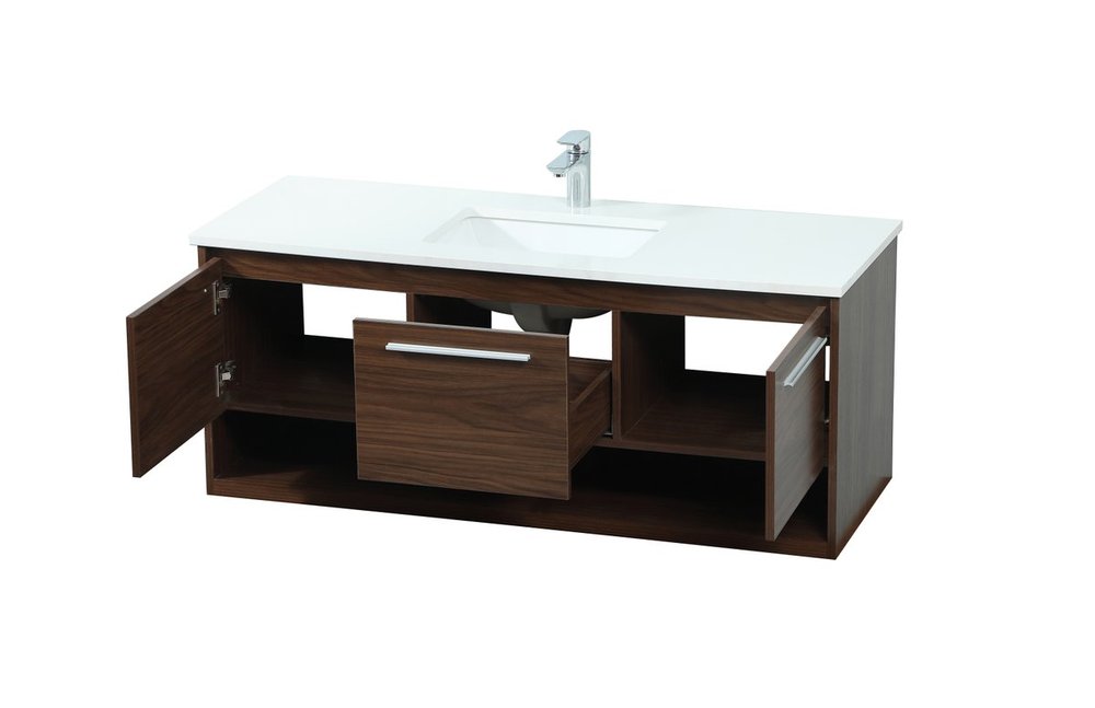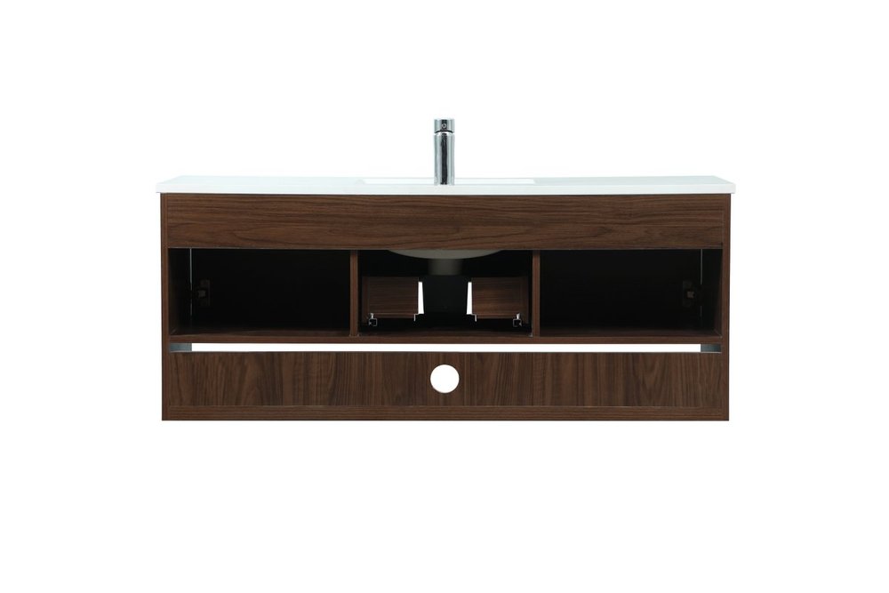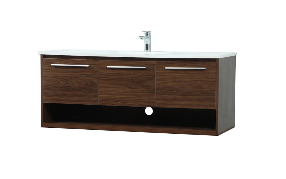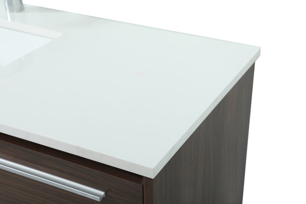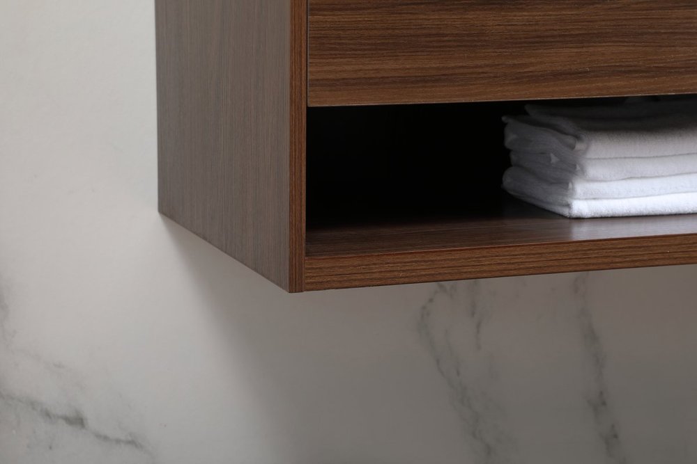 Save space and make your bathroom appear bigger with this floating vanity. Its minimal design will have you in awe, while its clean lines will leave your room feeling fresh and uncluttered. The Single u-drawer pulls out for storage while the open space below allows you to place extra towels or various other essentials. The ivory white engineered marble counter top with porcelain sink adds refined luxe while the aluminum barpull style handle adorn the vanity face.