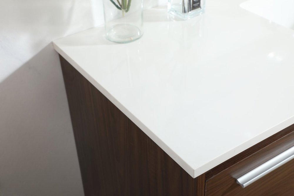 Comes with an undermount porcelain sink and a durable ivory white engineered marble stone top