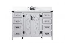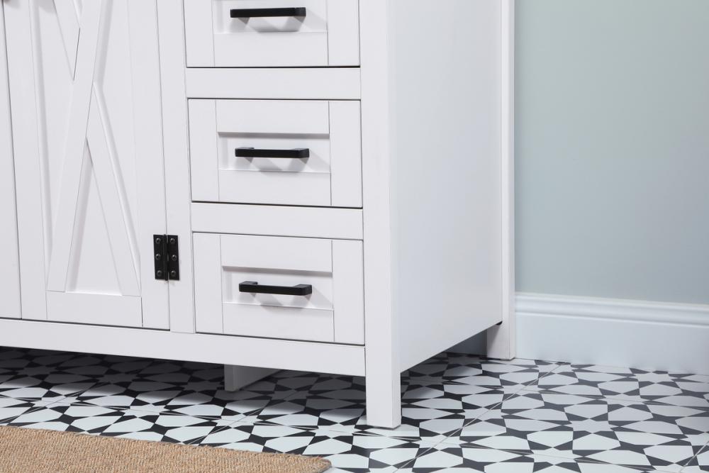 Reminiscent of barn doors, the two door cabinet and eight drawers adds both stylistic charm and function with its plethora of storage options for all your bathroom essentials. Whether for your bathroom or the guests', everyone will marvel at its classic look for traditional and farmhouse aesthetics. A slab of engineered marble rounds out the piece up top, as well as the porcelain under mount sink and predrilled faucet holes. This vanity arrives fully assembled. Comes with a matching backsplash to complete the look and protects your wall.