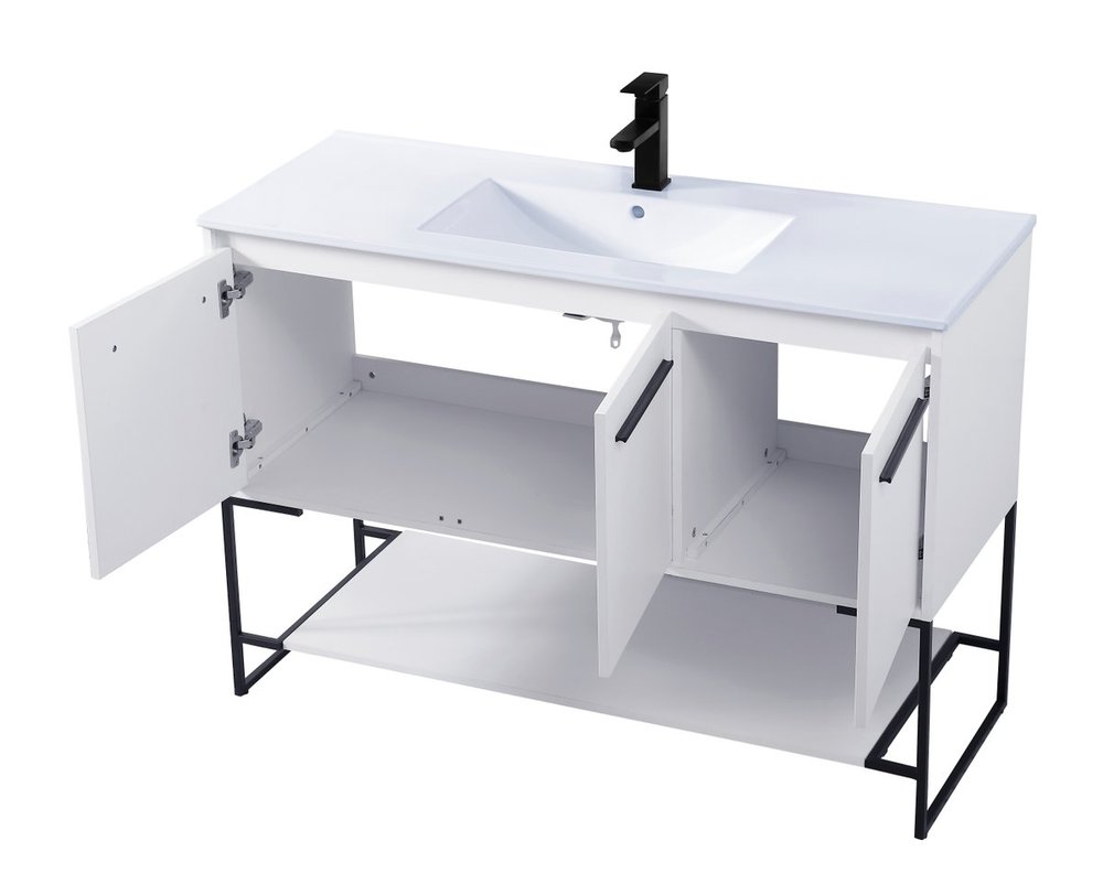 Live in modern comfort with this 48" white finish vanity. Dressed in a concrete grey and sleek black metal hardware, its contemporary style will have your bathroom or powder room elevated in industrial sophistication. The open shelf at the base and 3 doors reveal ample storage space for your bathroom essentials and miscellany. Clean lines create its own visual interest, adding trendy looks to your already chic room.