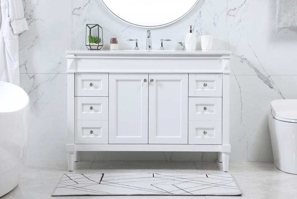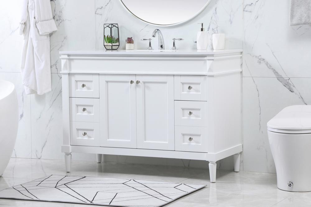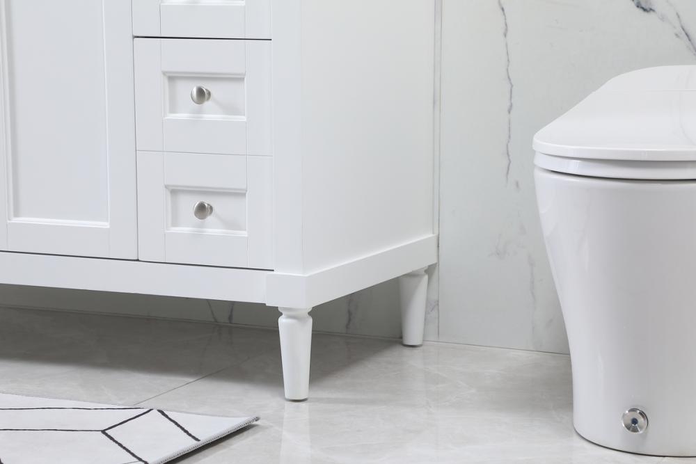 This transitional vanity is a beautiful piece of bathroom furniture will look amazing in your design scheme. The cabinet features a shaker style smooth door panel with simple round knobs and soft close hinges provide ample room for accessories. Packed with multiple side drawers with soft close glides for added comfort and full access to bath supplies. Convenient deep drawer stores all of your tall bath essentials. Constructed of engineered wood and solid wood legs with hand painted finish. The durable engineered marble countertop is a versatile material in an ivory white finish. Minor assembly of the legs needed to get this vanity up and running.