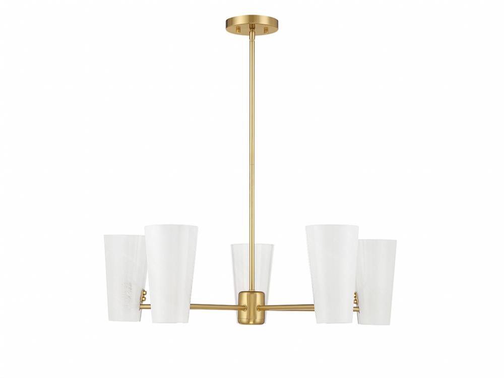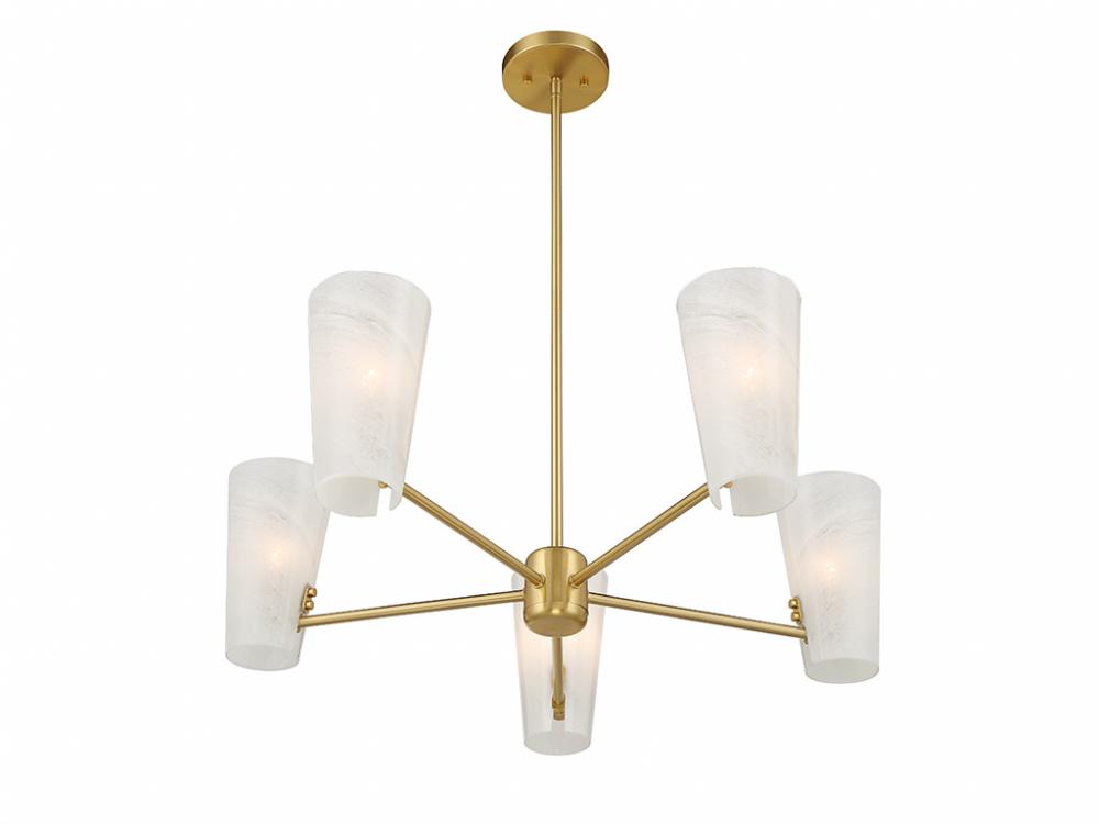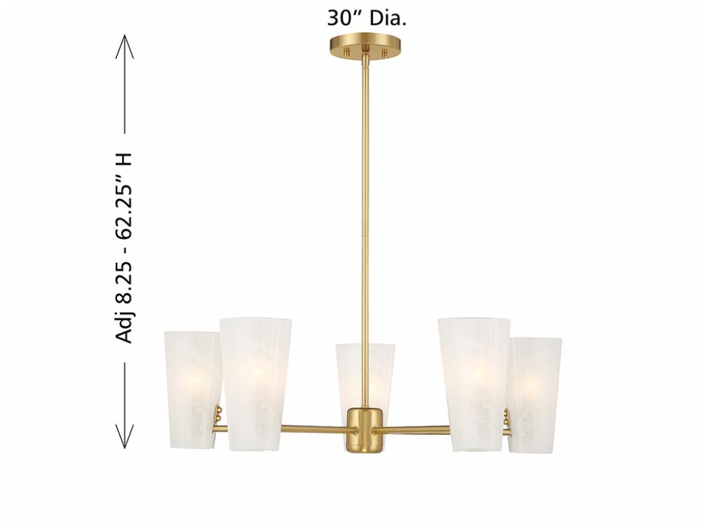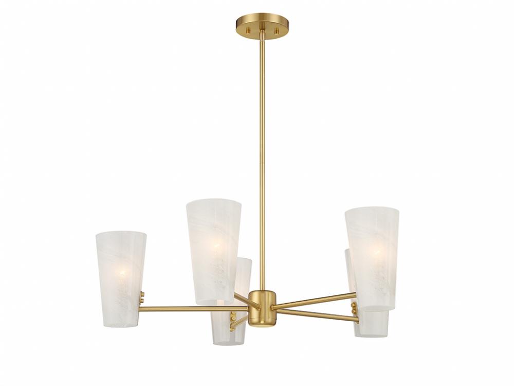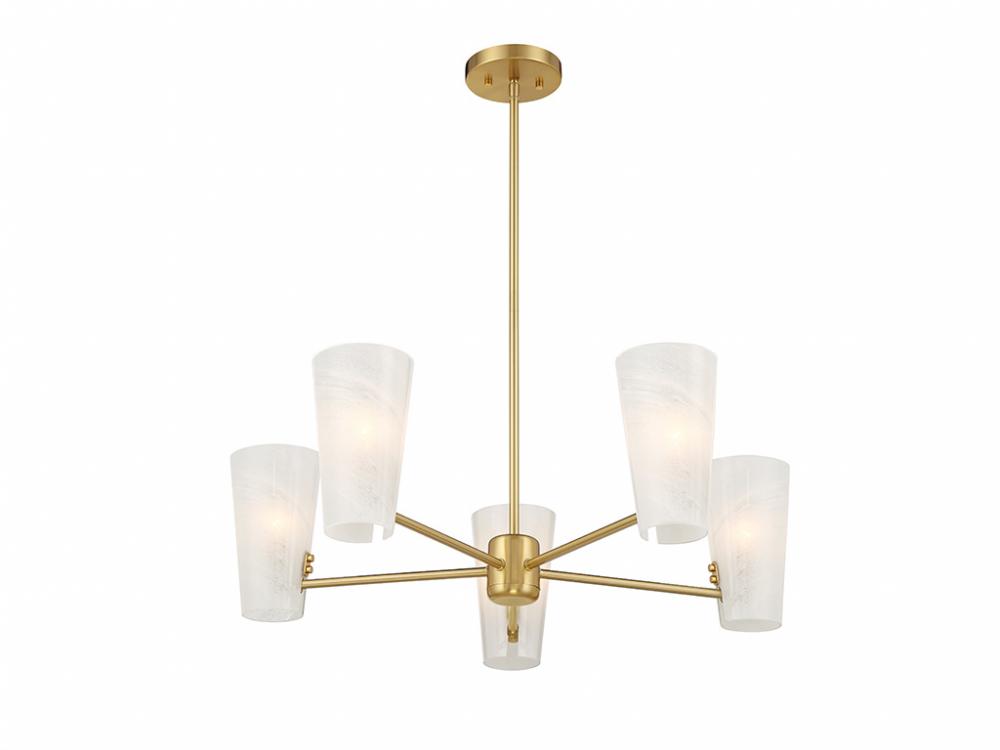 This 5-light chandelier takes mid-century modern style and gives it a fresh, magical twist with shades of strie glass featuring dazzling swirls that draw the eye, soften the glow and work beautifully with the Natural Brass finish. The chandelier is 30" in width and has an adjustable height ranging from 8.25" to 62.25". It comes with four 12" downrods and one 6" downrod. Uses 5 candelabra size bulbs of up to 60 watts per bulb. Bulbs not included.