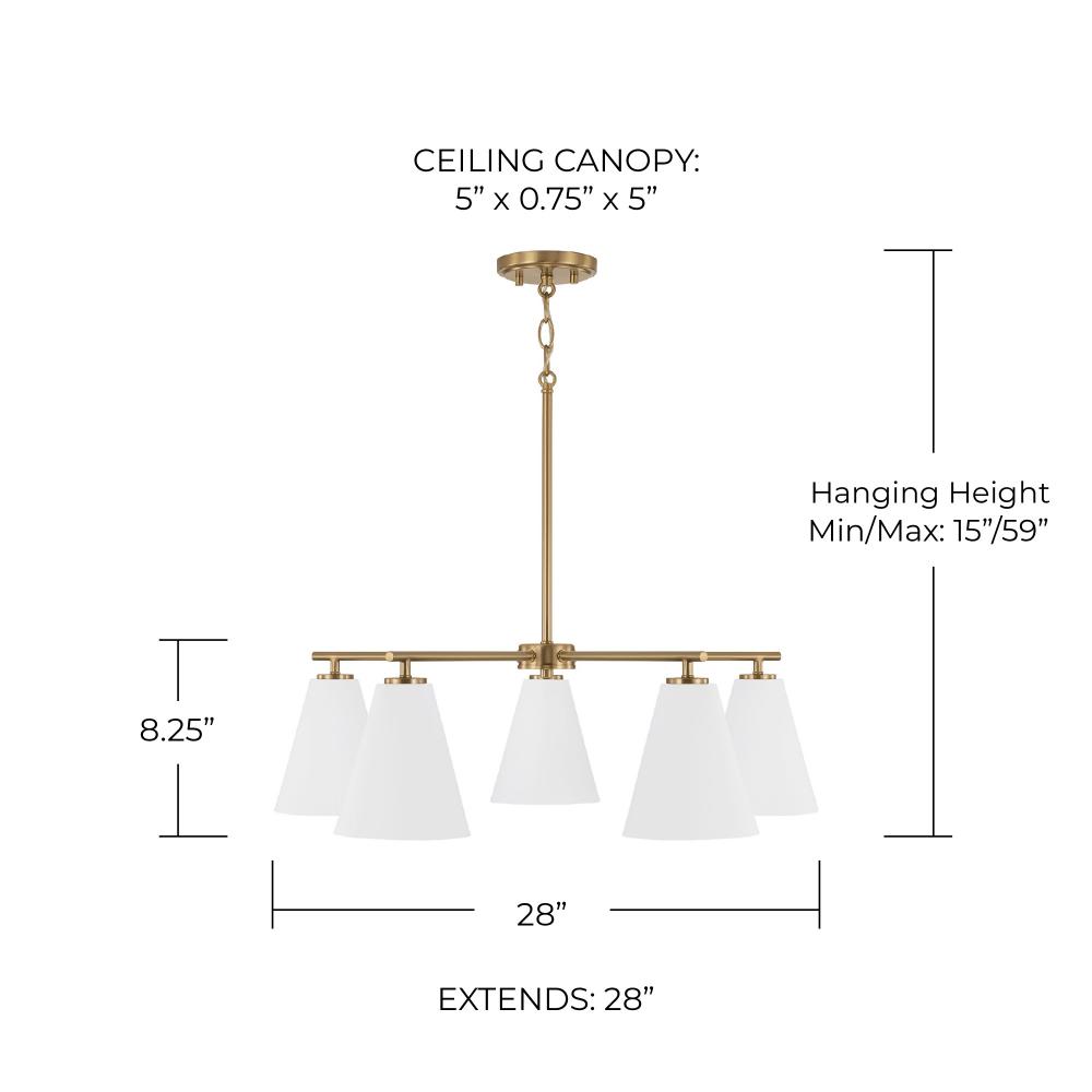 Featuring sleek metal shades and Matte Brass details, the Charlie Chandelier punctuates any space. The cone shape paired with the Matte White finish delivers classic style all around.