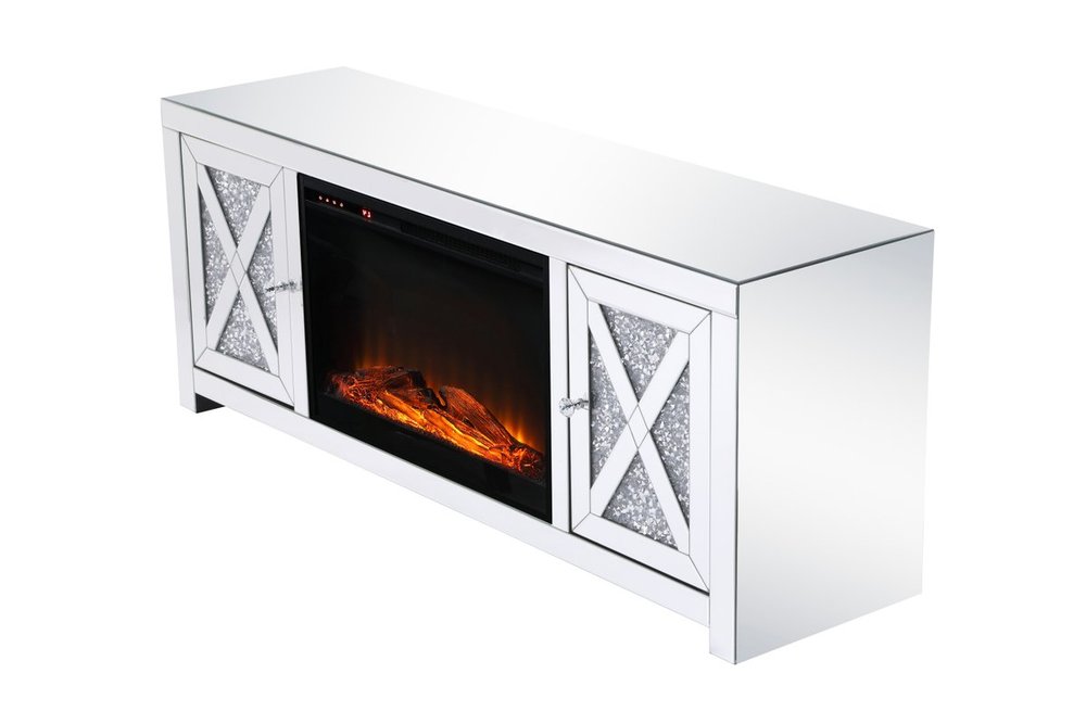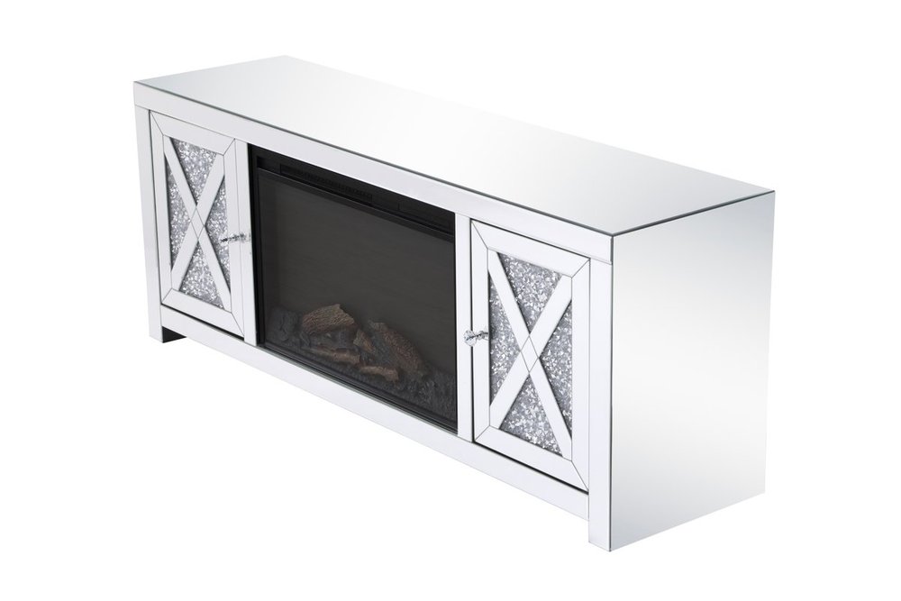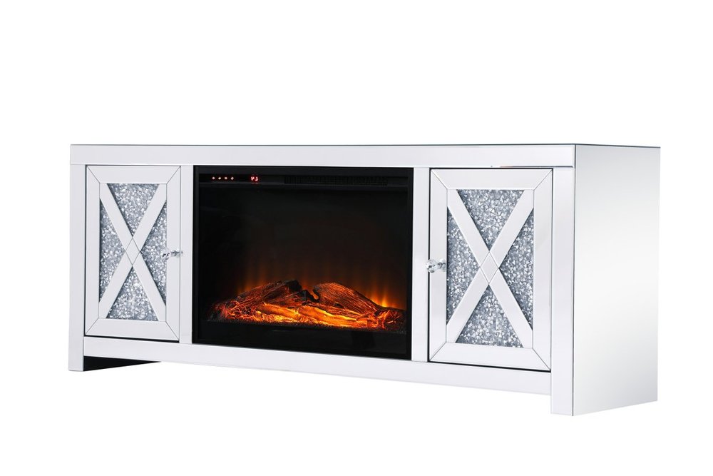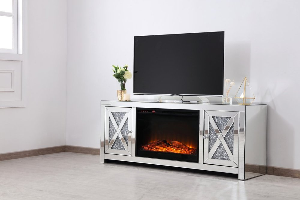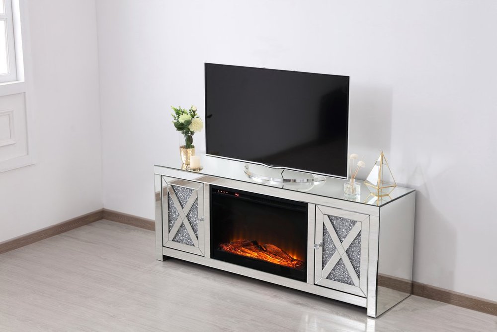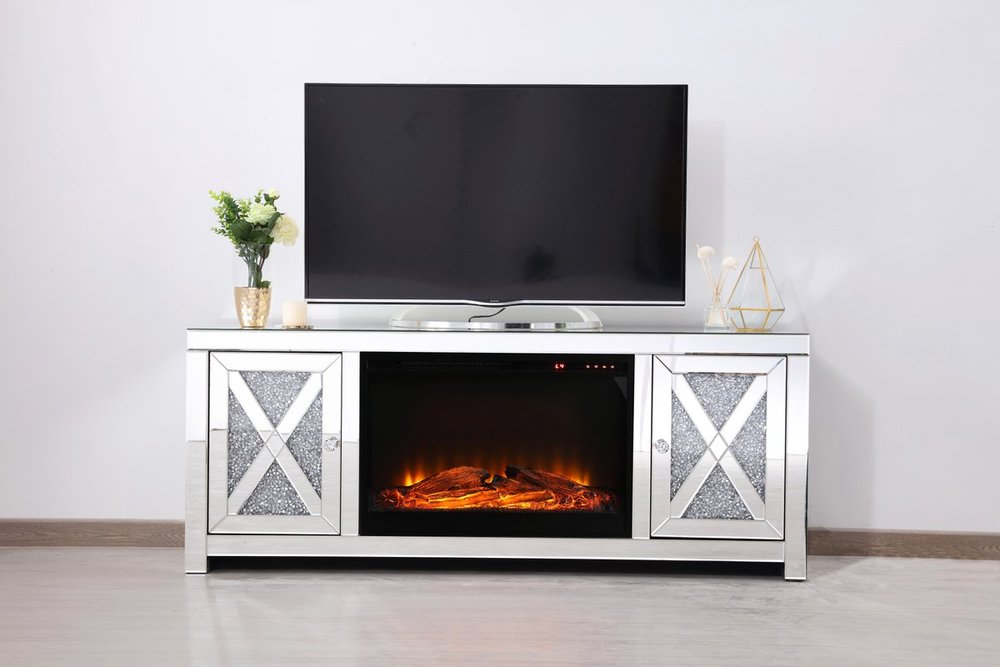This mirror paneled tv stand fireplace combination is the perfect complement to your entertainment spaces. You can enjoy watching endless movies, host premier nights, or play video games until the stars are sparkling just as bright as the silver crystals that embellish the panels within the X-shaped details of the cabinet doors, which opens to reveal a storage area that is the perfect place to put away board games and various trinkets. Whether you are hosting a formal dinner party with associates or a casual get together with your loved ones, the comfort of the crackling fire in the wood log fireplace insert will put all your guests in a relaxed and merry mood. The perfect home for your tv, movies, and board games, this stand combines sparkling beauty with function.