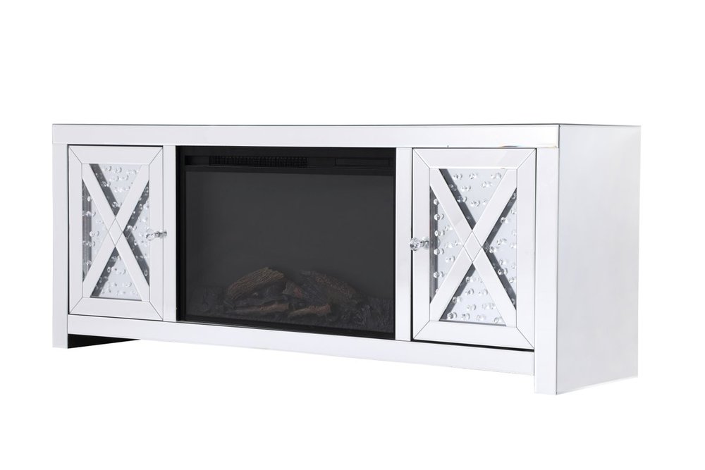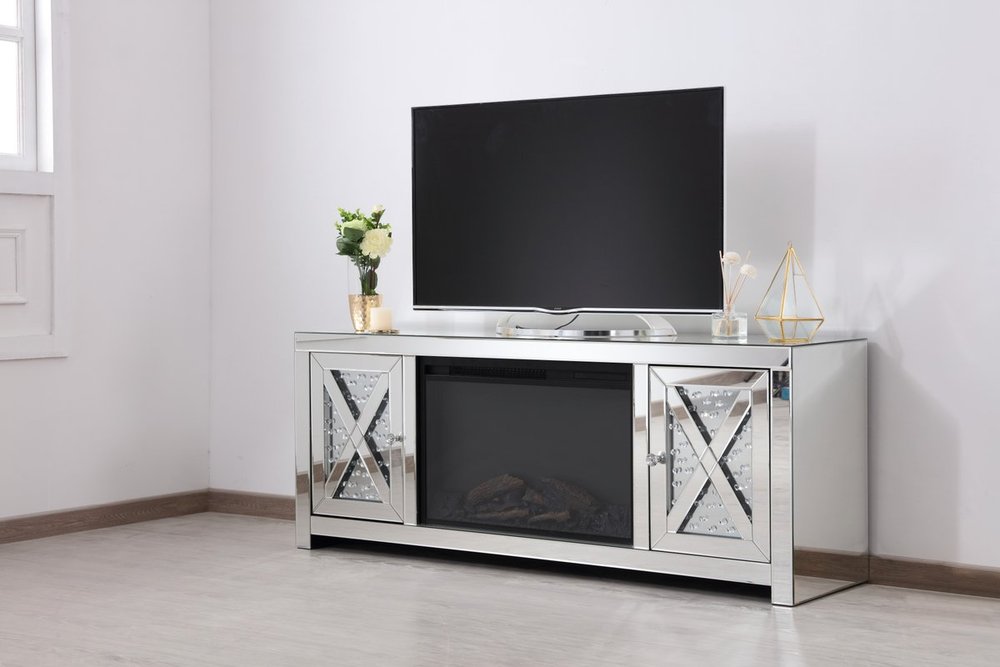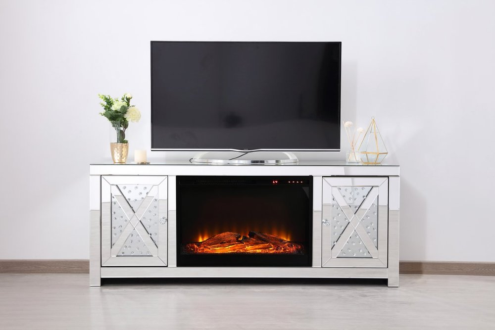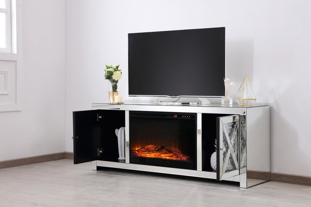 This mirror paneled tv stand fireplace combination is the perfect complement to your entertainment spaces. You can enjoy watching endless movies, host premier nights, or play video games until the stars are sparkling just as bright as the clear crystals that embellish the panels within the X-shaped details of the cabinet doors, which opens to reveal a storage area that is the perfect place to put away board games and various trinkets. Whether you are hosting a formal dinner party with associates or a casual get together with your loved ones, the comfort of the crackling fire in the wood log fireplace insert will put all your guests in a relaxed and merry mood. The perfect home for your tv, movies, and board games, this stand combines sparkling beauty with function.