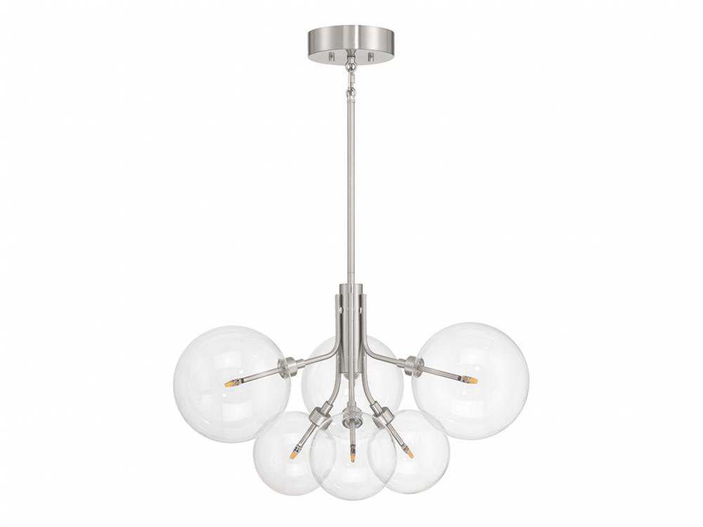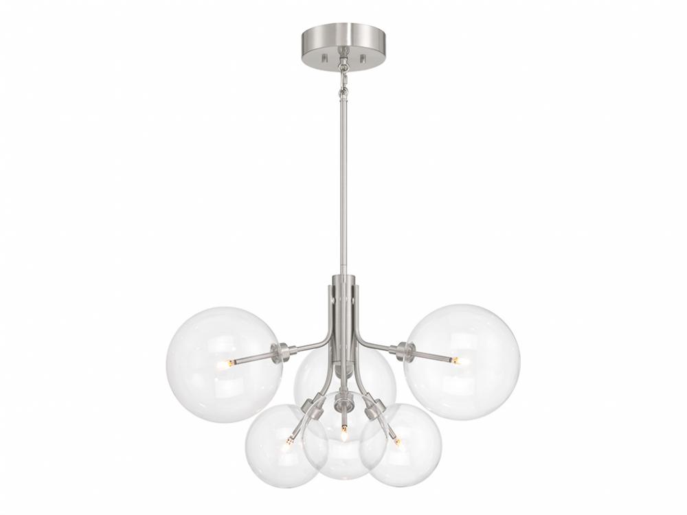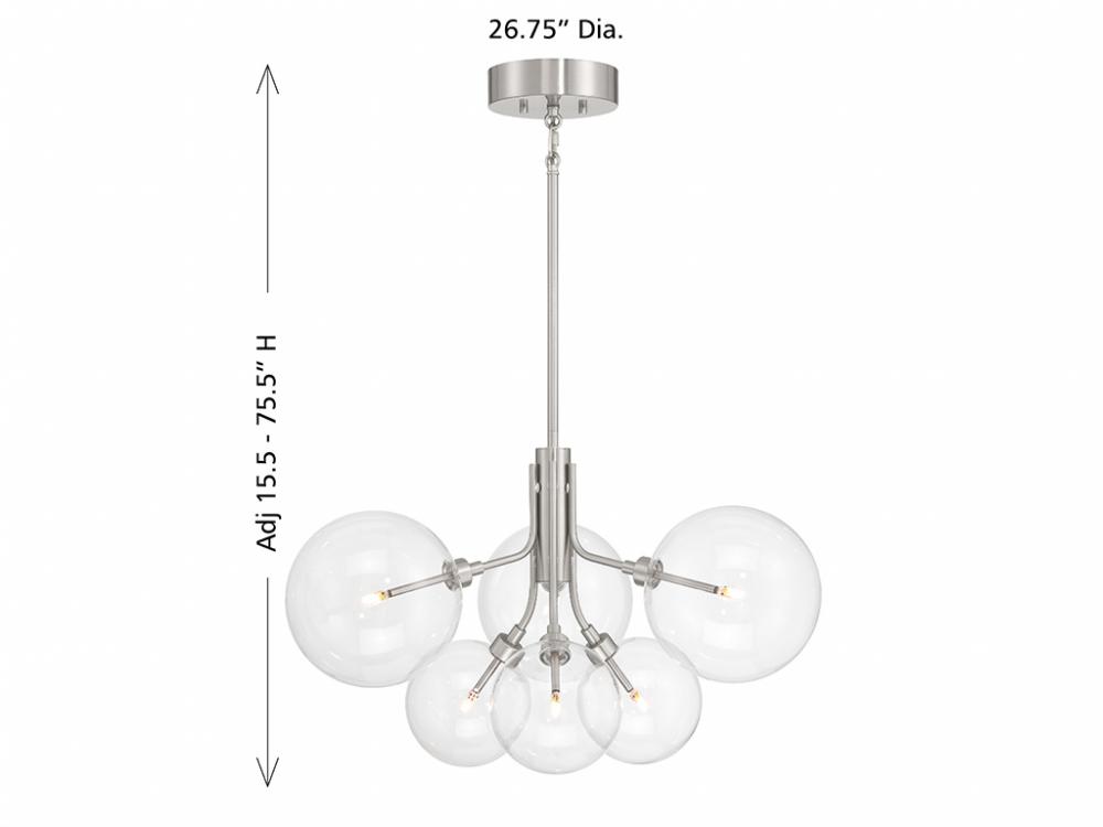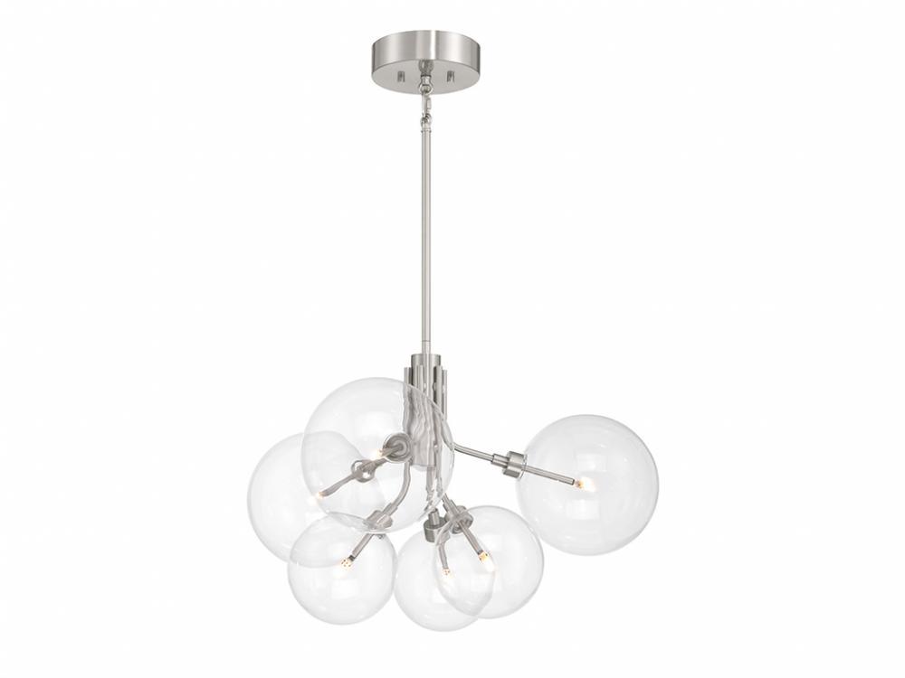 This 6-light chandelier has an effervescent look with its bubbles of clear glass atop short, sleek arms finished in Brushed Nickel. Small yet mighty LED bulbs are held within the bubbles to add even more sleekness. This chandelier is 26.75" in width and has an adjustable height ranging from 15.5" to 75.5". It uses six T4 size LED bulbs that are included. Comes with four 12" downrods and one 6" downrod.