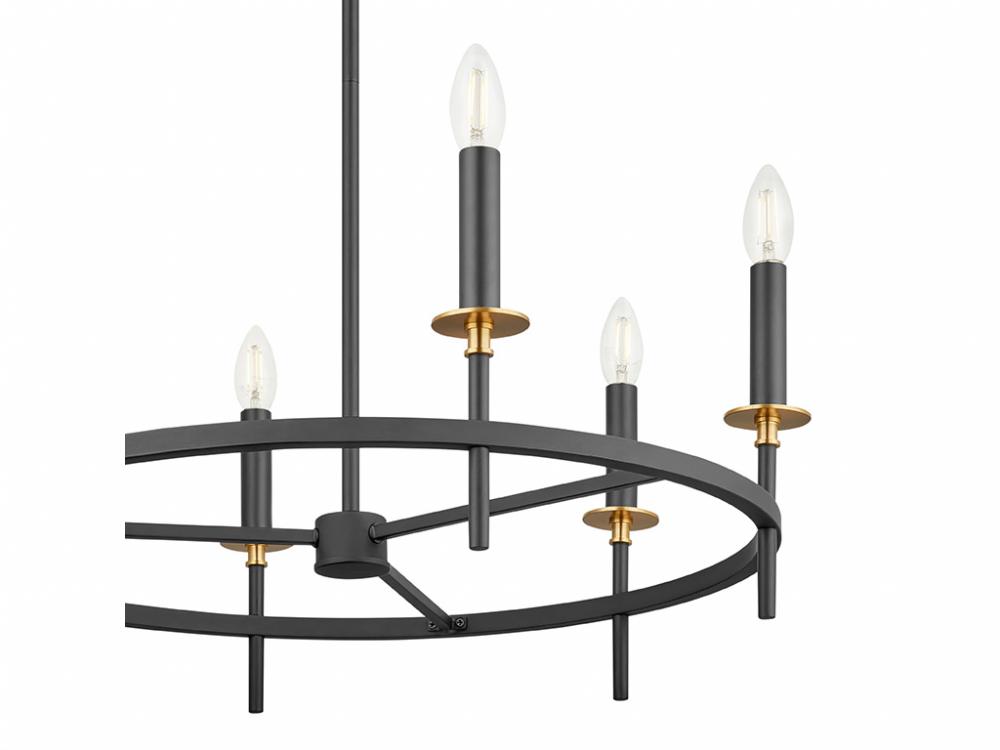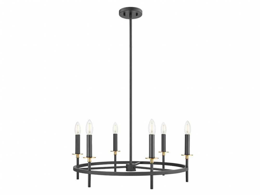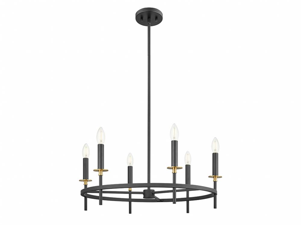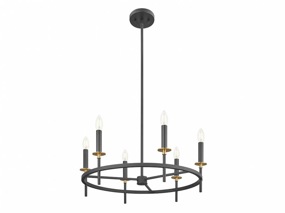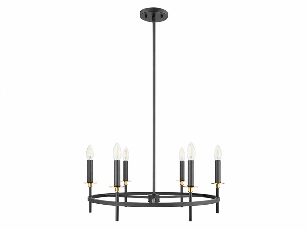 Discover an elegant lighting look with this 6-light chandelier. It showcases an understated style, is dressed in a Matte Black finish and is accentuated by stylized bobeches finished in Natural Brass. It is 9" in height and 25" in width. Uses six candelabra size bulbs of up to 60 watts per bulb. Bulbs not included.
