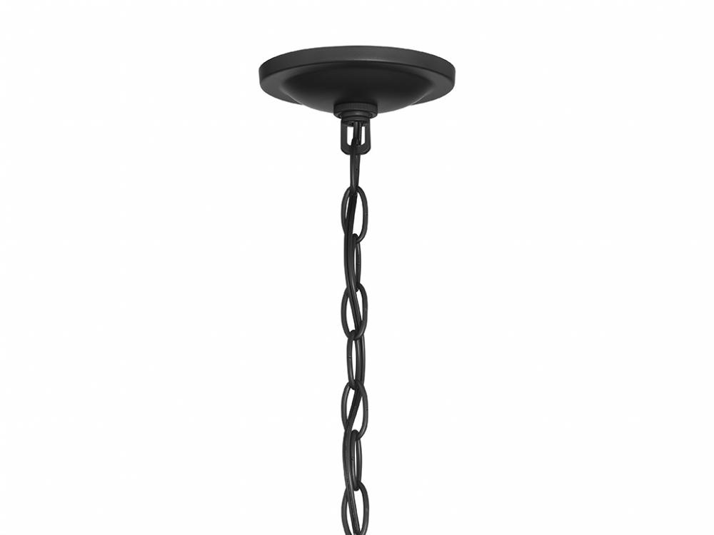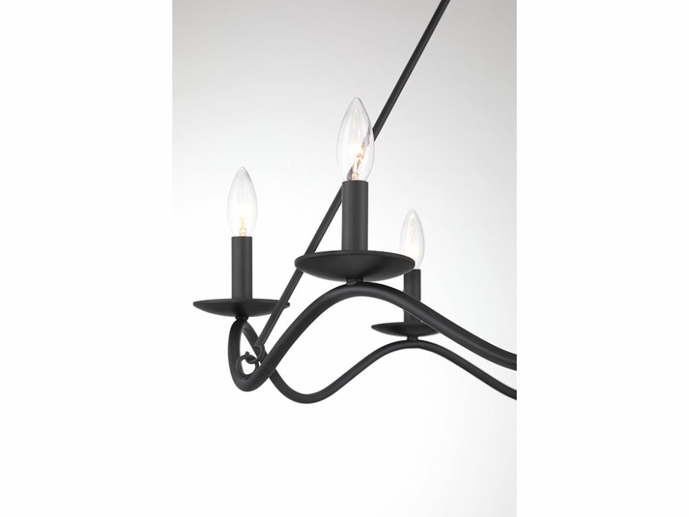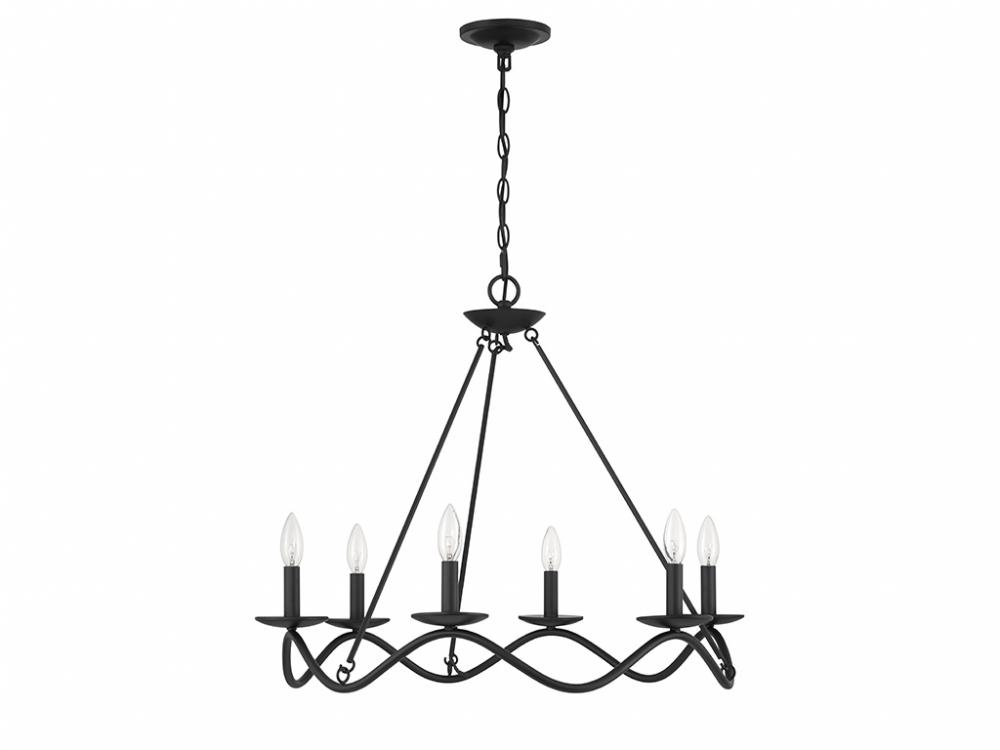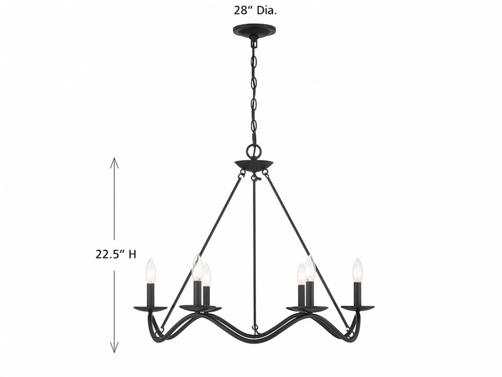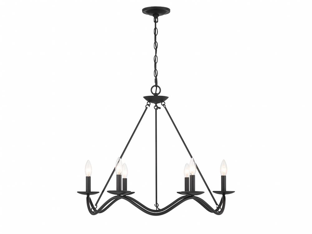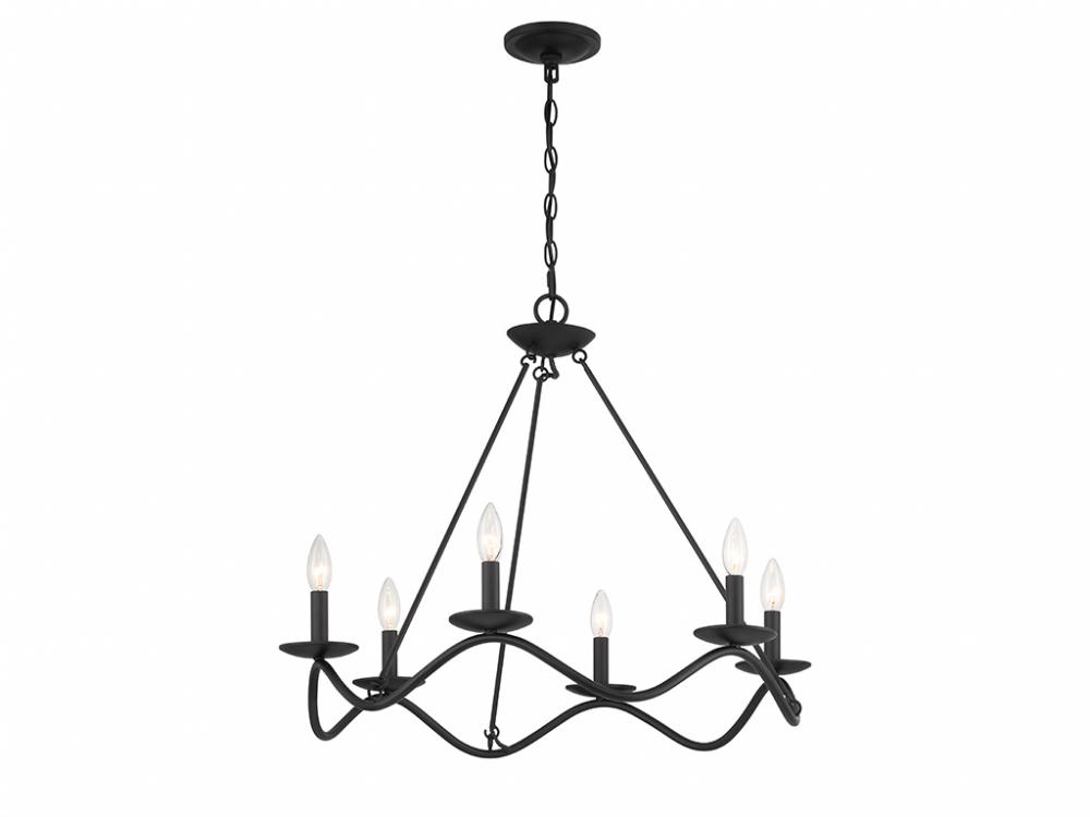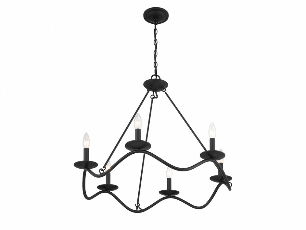 Traditional chandelier style is given a fun touch of movement in this 6-light chandelier. An undulating frame is finished in Matte Black and dotted with sleek bobeches holding elegantly exposed bulbs. This is a perfect way to freshen up the look of any room! The chandelier is 22.5" in height and 28" in width. It uses 6 candelabra size bulbs of up to 60 watts per bulb. Bulbs not included.