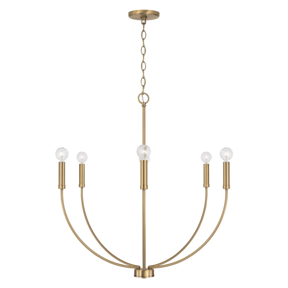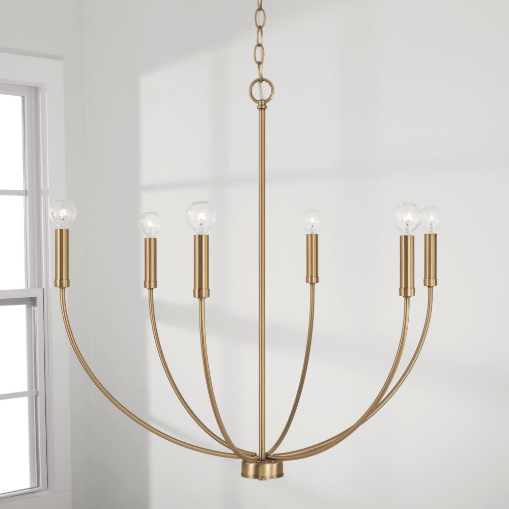 A classic shape refreshed with sleek contours and sweeping curves, the Ansley 6-Light Chandelier for HomePlace makes a statement that suits every style. The elongated arms and open silhouette invites standout style that doesn't overpower, while the Aged Brass finish gives a nod to mid-century style.