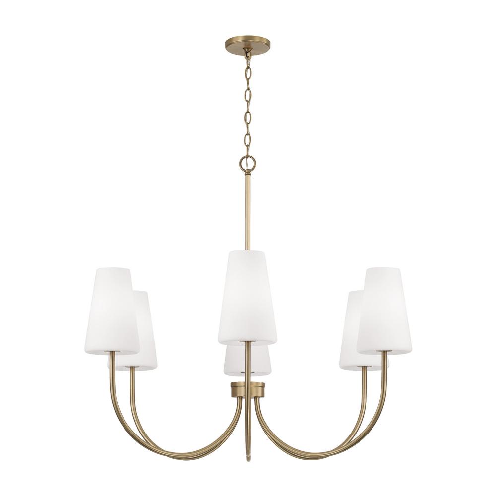 Classic curves and grand scale create the Averitt Medium Chandelier. The elongated Soft White glass tapered shades complement the sleek arms for elegant transitional style, while the Aged Brass finish creates visual warmth and subtle shine.