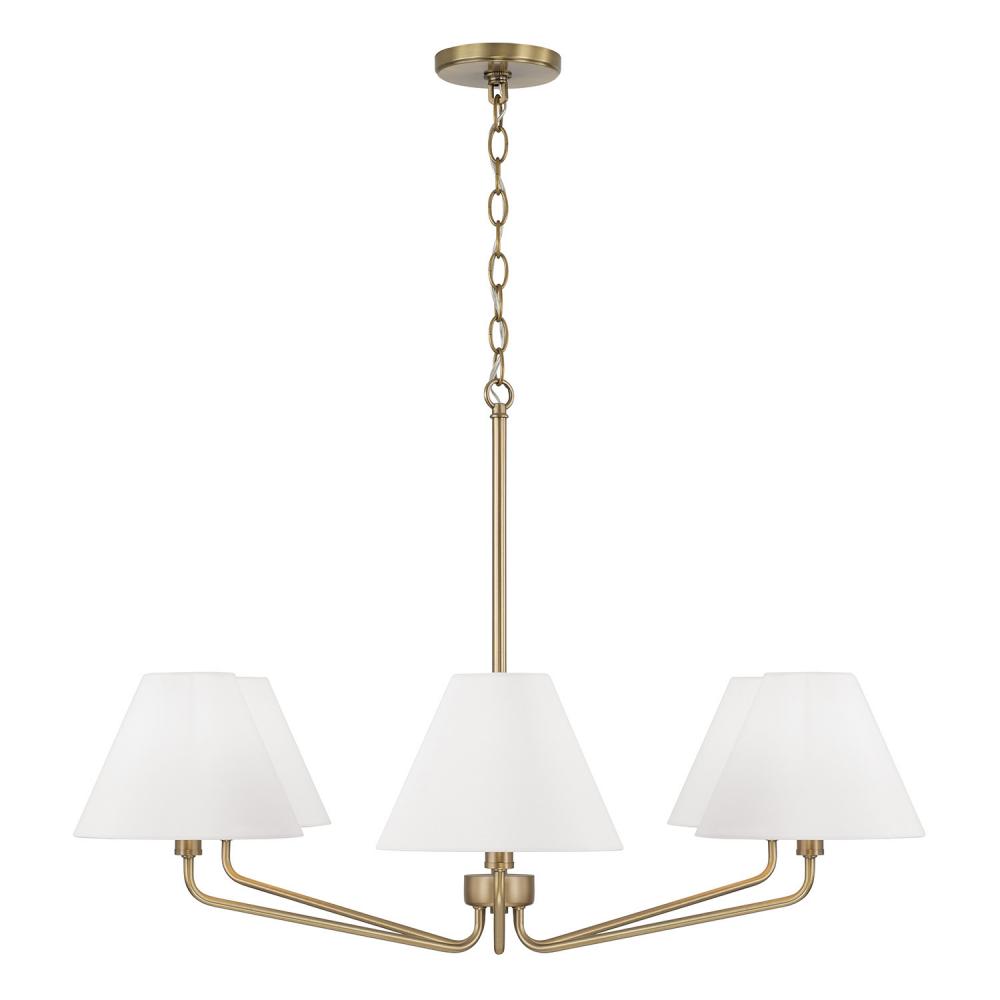 Soft angles and classic style create the Chadwick Medium Chandelier. The tapered White fabric shades bring a visual balance to the elegant metal arms, finished in Aged Brass for a mid-century touch of shine.