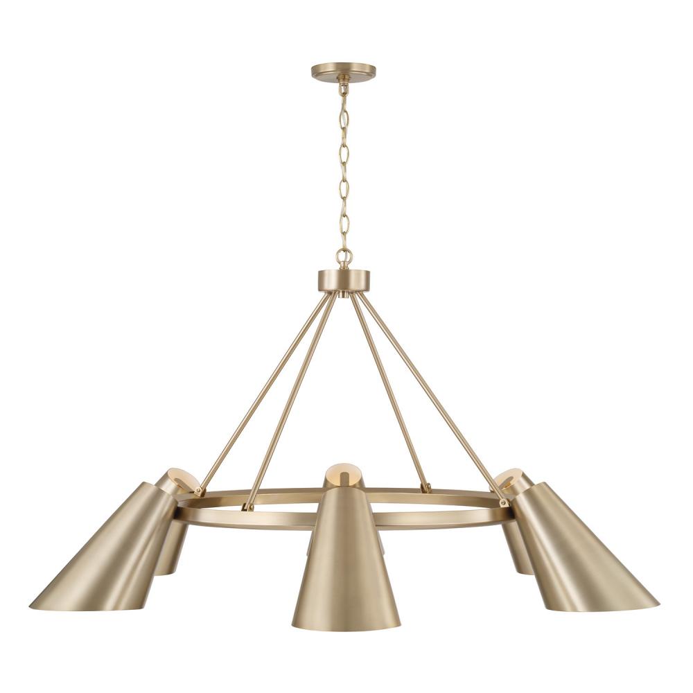 Bring grand scale and modern glam with the sleek, angular form of the Leo Chandelier. Open on top and bottom, the tapered metal shades offer tailored illumination, complemented by the mixed-metal aesthetic of the Matte Brass finish and painted White interior.