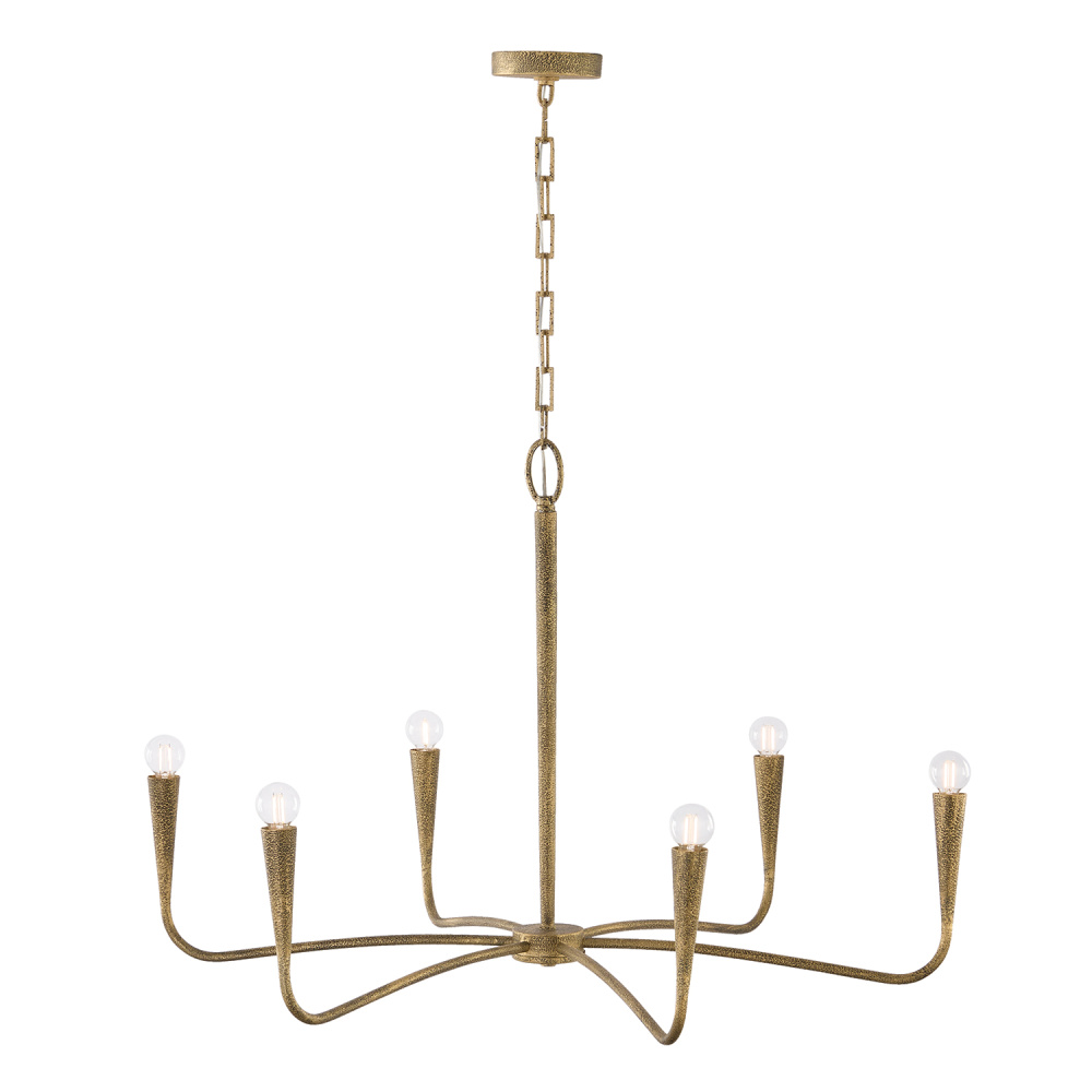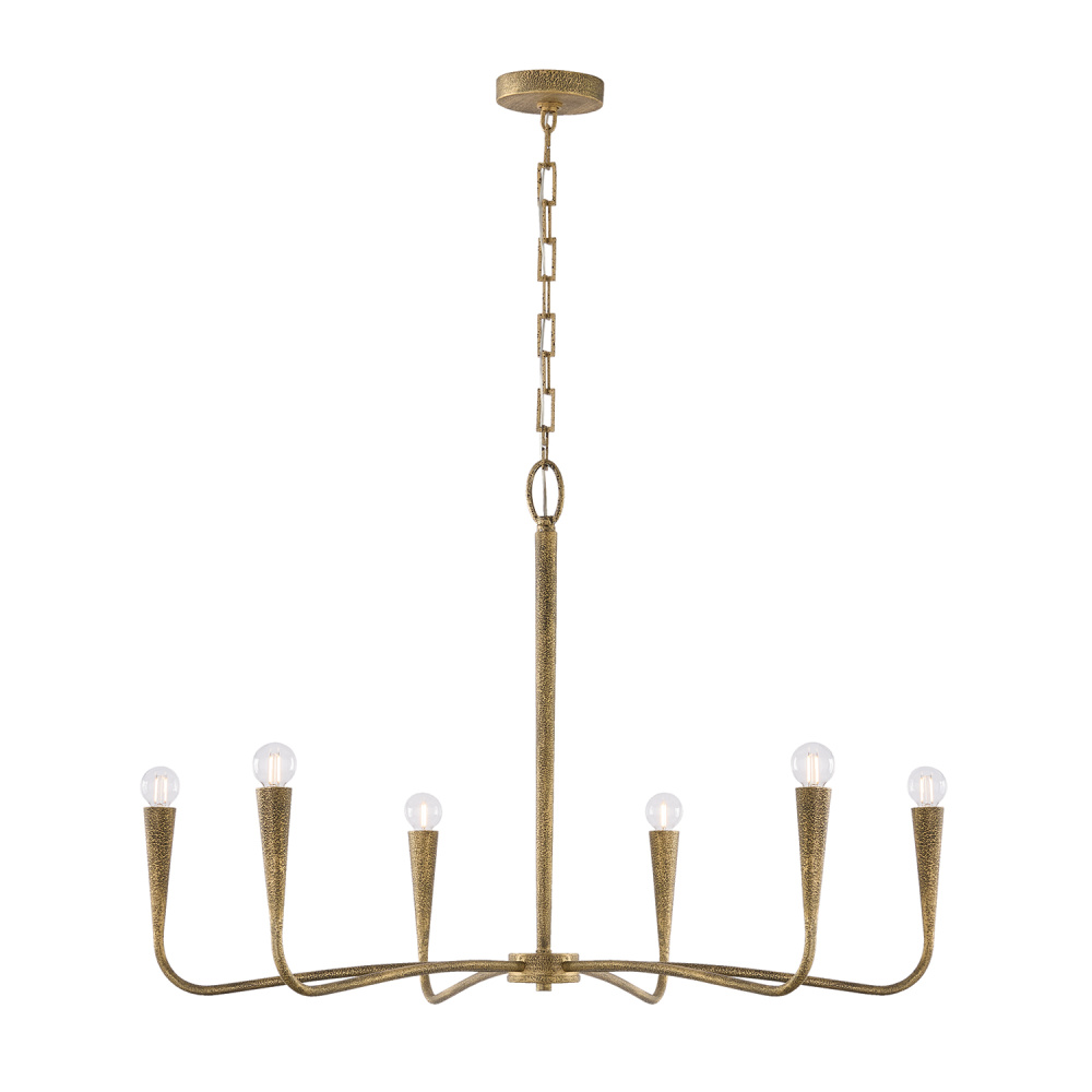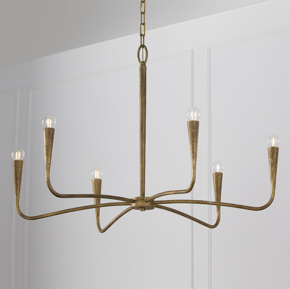A unique, sweeping silhouette and handcrafted finish form the Savari Large Chandelier. A smooth transition between arms and candle sleeves gives this luminaire a seamless look, complemented by the elevated aesthetic of slightly sunken sockets and designer chains. With layers of hand-painted texture, the Artisan Gold finish creates captivating dimension at every glimpse.