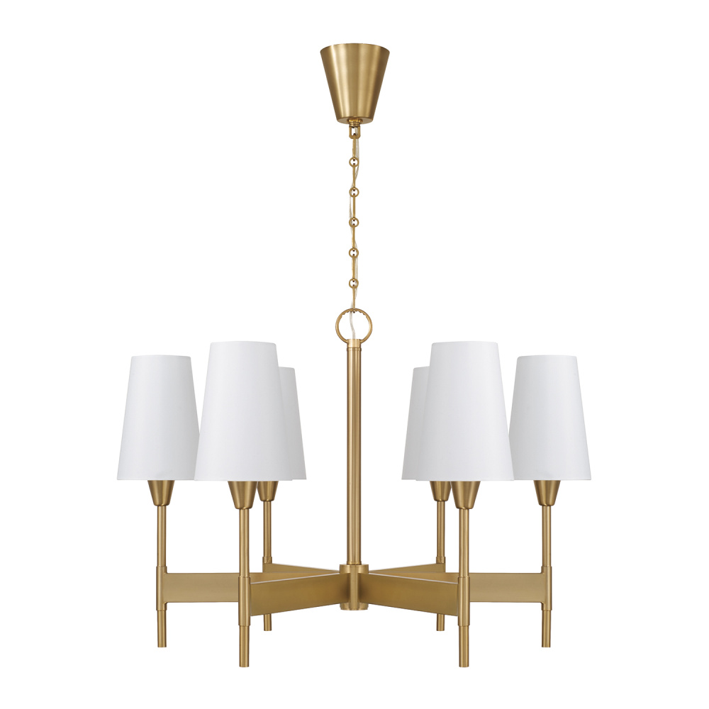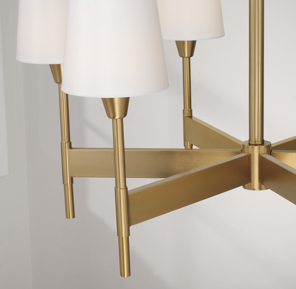 The Leland Medium Chandelier exudes transitional design with bold and artful details. The wide lines bring structure to the classic silhouette, punctuated by tapered socket details and White fabric shades. This distinct luminaire is finished in Aged Brass and a unique designer canopy for timeless, elevated style.
