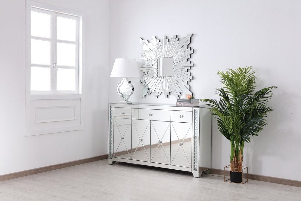 With 4 doors in bold criss-cross symmetry, measuring W60"xD14"xH36”, this modern credenza can decorate any dining room or narrow hallway and still yield plenty of storage space. With the gleaming beveled mirror surfaces and crushed diamond-like clear crystal inlay border, it opens up the visual space in the room while imbuing it with glamour. The jewel-like crystal door knobs exude sheer luxury. Fully assembled.
