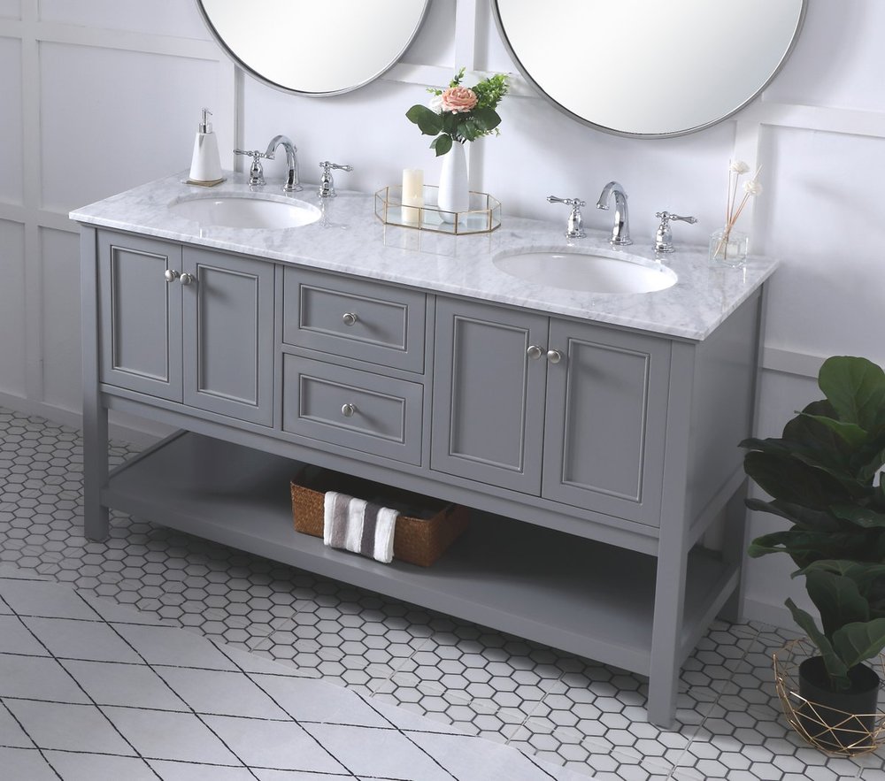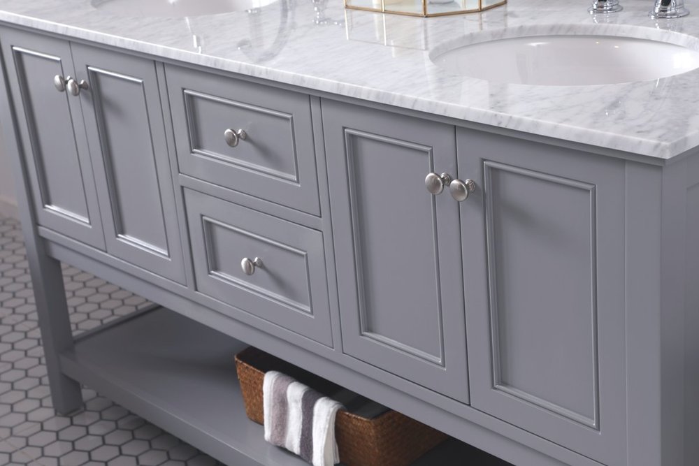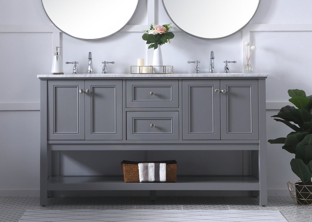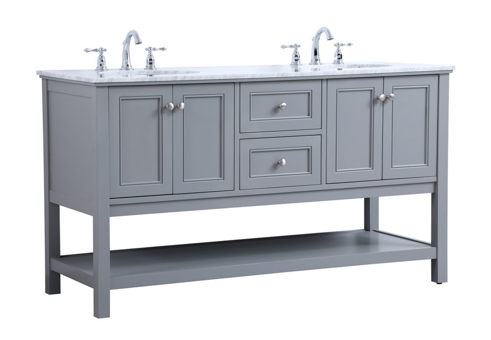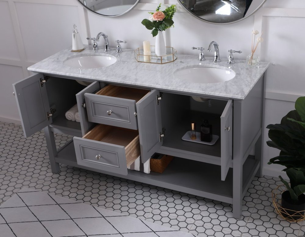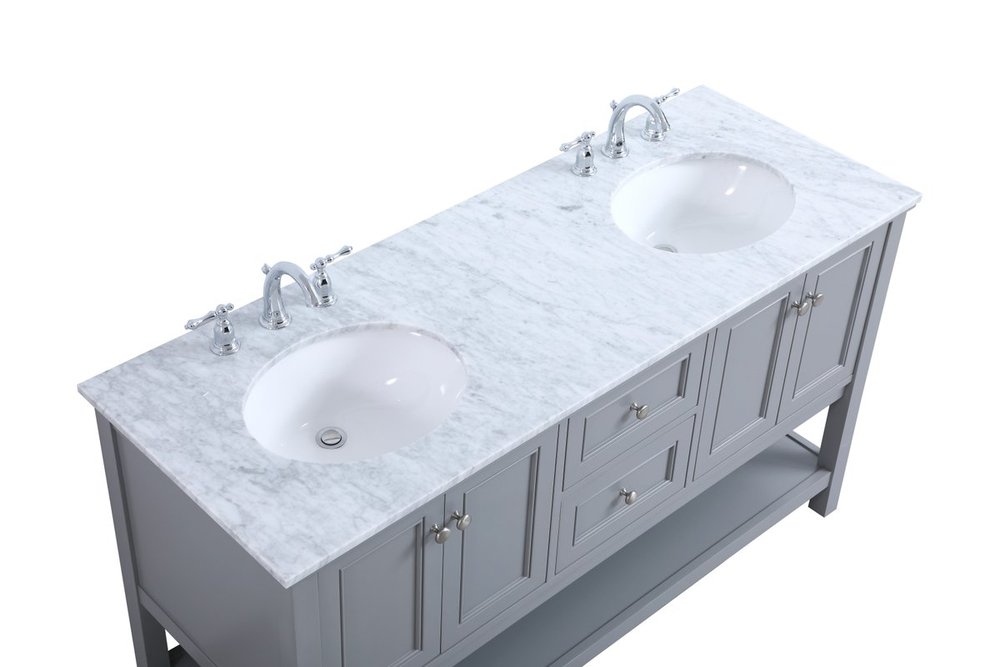 Create a refined and relaxing bath space with this contemporary design vanity, presenting its simplicity and clean straight lines in a minimalist appeal. This 60" freestanding vanity, crafted of solid poplar wood in a soft-grey finish, provides ample storage within its double center drawers and 4 side doors, all equipped with soft closing mechanism and accentuated with gleaming chrome hardware. Rounding out the design is a luxurious Itallian Carrara white marble countertop and double white porcelain under-mount oval sink.