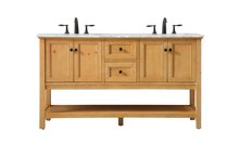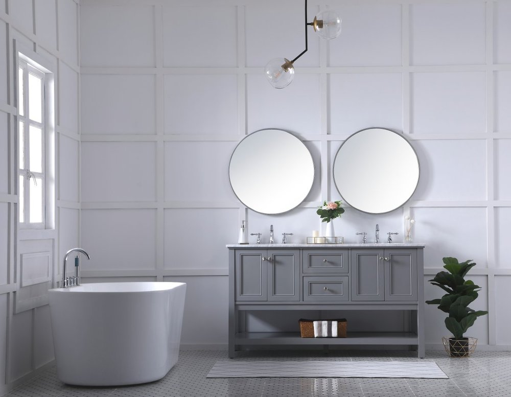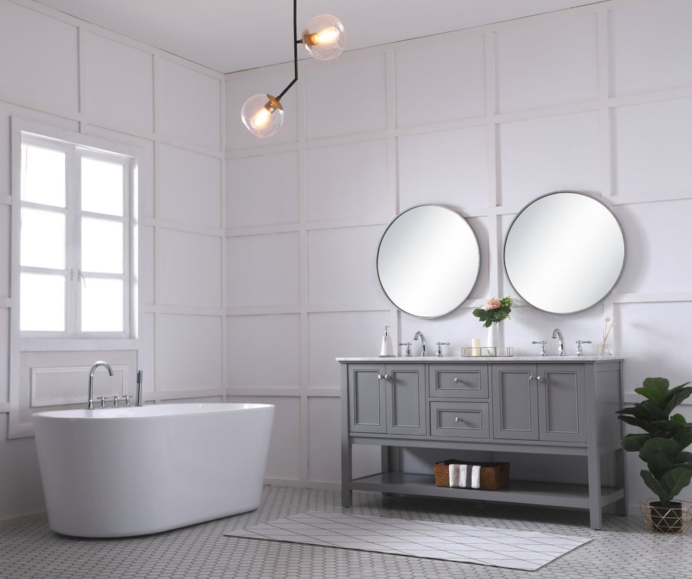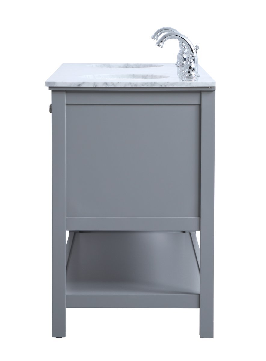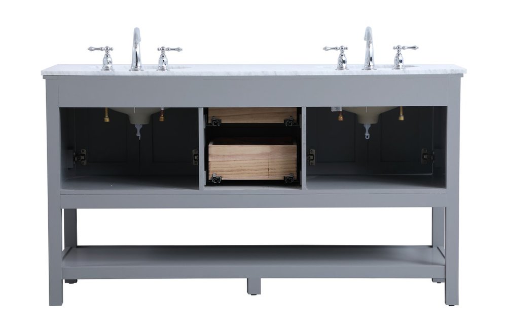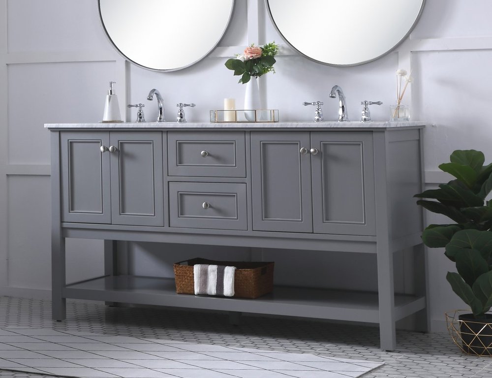 Create a refined and relaxing bath space with this contemporary design vanity, presenting its simplicity and clean straight lines in a minimalist appeal. This 60" freestanding vanity, crafted of solid poplar wood in a soft-grey finish, provides ample storage within its double center drawers and 4 side doors, all equipped with soft closing mechanism and accentuated with gleaming chrome hardware. Rounding out the design is a luxurious Itallian Carrara white marble countertop and double white porcelain under-mount oval sink.