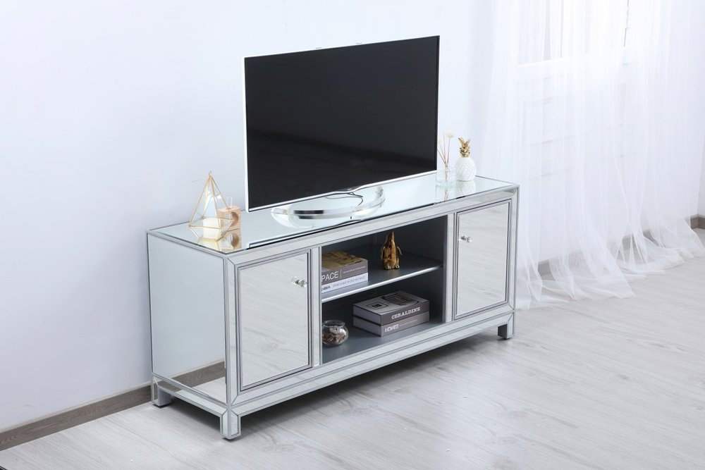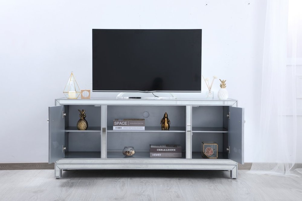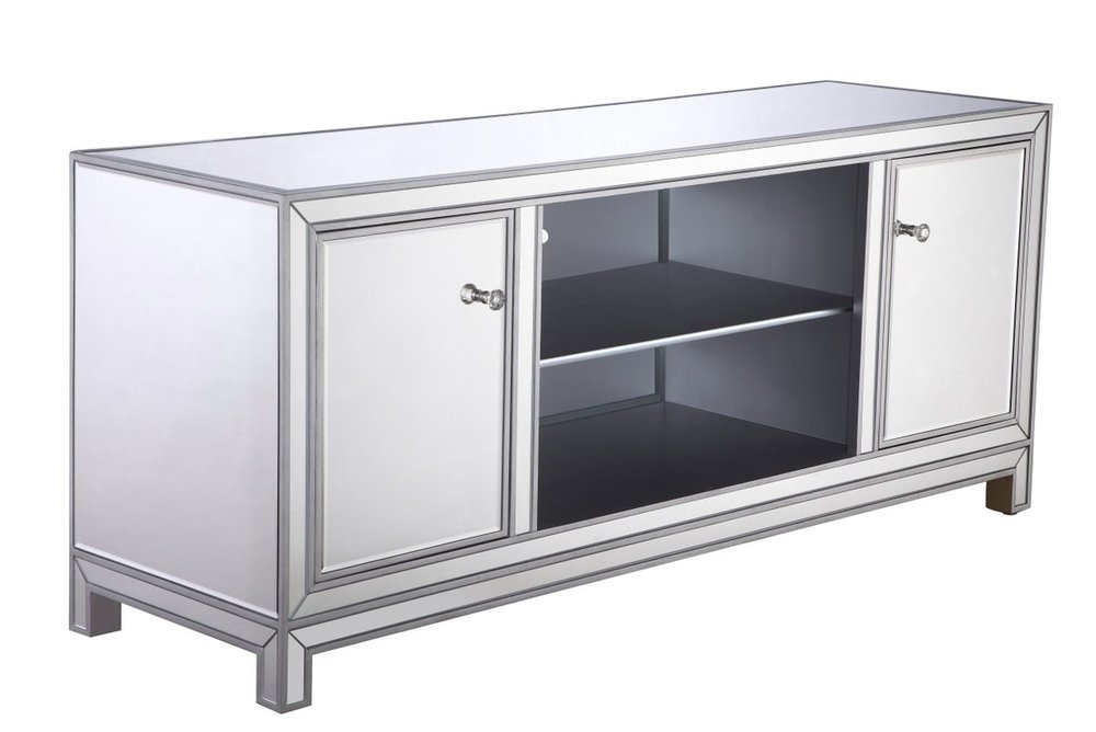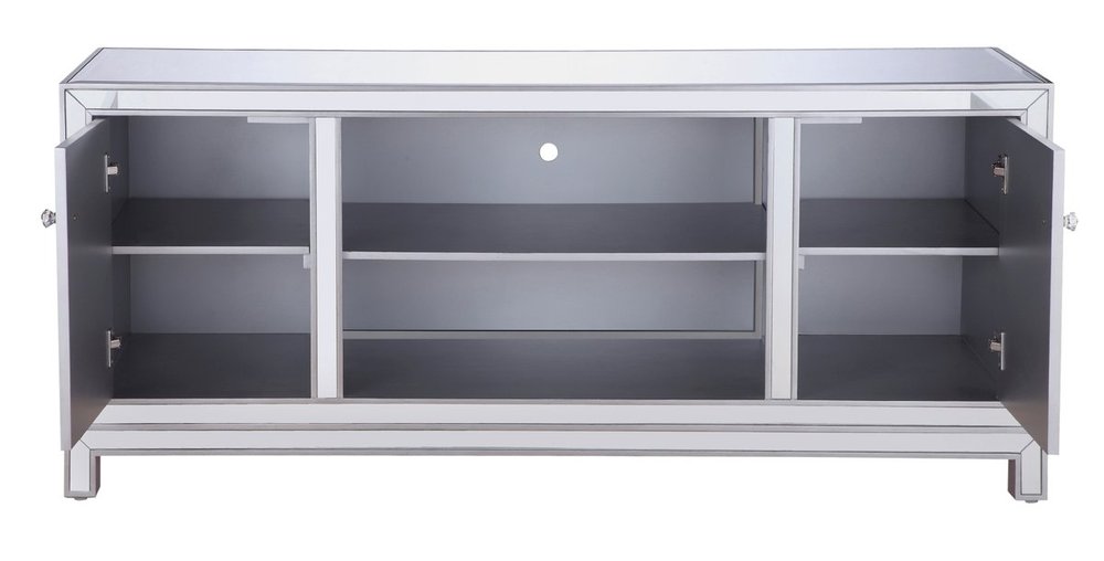 Sleek and vibrant, this contemporary media cabinet will make a striking statement in any room. The cabinet top can showcase up to a 60" flat screen TV at a perfect height, featuring top-quality mirror panel in hand-rubbed silver finish, square crystal knobs. Functional and chic, it features 2 soft-closing side doors, center opening and shelvings that provides plenty of storage for your equipment, games, and books.