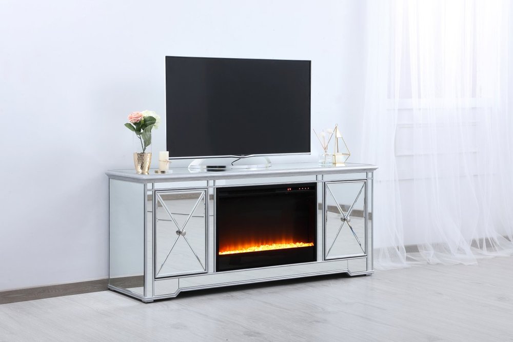 Sleek and vibrant, this classy media fireplace cabinet combo will make a striking statement in any room can showcase up to a 60" flat screen TV at a perfect height. Featuring gleaming criss-cross style mirror panel and hand-rubbed silver finish, brushed steel knobs. Functional and chic, with 2 soft-closing side doors. This includes the electric crystal fireplace insert that is easy to install into the cabinet. Beautiful crystals adorn the base of the fireplace. Set the mood with adjustable temperature and lighting settings.